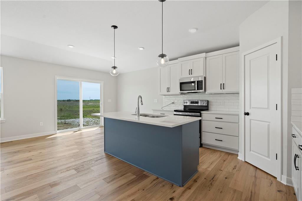 The “Harmony” plan by Avital Homes is available for quick move-in! Ask about the Builder's $20K Incentive Promo! Where the beauty of open-concept living meets the ease of single-story luxury. This 3-bedroom, 2-bath ranch plan welcomes you with an open staircase and seamlessly integrates spacious Living, Dining, and Kitchen areas for a harmonious living experience. This home will feature a cozy fireplace in the living room (not pictured) and the Dazzling & Devine professionally curated design package. The primary suite takes convenience to the next level, effortlessly connecting to the laundry room. Explore the option of adding an additional level of comfort with the lower-level finish, offering a spacious Rec Room, an extra bedroom, and bath. Experience the perfect blend of simplicity and sophistication in the art of harmonious living. Exterior photo is actual home. Interior photos are of a previously built home. Photos of actual interior coming soon! This home is nearly complete and features an upgrade laundry room floor tile and upgrade kitchen backsplash tiles. Stoney Creek HOA is only $640 annually and includes trash, recycling, planned social activities, clubhouse, 3 pools, walking trails, playground, volleyball and sidewalks adjacent to Osage Trails Park.