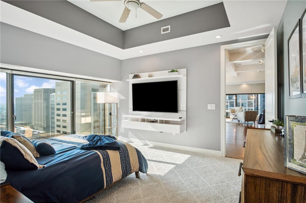 The most sought out Views in the building, 09 units rarely come on the market facing Southeast. Windows galore with natural light flowing in. All bath rooms have been renovated with new counter tops, floors and tile in the showers. New tiled fireplace and backsplash in kitchen. Harwood floors throughout living area and new carpet in both bedrooms and new paint throughout the unit. Enjoy the breathtaking city Views. Fantastic closet space, Large TV with custom tile stays in bedroom, open floor plan and convenient to everything! This building offers a rooftop pool, fitness center, theater, grilling area, 24 hour doorman and concierge, 2 secured parking spaces.