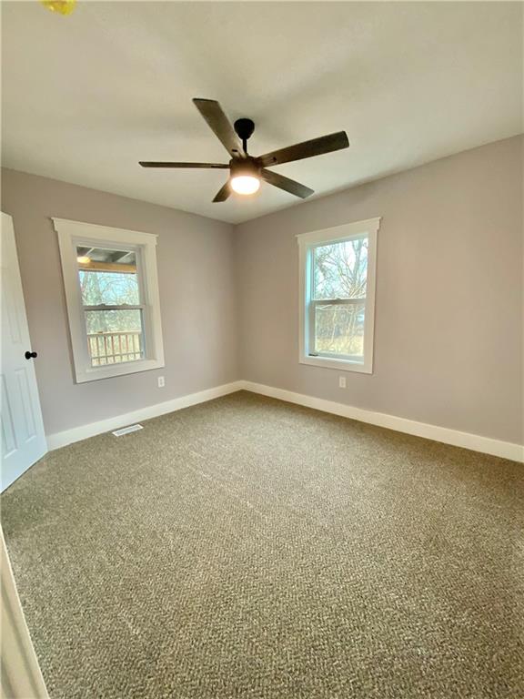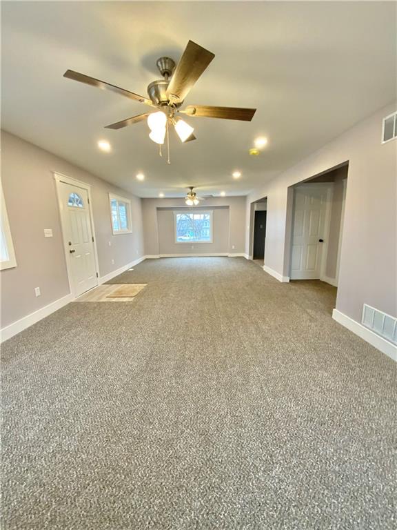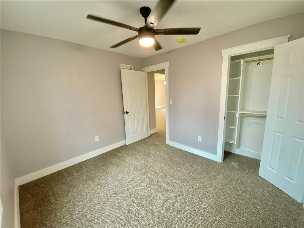 Unfurnished bedroom featuring carpet floors, ceiling fan, and a closet