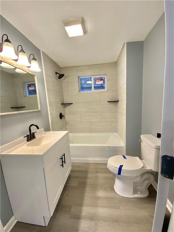 Full bathroom featuring toilet, tiled shower / bath, a textured ceiling, vanity, and hardwood / wood-style flooring