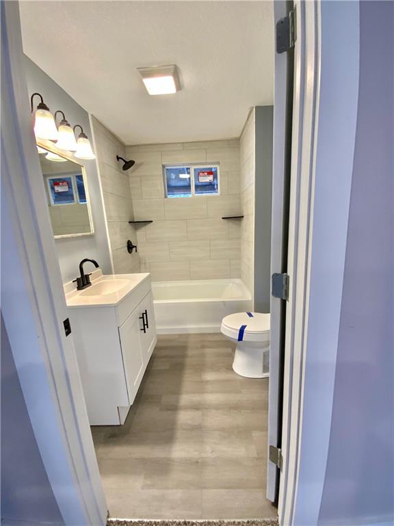 Full bathroom with hardwood / wood-style flooring, vanity, tiled shower / bath combo, and toilet