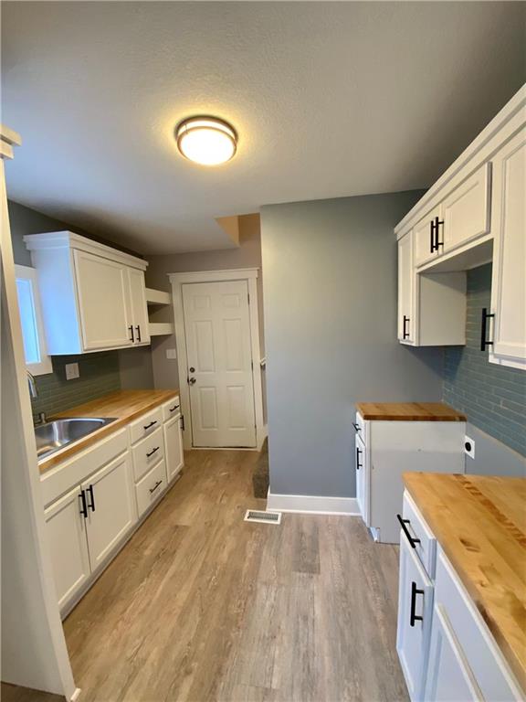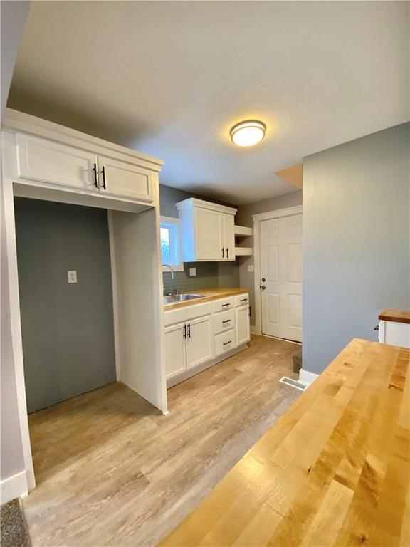 Kitchen featuring butcher block counters, sink, light hardwood / wood-style flooring, and white cabinets