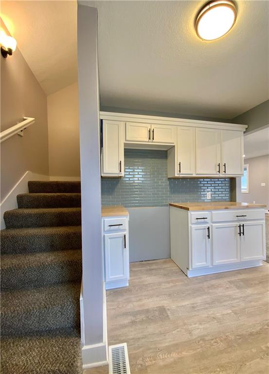 Kitchen featuring white cabinetry, tasteful backsplash, and light hardwood / wood-style flooring