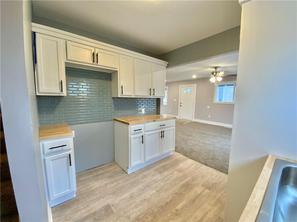 Kitchen with wood counters, light hardwood / wood-style flooring, white cabinets, ceiling fan, and backsplash