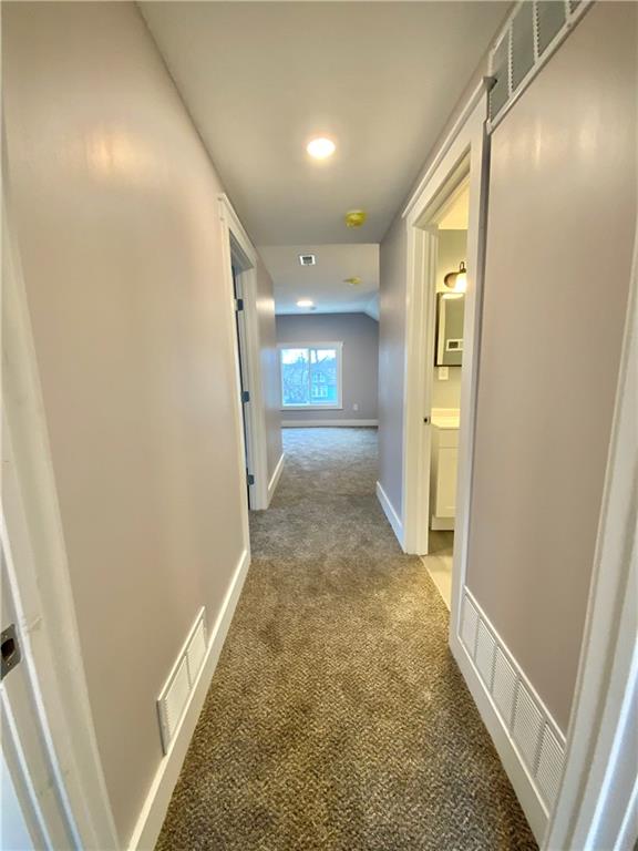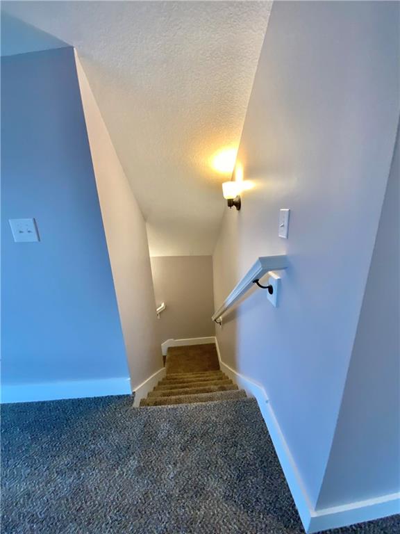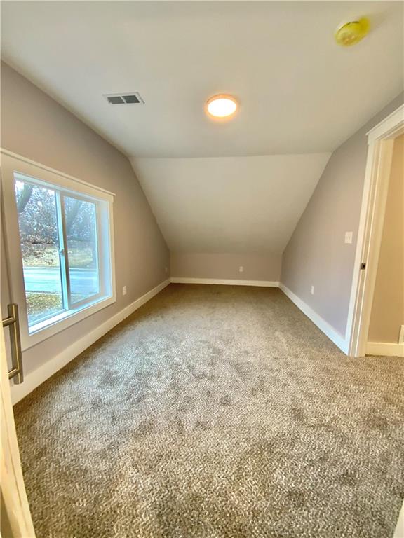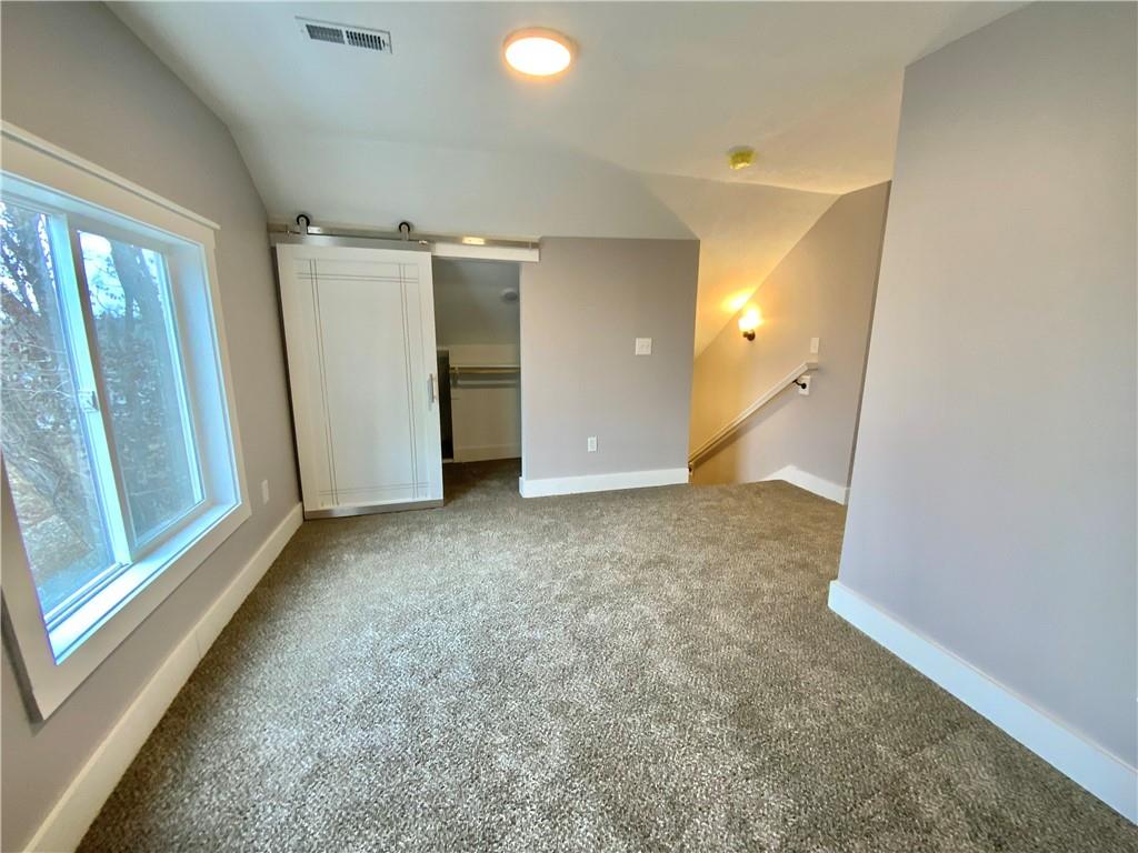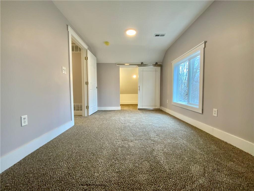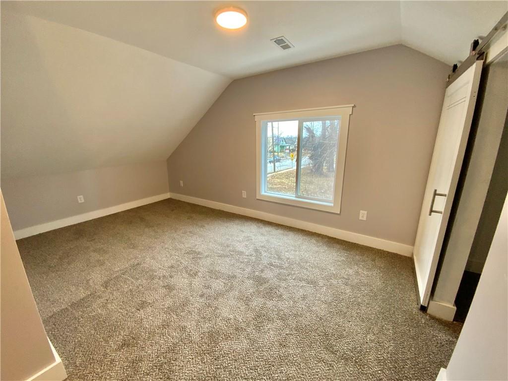 Additional living space featuring lofted ceiling, a barn door, and carpet flooring