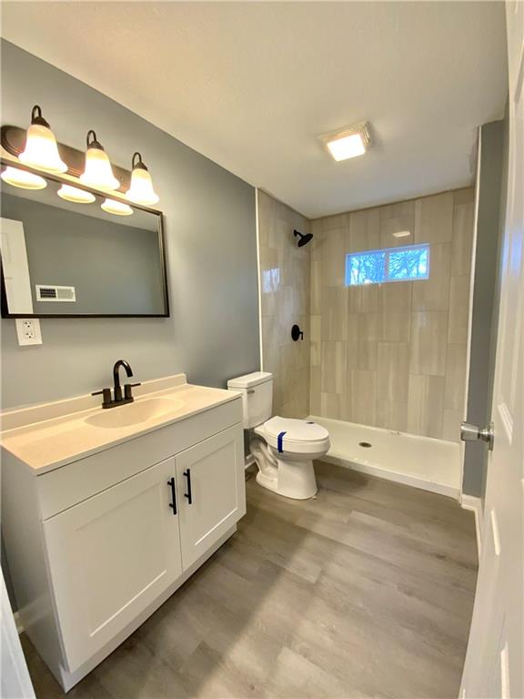 Bathroom with hardwood / wood-style flooring, vanity, tiled shower, and toilet