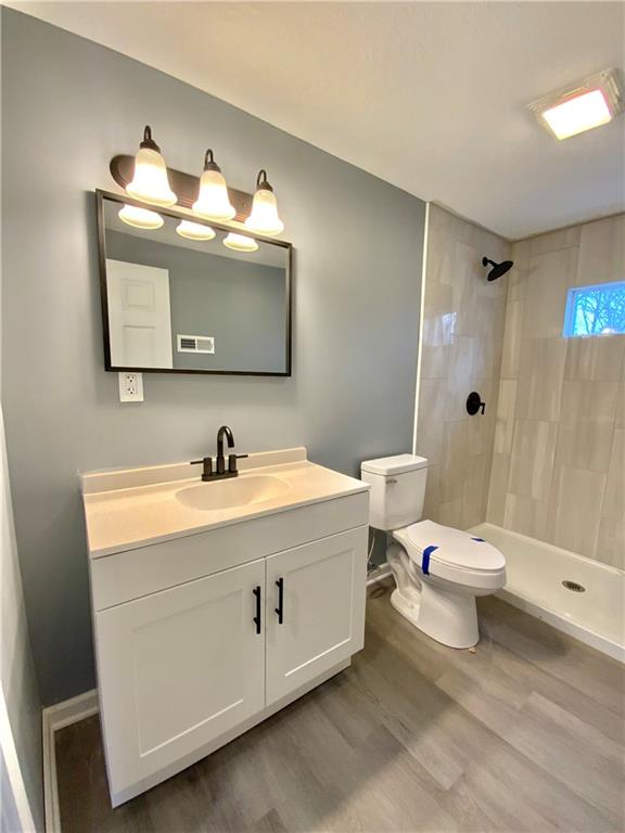 Bathroom with hardwood / wood-style flooring, tiled shower, vanity, and toilet