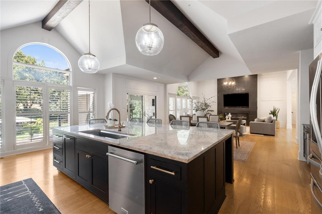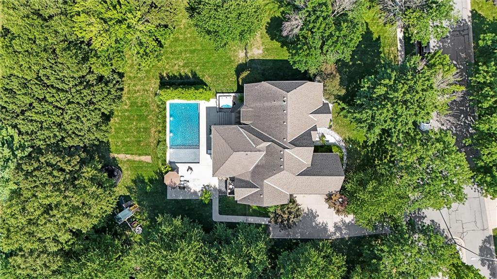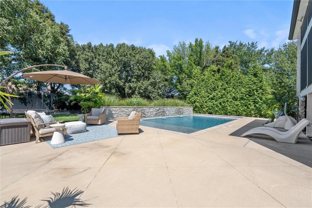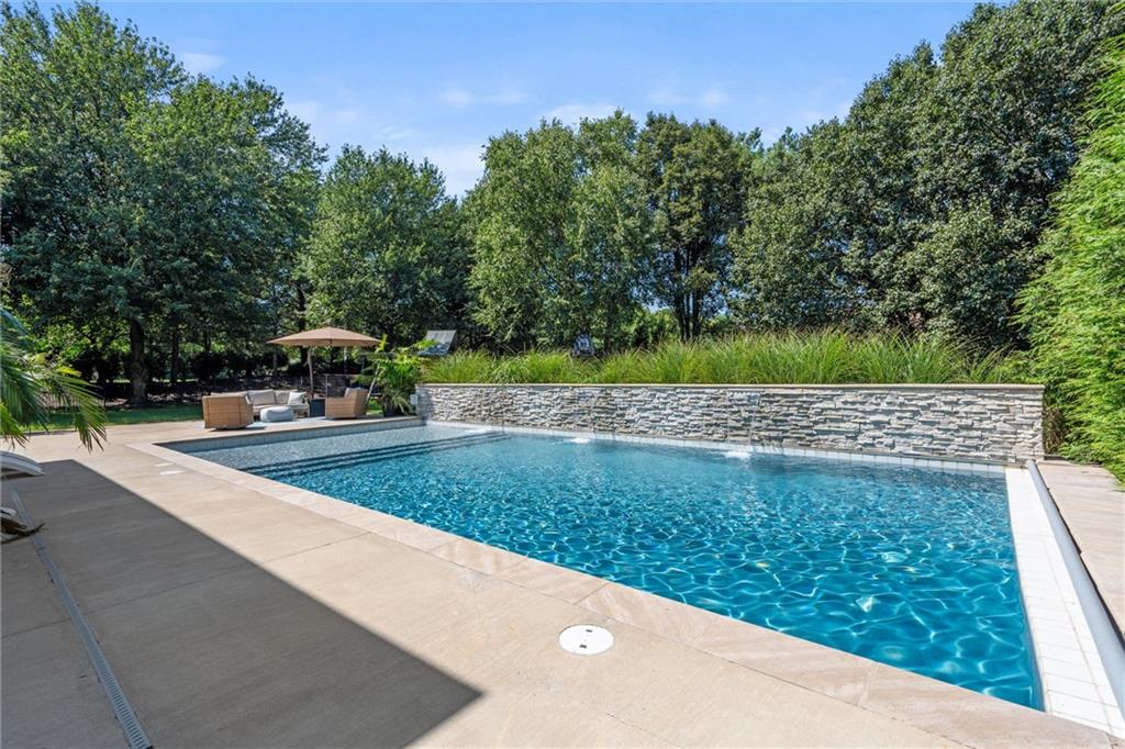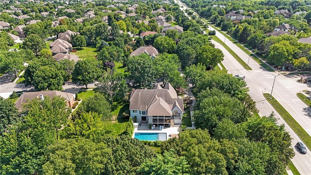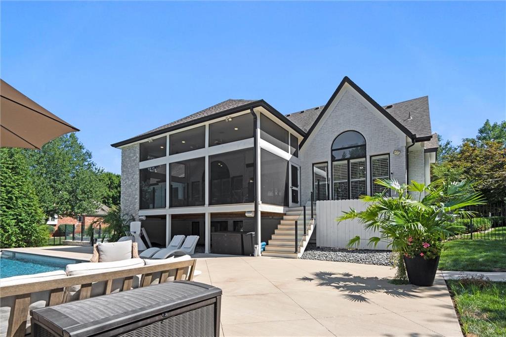Welcome to this exceptional completely renovated 1.5-story estate nestled on a private double lot with 1.25-acres in the coveted Whitehorse neighborhood. Meticulously renovated with no detail spared, this 4-bedroom, 4.5-bath home blends elegance with modern functionality and a stunning salt water, heated gunite pool. From the entry you’re greeted by an expansive open floor plan with hardwood floors and designer finishes throughout. The main level features a stunning gourmet kitchen with massive island, custom cabinets, walk-in pantry with built-ins, and an impressive wet bar—ideal for both everyday living and entertaining. The living room, flows into the screened-in back patio, complete with a fireplace and ceiling heaters for year-round enjoyment. This serene space overlooks the gorgeous pool with tranquil waterfall features, remote cover, and a shallow lounging area—perfect for soaking up the sun or letting kids splash and play. The surrounding landscaping adds to the private, lush atmosphere, making the entire backyard feel like a five-star escape. The main-level primary suite is a retreat of its own, offering a soaking tub, huge custom walk-in closet with built-ins, and laundry area for convenience. Office with glass French doors is tucked away off the entry for a functional yet quiet space to work from. Upstairs, you’ll find two spacious bedrooms, each with en suite bathrooms and ample closet space. The walk-out lower level is equally impressive—featuring a second full kitchen, expansive living area, fourth en suite bedroom, and a versatile bonus room perfect for a theater or playroom. A massive fitness room with floor-to-ceiling mirrors and custom built-in cabinets completes the space, making it a wellness lover’s dream, and just steps away from the walkout leading to your backyard oasis. Discover unmatched comfort, design, and privacy conveniently located minutes from restaurants, shoppings, Blue Valley Schools, and everything South Leawood has to offer!