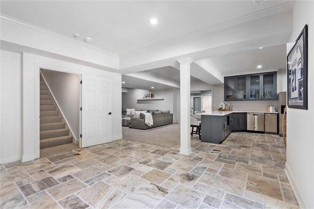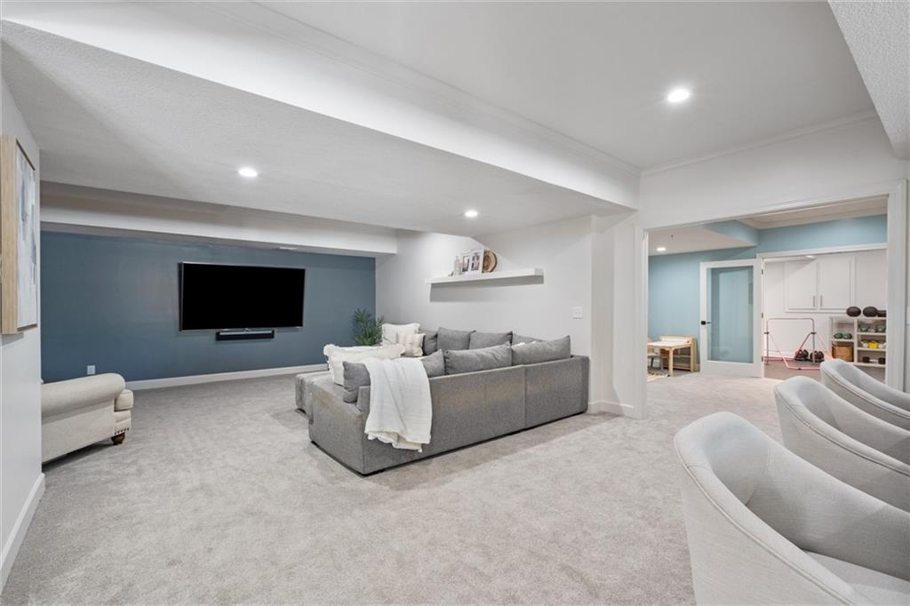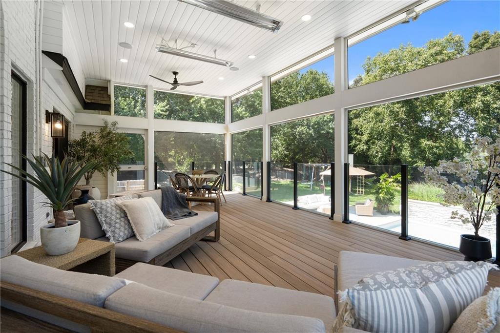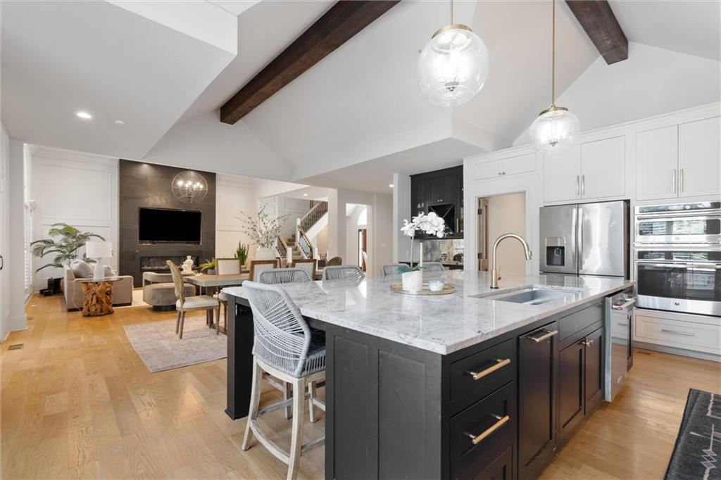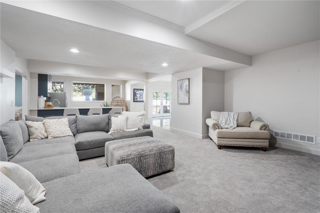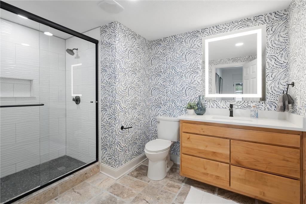 Welcome to this exceptional completely renovated 1.5-story estate nestled on a private double lot with 1.25-acres in the coveted Whitehorse neighborhood. Meticulously renovated with no detail spared, this 4-bedroom, 4.5-bath home blends elegance with modern functionality and a stunning salt water, heated gunite pool. From the entry you’re greeted by an expansive open floor plan with hardwood floors and designer finishes throughout. The main level features a stunning gourmet kitchen with massive island, custom cabinets, walk-in pantry with built-ins, and an impressive wet bar—ideal for both everyday living and entertaining. The living room, flows into the screened-in back patio, complete with a fireplace and ceiling heaters for year-round enjoyment. This serene space overlooks the gorgeous pool with tranquil waterfall features, remote cover, and a shallow lounging area—perfect for soaking up the sun or letting kids splash and play. The surrounding landscaping adds to the private, lush atmosphere, making the entire backyard feel like a five-star escape. The main-level primary suite is a retreat of its own, offering a soaking tub, huge custom walk-in closet with built-ins, and laundry area for convenience. Office with glass French doors is tucked away off the entry for a functional yet quiet space to work from. Upstairs, you’ll find two spacious bedrooms, each with en suite bathrooms and ample closet space. The walk-out lower level is equally impressive—featuring a second full kitchen, expansive living area, fourth en suite bedroom, and a versatile bonus room perfect for a theater or playroom. A massive fitness room with floor-to-ceiling mirrors and custom built-in cabinets completes the space, making it a wellness lover’s dream, and just steps away from the walkout leading to your backyard oasis. Discover unmatched comfort, design, and privacy conveniently located minutes from restaurants, shoppings, Blue Valley Schools, and everything South Leawood has to offer!