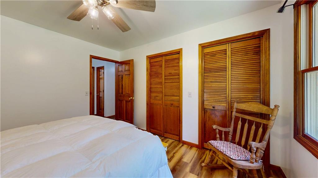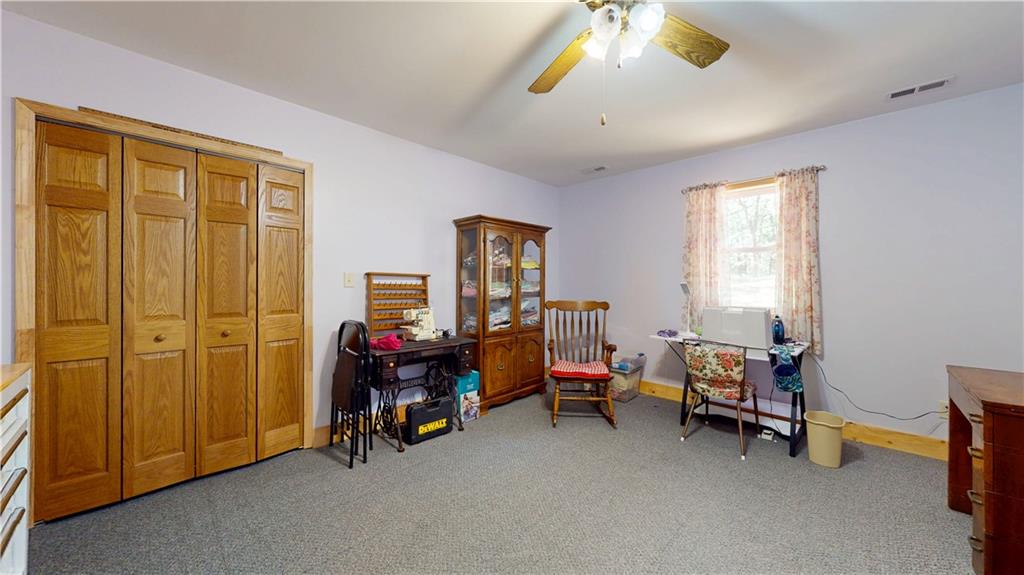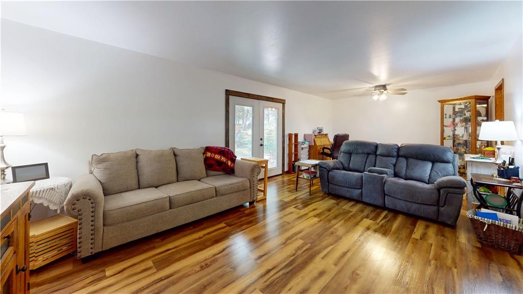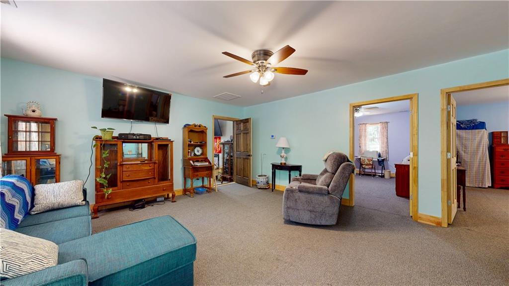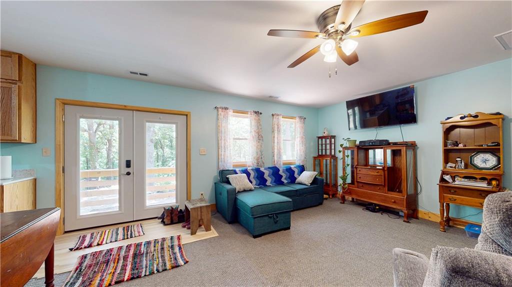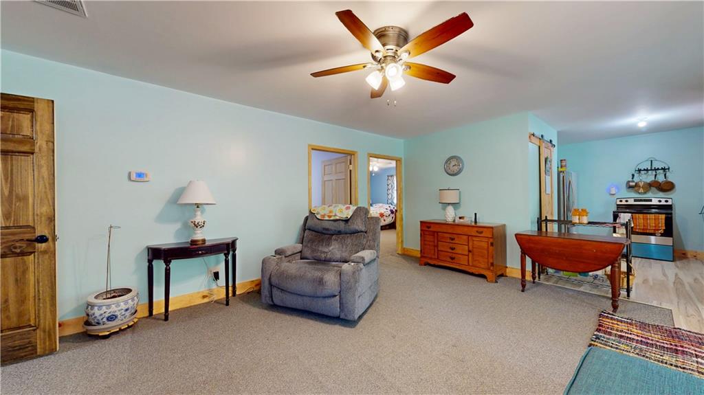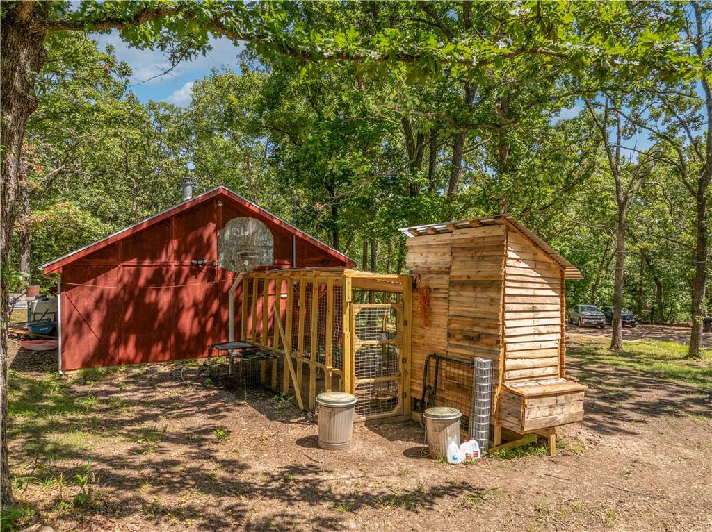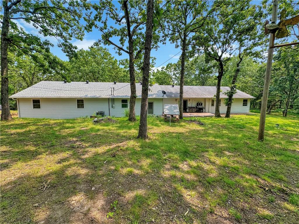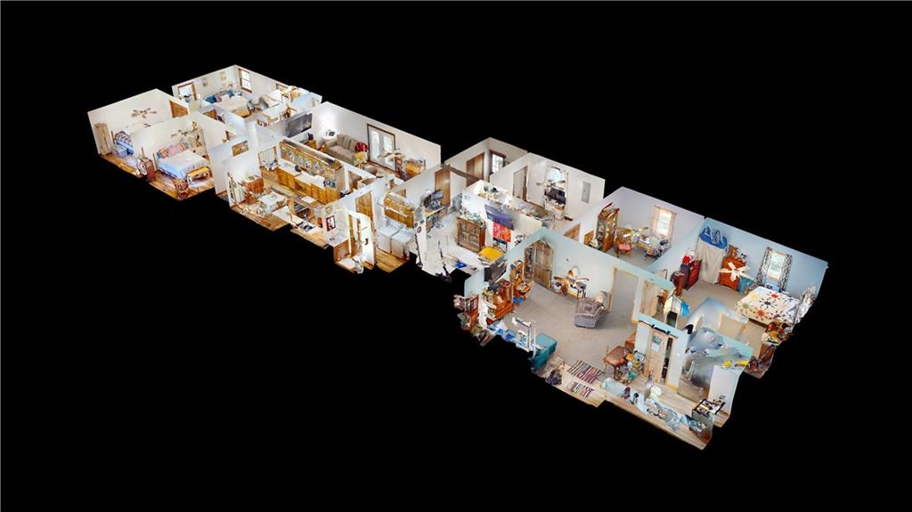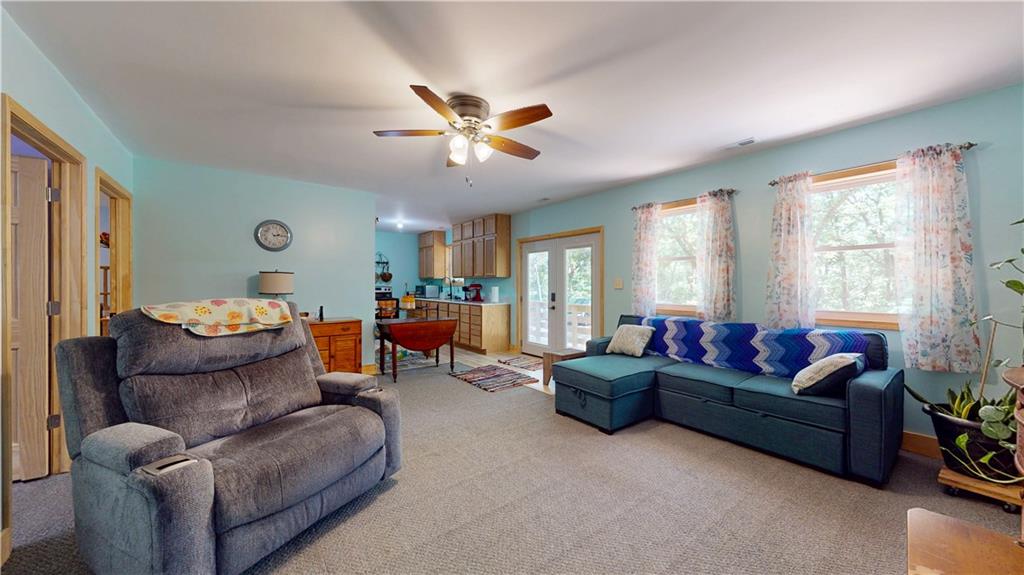 Nestled on a 22.99-acre lot with lush timber and wildlife, this ranch-style home offers privacy and convenience, minutes from downtown Warsaw, Lake of the Ozarks, and Truman Lake. It features dual living quarters on one floor, ideal for multi-generational living or guests. The original layout includes a cozy living room, 4 bedrooms, and 2.5 bathrooms. The large eat-in kitchen has ample cabinetry and a dining area with a bay window. A recent remodel added two bedrooms, a full bathroom, a family room, and a laundry room. The addition also includes a "Man Cave," walk-in pantry, and office/media room, with access to the crawl space, water heater, and water softener. Energy efficiency is highlighted with ground source heating and cooling in the original section and separate heating and AC in the remodeled attic. The home has a new roof and septic system for peace of mind. In total, the home offers 6 bedrooms, 3.5 bathrooms, 2 kitchens, 3 living areas, a pantry, and 2 dining areas. The detached garage/shop measures 24' x 36', with heat, and 220 service. The property also includes a chicken house and pen, and a rabbit house, perfect for nature enthusiasts and animal lovers.