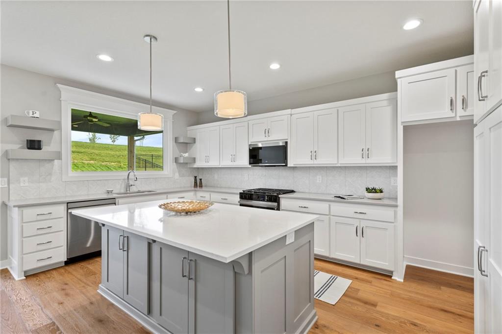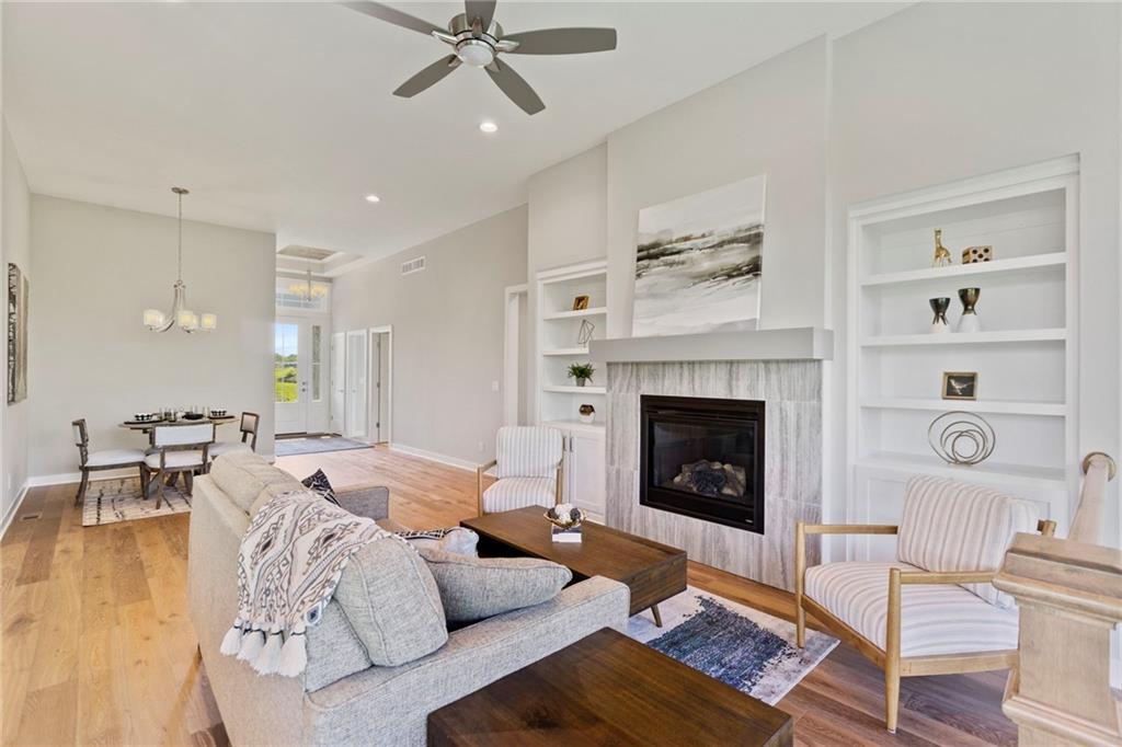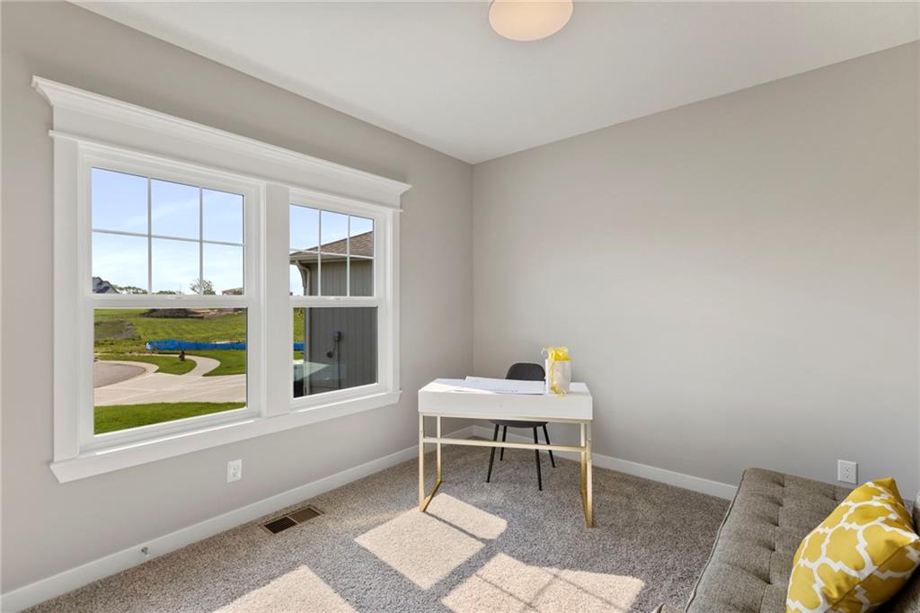 **Last opportunity for a Patriot Home in Cadence Villas! This home is finished.** Resize your living space with ease and enjoy the benefits of maintenance provided living in the Truman by Patriot Homes! Located on a secluded cul-de-sac homesite, this Reverse 1.5-story open concept floor plan includes a stone-clad traditional façade, three-car garage, and covered front porch. The 8-foot front door leads into a spacious entry with a 12-foot ceiling highlighted by an elegant trim treatment and chandelier. Hardwood flooring throughout the main entry, living and kitchen accentuates the seamless flow between the dining room, kitchen, and great room while a bedroom and full bathroom just off the entry makes for an ideal guest or bonus room. Arguably the showpiece of the home, the kitchen is outfitted with expansive quartz countertops, large center island, shaker style custom cabinetry, and stainless steel Samsung appliances. Opposite the kitchen is a cozy great room with a gas fireplace, built-in bookshelves, floor-to-ceiling windows, and an 8-foot sliding glass door that opens to a covered patio. A private hallway leads to the master suite showcasing an exquisite freestanding soaker tub, zero entry walk-in shower, Bluetooth audio system, and a sizeable walk-in closet with third tier pull down rods. The Truman comes equipped with additional conveniences such as 8-foot tall garage doors with an included belt drive opener on main door, an irrigation system, high efficiency 96% Lennox furnace, whole house humidifier, and 50-gallon electric water heater. **This home is under construction. Photos and are simulated and of another completed home. Colors, finishes, features, and/or building materials in the actual home may vary from those shown.** Homeowners also have an annual HOA fee of $600. This villa is in Phase 1, Cadence Villas, a Hunt Midwest Maintenance Provided Community