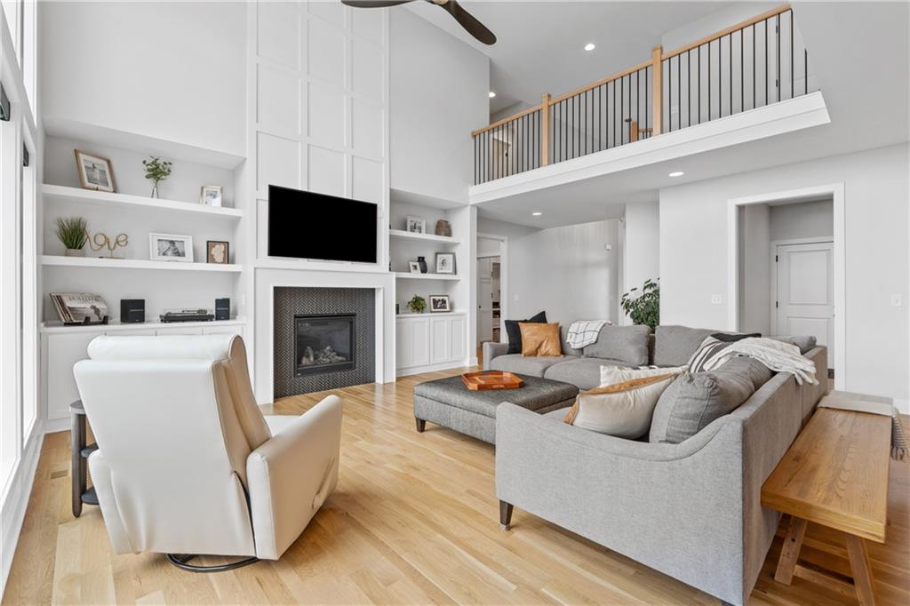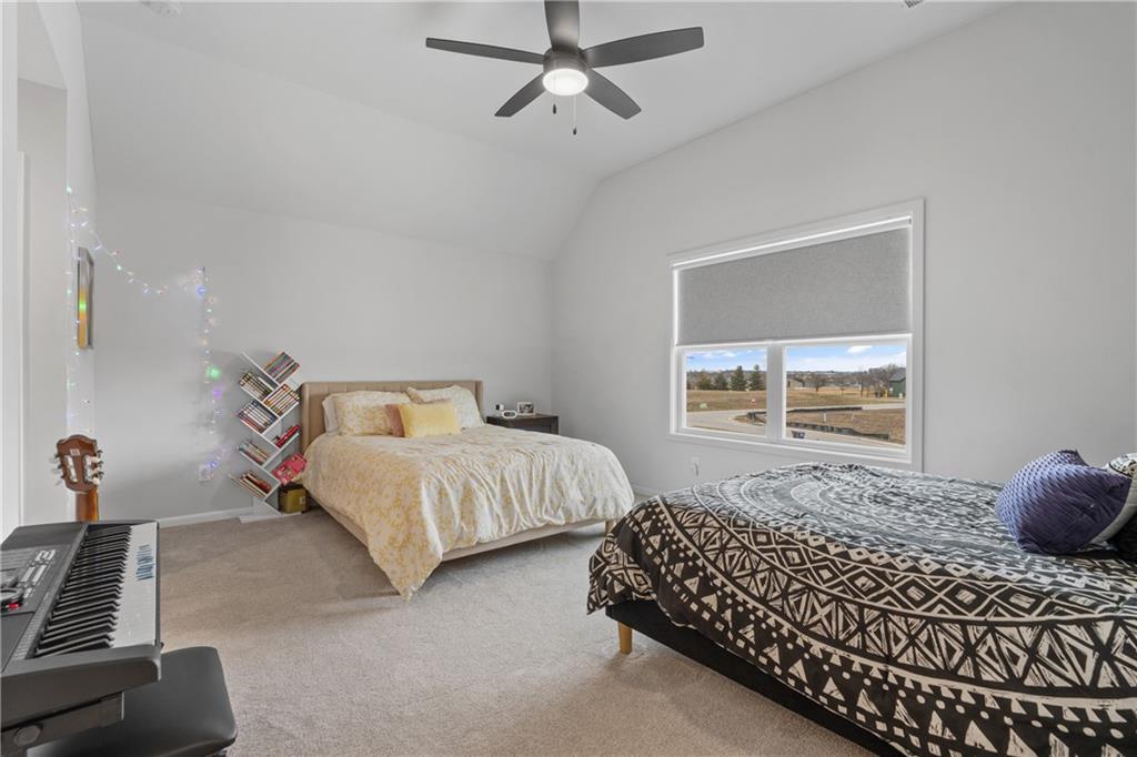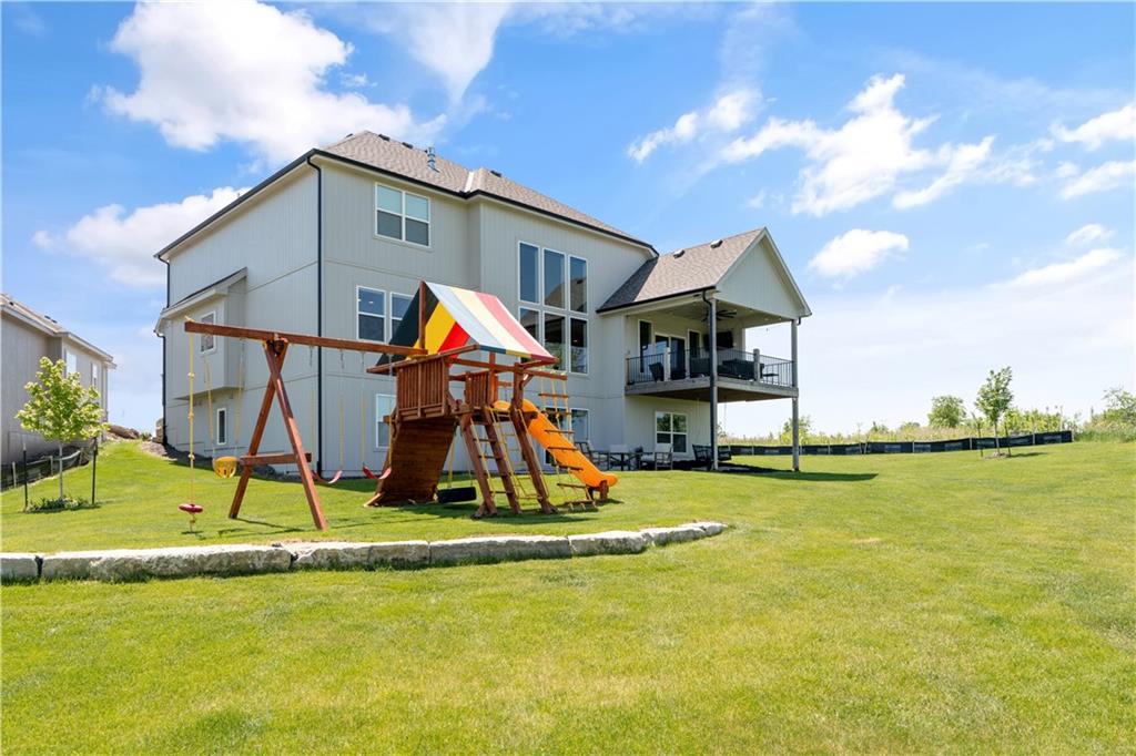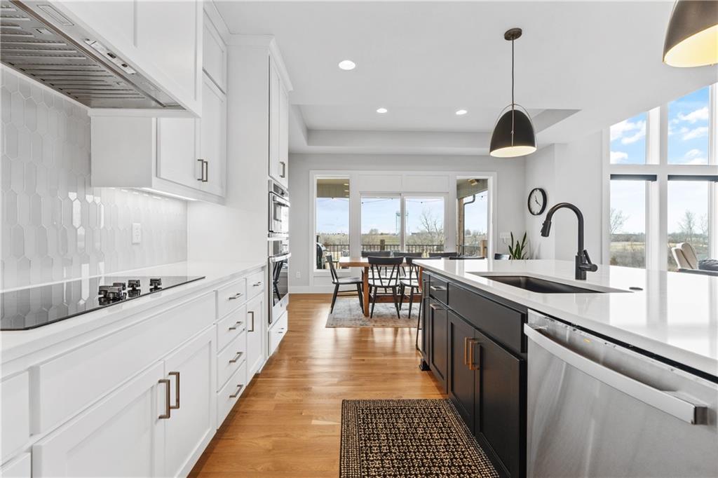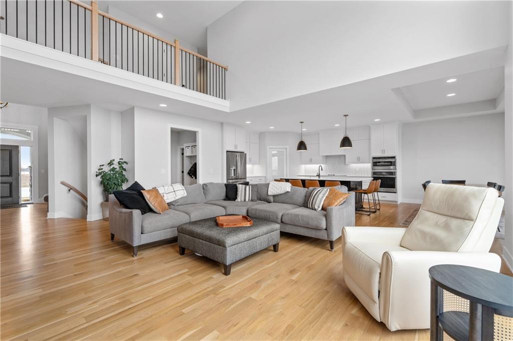 No detail spared in this stunning, like-new 1.5-story home nestled at the end of a quiet cul-de-sac. As you enter, a curved staircase greets you, leading into the Great Room that’s designed to captivate with its vaulted ceilings, floor to ceiling windows and a cozy fireplace with surrounding built-ins. Every detail has been meticulously crafted with premium upgrades including hardwood floors, dual HVAC systems, a tankless water heater and room expansions including the kitchen, deck, garage, primary suite and four second level bedrooms. The chef-inspired kitchen features high-end cabinetry, top-tier stainless steel appliances, a walk-in pantry with a coffee bar, and an oversized kitchen island with ample breakfast bar seating. The luxurious primary suite offers heated floors, double vanities, a soaking tub, and a large walk-in closet with custom shelving that is conveniently connected to the laundry room. The finished walkout basement is the perfect entertainment hub with a large recreation room, a wet bar with floating shelves and space for a full-sized fridge, sixth bedroom and a full bath. Enjoy breathtaking sunsets overlooking the 15th hole of the Falcon Lakes golf course from the covered deck or large patio. Falcon Lakes offers a golf course, swimming pool, tennis and basketball courts, playground, trails, and BBQ pavilion. Conveniently located, just minutes from Legends Shopping Center, KansasSpeedway, Sporting KC, and downtown Kansas City. Schedule your showing today!