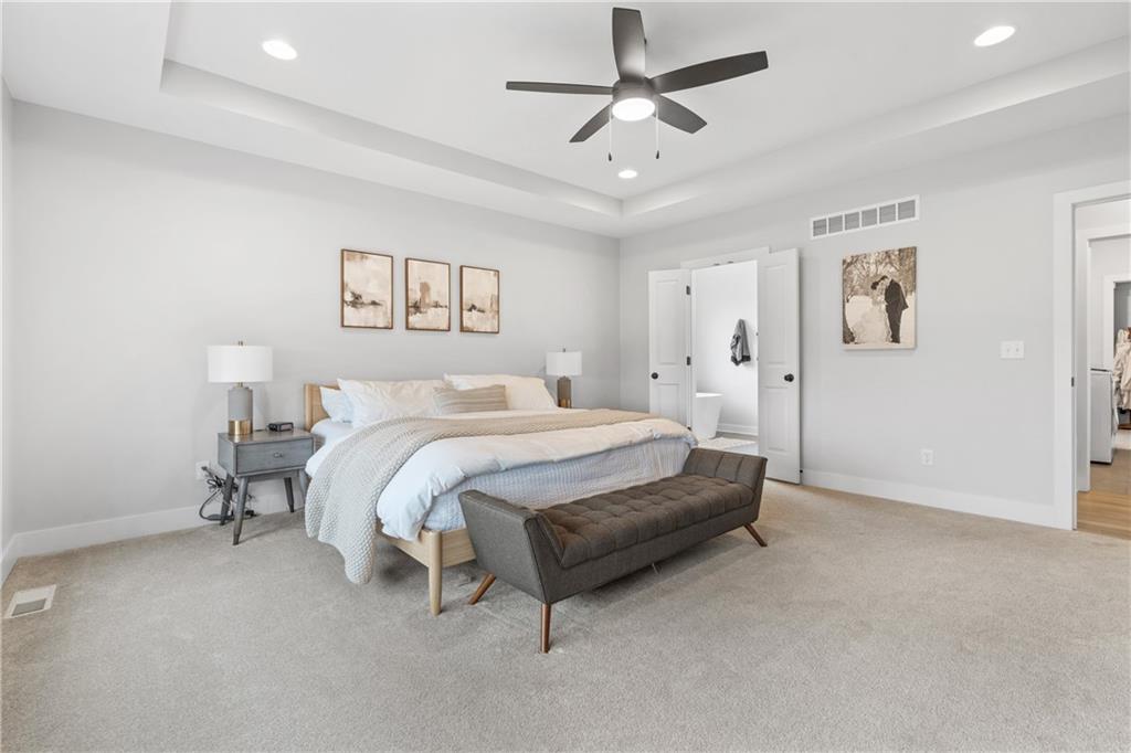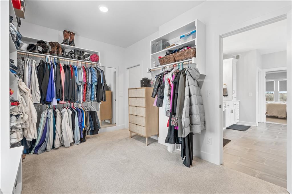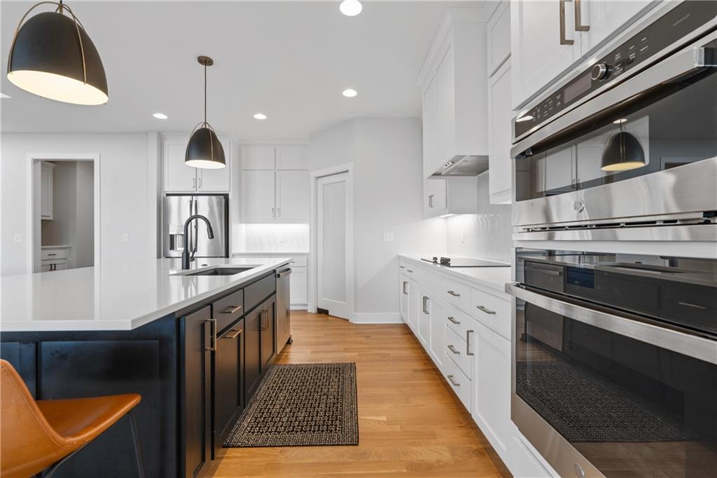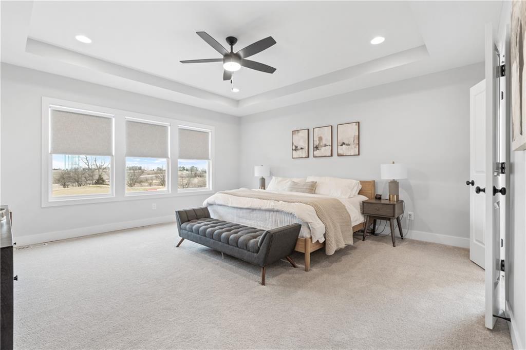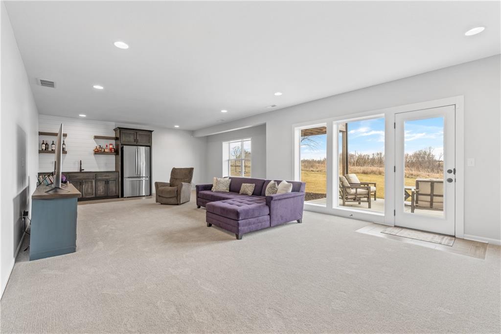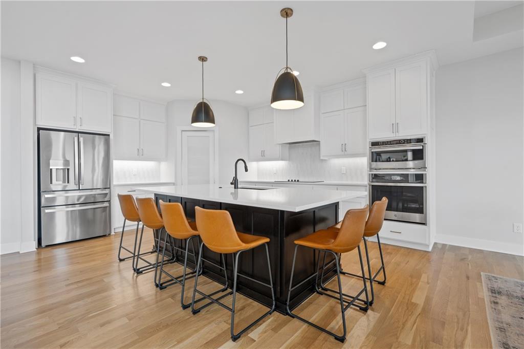 No detail spared in this stunning, like-new 1.5-story home nestled at the end of a quiet cul-de-sac. As you enter, a curved staircase greets you, leading into the Great Room that’s designed to captivate with its vaulted ceilings, floor to ceiling windows and a cozy fireplace with surrounding built-ins. Every detail has been meticulously crafted with premium upgrades including hardwood floors, dual HVAC systems, a tankless water heater and room expansions including the kitchen, deck, garage, primary suite and four second level bedrooms. The chef-inspired kitchen features high-end cabinetry, top-tier stainless steel appliances, a walk-in pantry with a coffee bar, and an oversized kitchen island with ample breakfast bar seating. The luxurious primary suite offers heated floors, double vanities, a soaking tub, and a large walk-in closet with custom shelving that is conveniently connected to the laundry room. The finished walkout basement is the perfect entertainment hub with a large recreation room, a wet bar with floating shelves and space for a full-sized fridge, sixth bedroom and a full bath. Enjoy breathtaking sunsets overlooking the 15th hole of the Falcon Lakes golf course from the covered deck or large patio. Falcon Lakes offers a golf course, swimming pool, tennis and basketball courts, playground, trails, and BBQ pavilion. Conveniently located, just minutes from Legends Shopping Center, KansasSpeedway, Sporting KC, and downtown Kansas City. Schedule your showing today!