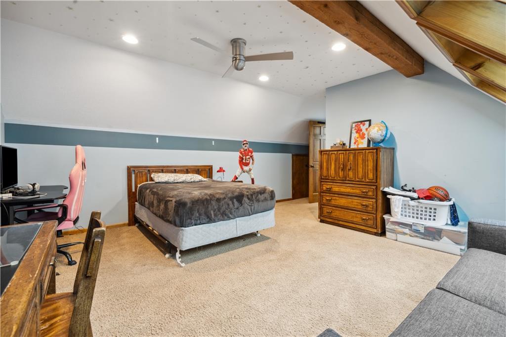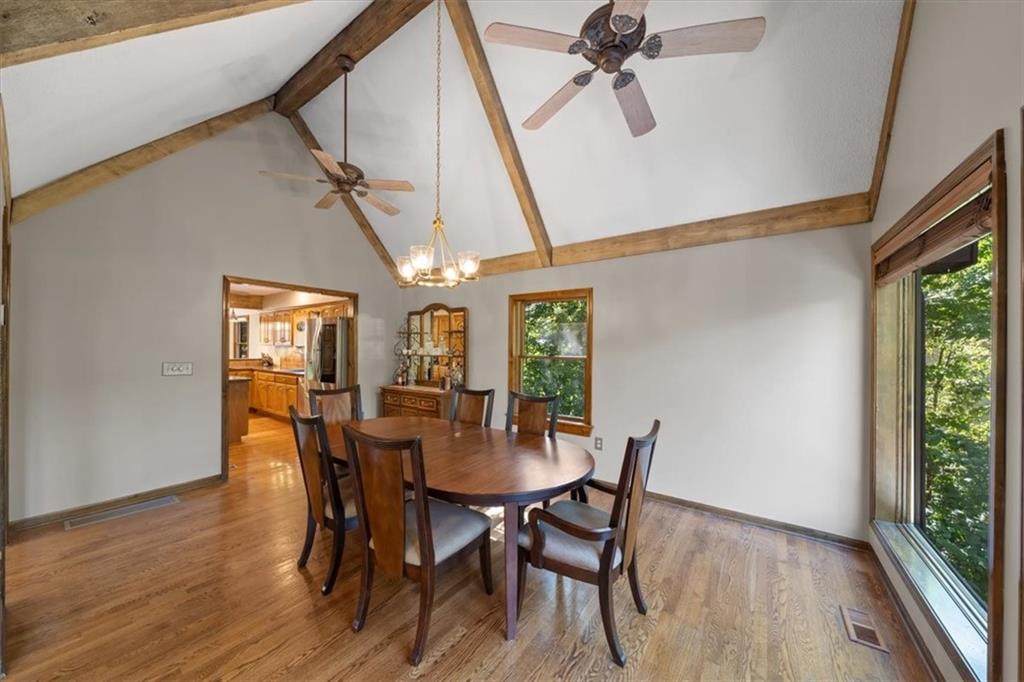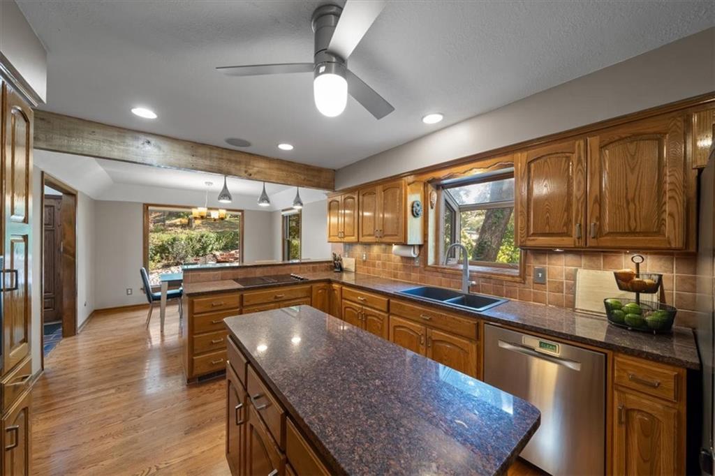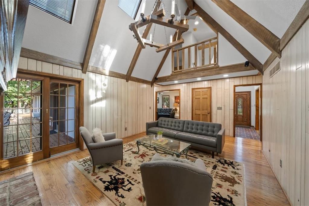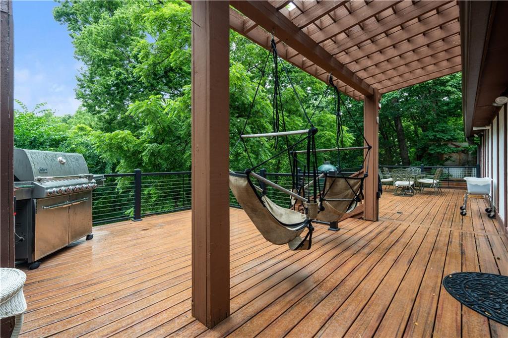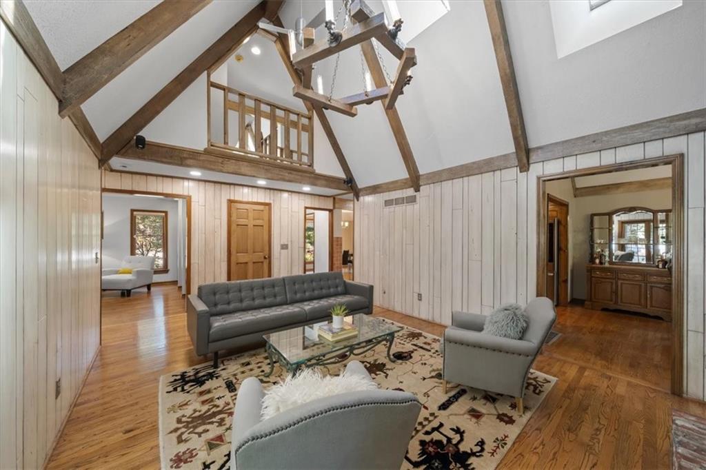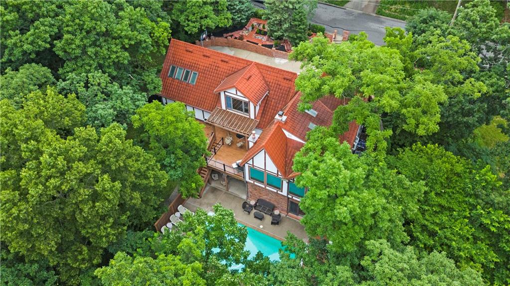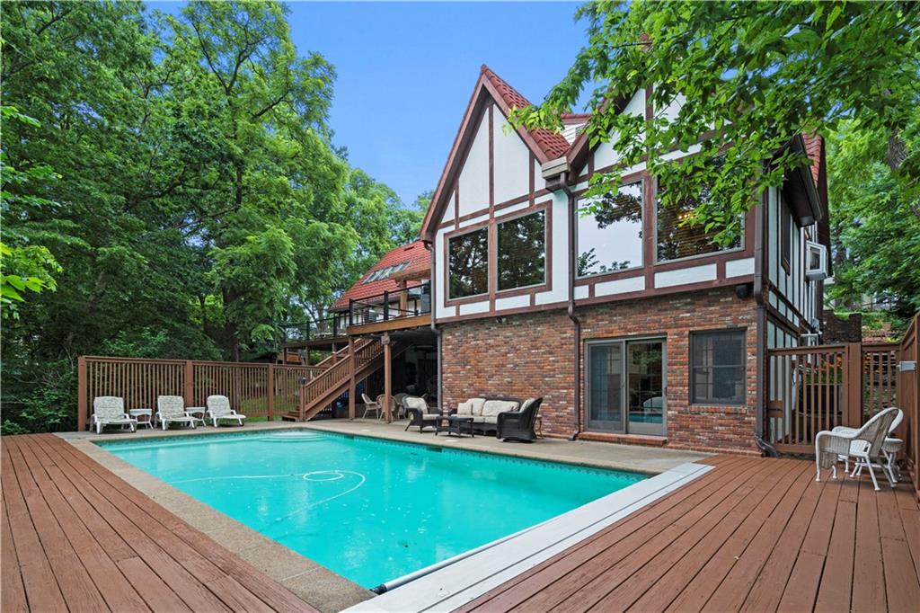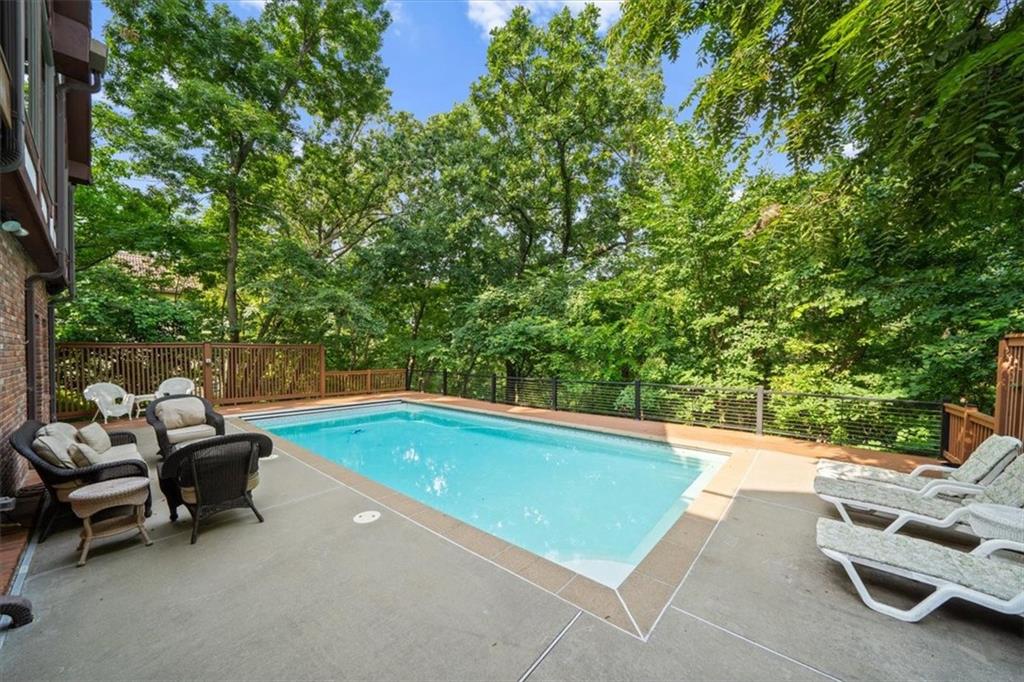 NOW INCLUDES ADJACENT LOT - NEARLY 1 ACRE IN SHAWNEE! Here’s your chance to own something truly special—nestled in nature’s beauty yet just minutes from downtown Shawnee! This custom-built 5-bedroom home sits on nearly an acre and offers beautiful curb appeal, extensive landscaping, and exceptional design throughout. The main level features a stunning great room with open-beam cathedral ceilings and a dramatic floor-to-ceiling fireplace, a main-level primary suite, and a spacious, fully equipped kitchen with a breakfast room, island, and eating bar. Additional highlights include a vaulted formal dining room, a flexible den/family room/office, and a light-filled sitting room overlooking the pool and sunsets. Wood floors and picture windows enhance much of the main level, bringing in warmth and natural light. Upstairs, you’ll find three generous bedrooms, a full bath, skylights, and abundant storage. The finished lower level is ideal for entertaining or relaxing, featuring a cozy fireplace, rec room, full bath, laundry area, workshop, and a fifth bedroom with a wet bar/kitchenette—perfect as a pool house or guest suite. Step outside from either the living room or primary suite to enjoy an al fresco meal on the low-maintenance deck, splash in the in-ground pool, sunbathe on the patio, or unwind on the tiered covered terrace. Dive into your private pool or take a refreshing swim in the lake—welcome to Black Swan, a hidden gem of a private lake community.