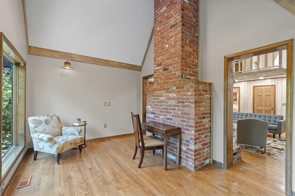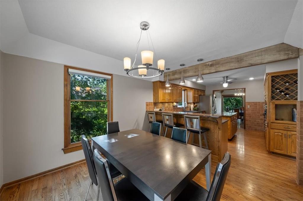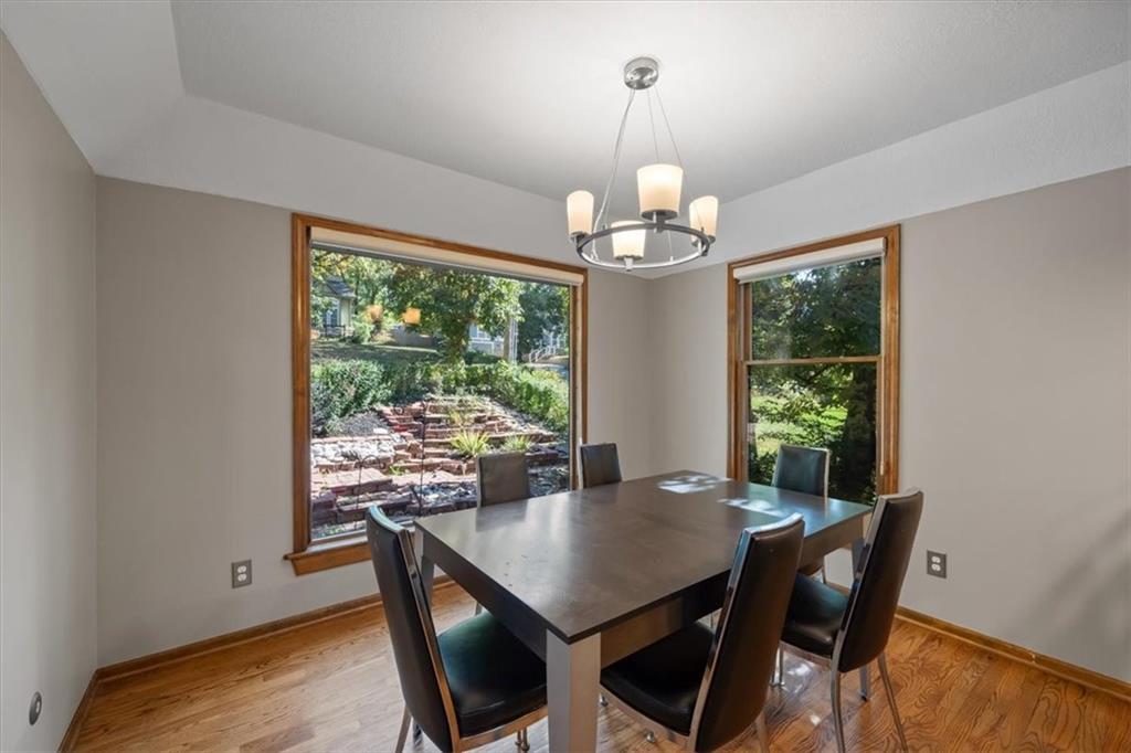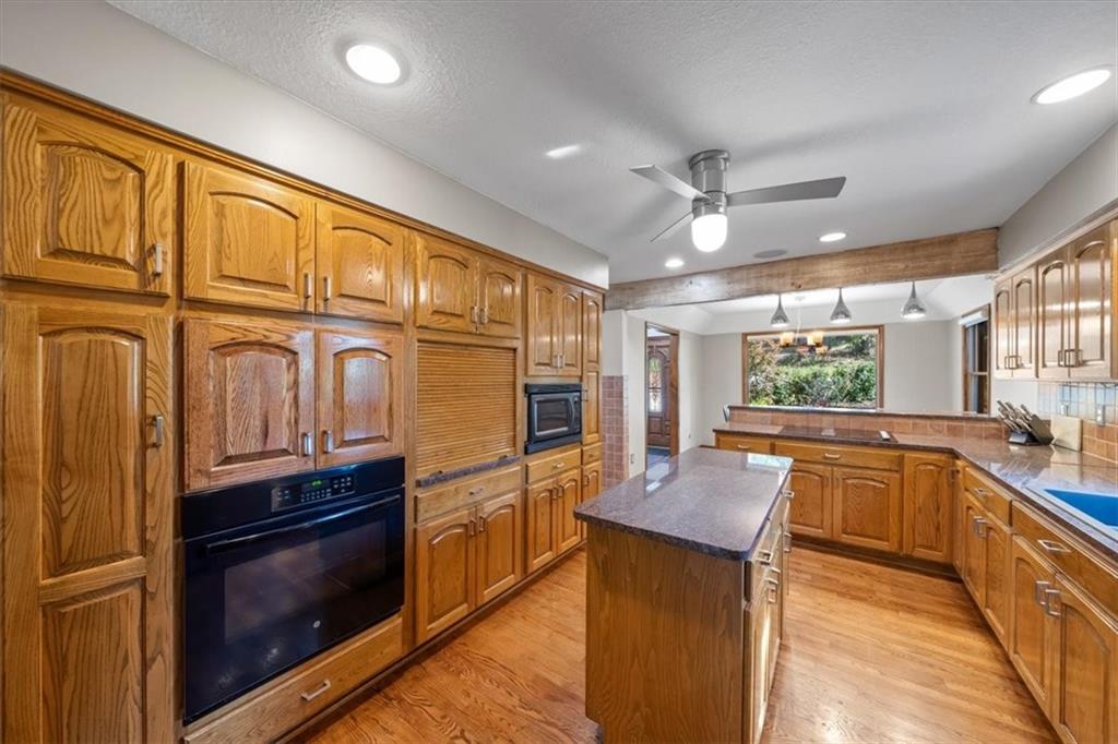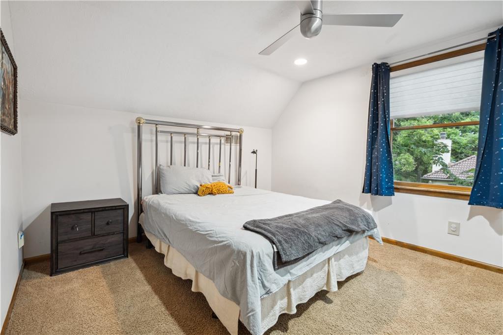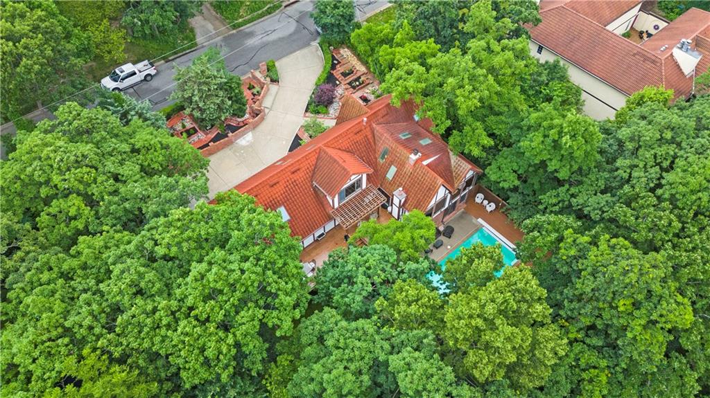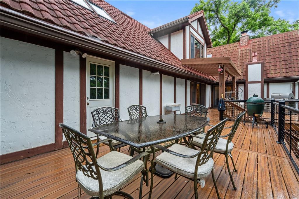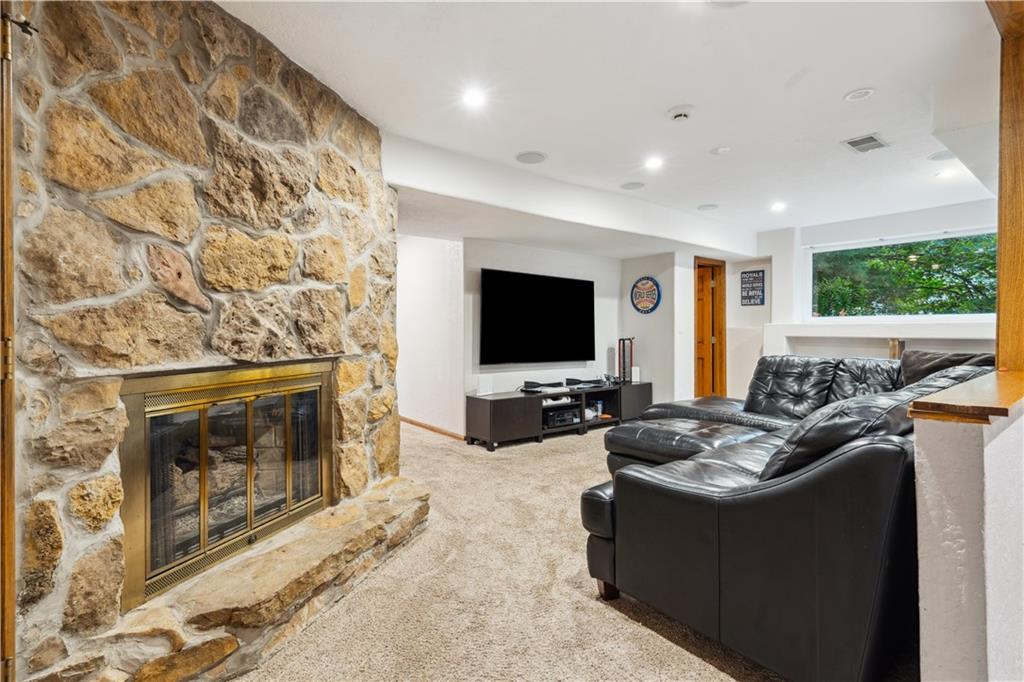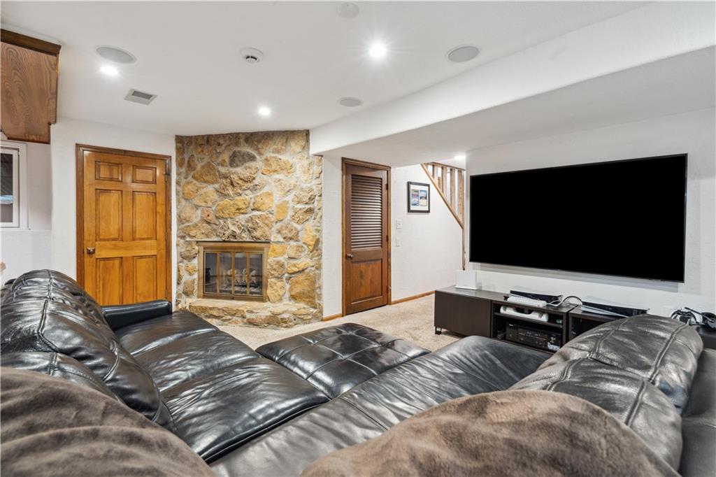 NOW INCLUDES ADJACENT LOT - NEARLY 1 ACRE IN SHAWNEE! Here’s your chance to own something truly special—nestled in nature’s beauty yet just minutes from downtown Shawnee! This custom-built 5-bedroom home sits on nearly an acre and offers beautiful curb appeal, extensive landscaping, and exceptional design throughout. The main level features a stunning great room with open-beam cathedral ceilings and a dramatic floor-to-ceiling fireplace, a main-level primary suite, and a spacious, fully equipped kitchen with a breakfast room, island, and eating bar. Additional highlights include a vaulted formal dining room, a flexible den/family room/office, and a light-filled sitting room overlooking the pool and sunsets. Wood floors and picture windows enhance much of the main level, bringing in warmth and natural light. Upstairs, you’ll find three generous bedrooms, a full bath, skylights, and abundant storage. The finished lower level is ideal for entertaining or relaxing, featuring a cozy fireplace, rec room, full bath, laundry area, workshop, and a fifth bedroom with a wet bar/kitchenette—perfect as a pool house or guest suite. Step outside from either the living room or primary suite to enjoy an al fresco meal on the low-maintenance deck, splash in the in-ground pool, sunbathe on the patio, or unwind on the tiered covered terrace. Dive into your private pool or take a refreshing swim in the lake—welcome to Black Swan, a hidden gem of a private lake community.
