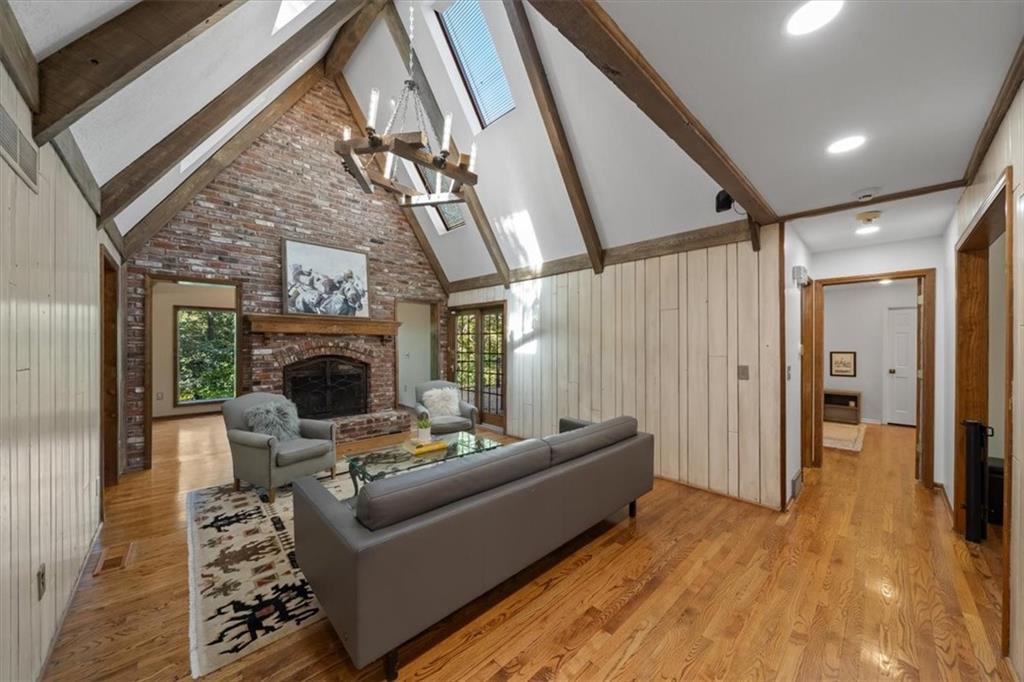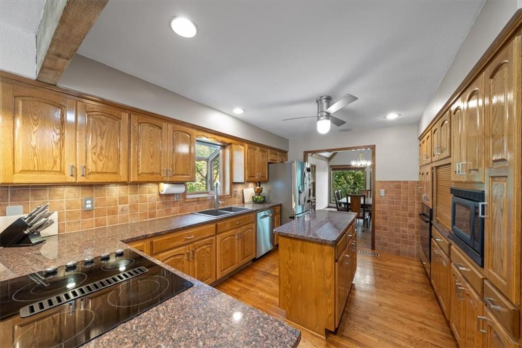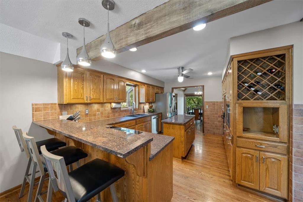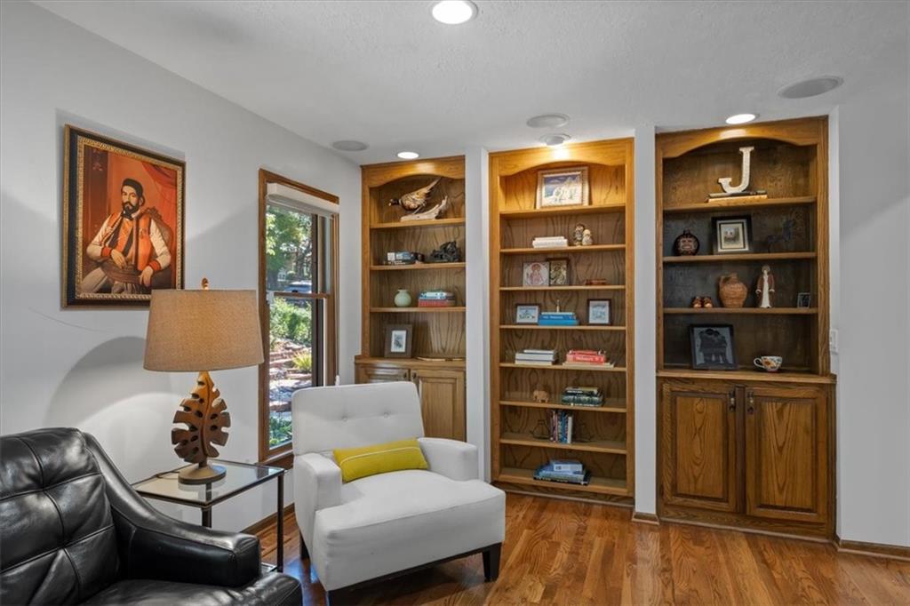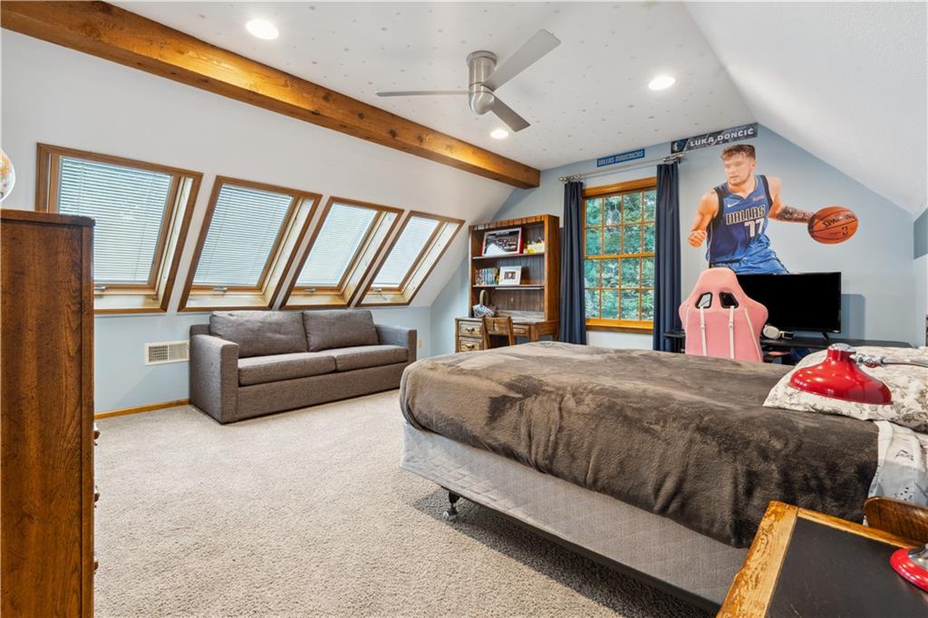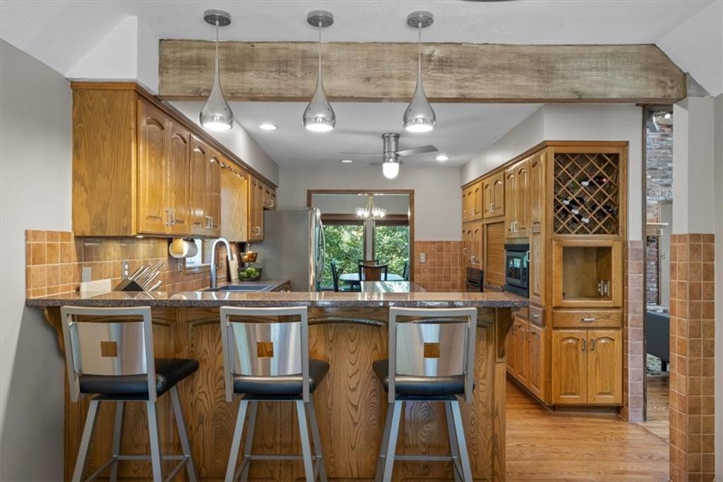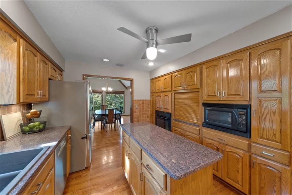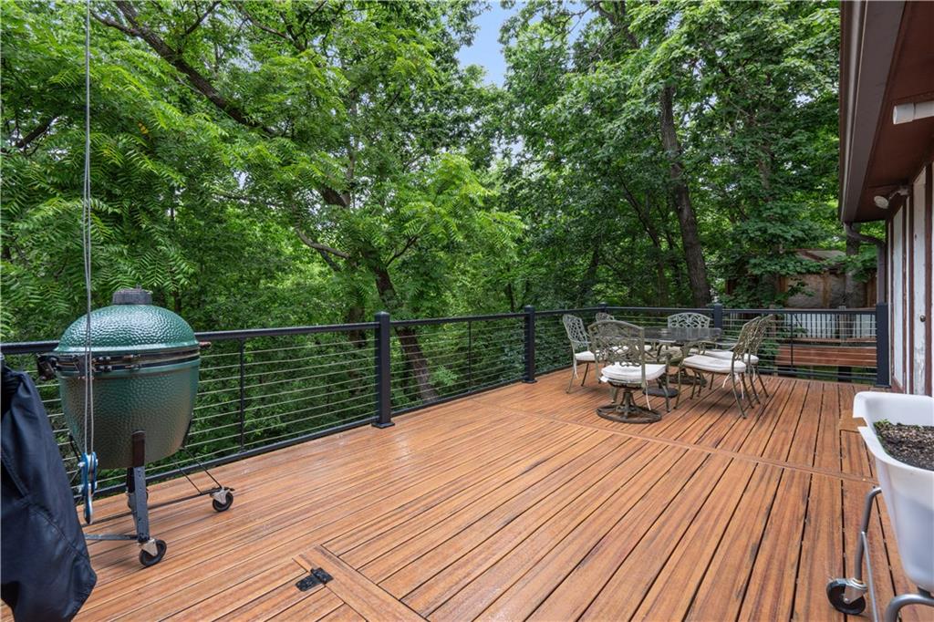 NOW INCLUDES ADJACENT LOT - NEARLY 1 ACRE IN SHAWNEE! Here’s your chance to own something truly special—nestled in nature’s beauty yet just minutes from downtown Shawnee! This custom-built 5-bedroom home sits on nearly an acre and offers beautiful curb appeal, extensive landscaping, and exceptional design throughout. The main level features a stunning great room with open-beam cathedral ceilings and a dramatic floor-to-ceiling fireplace, a main-level primary suite, and a spacious, fully equipped kitchen with a breakfast room, island, and eating bar. Additional highlights include a vaulted formal dining room, a flexible den/family room/office, and a light-filled sitting room overlooking the pool and sunsets. Wood floors and picture windows enhance much of the main level, bringing in warmth and natural light. Upstairs, you’ll find three generous bedrooms, a full bath, skylights, and abundant storage. The finished lower level is ideal for entertaining or relaxing, featuring a cozy fireplace, rec room, full bath, laundry area, workshop, and a fifth bedroom with a wet bar/kitchenette—perfect as a pool house or guest suite. Step outside from either the living room or primary suite to enjoy an al fresco meal on the low-maintenance deck, splash in the in-ground pool, sunbathe on the patio, or unwind on the tiered covered terrace. Dive into your private pool or take a refreshing swim in the lake—welcome to Black Swan, a hidden gem of a private lake community.