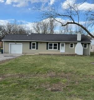 Single story home with a garage, driveway, a chimney, and a front lawn