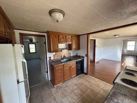 Kitchen with white appliances, brown cabinetry, and light tile patterned flooring