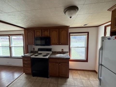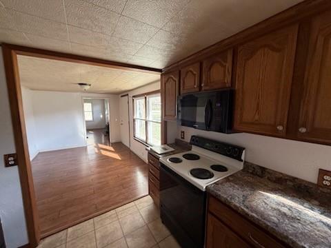 Kitchen with white electric range oven, black microwave, light tile patterned floors, and brown cabinetry
