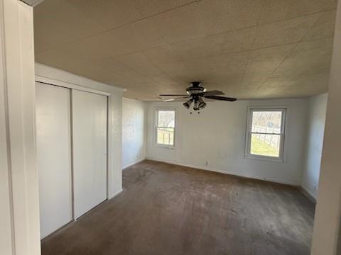Unfurnished bedroom featuring a closet, carpet, and a ceiling fan