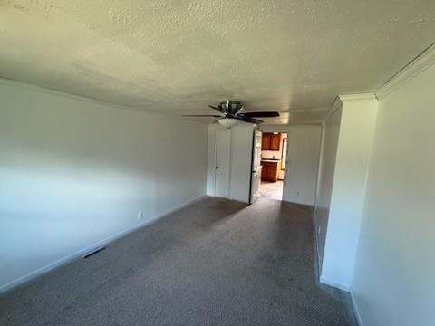 Unfurnished room featuring a textured ceiling, dark carpet, and a ceiling fan