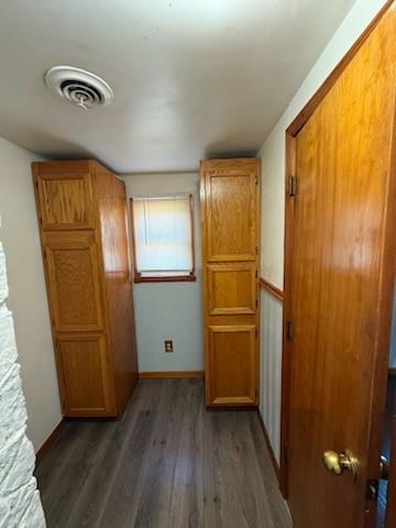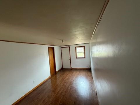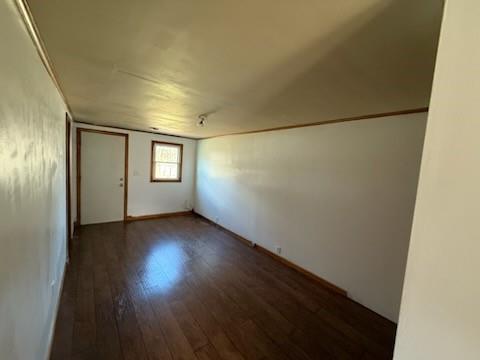 Unfurnished bedroom with dark wood-style floors and baseboards