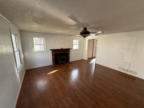 Unfurnished living room featuring wood-type flooring, a textured ceiling, ceiling fan, and a fireplace