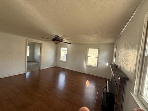 Unfurnished living room featuring a textured ceiling, dark wood finished floors, a textured wall, and a ceiling fan