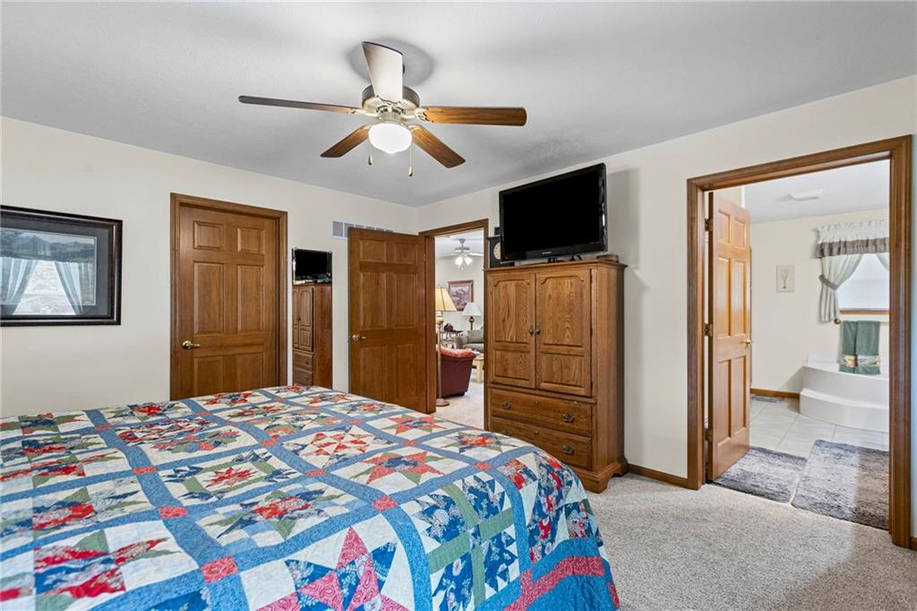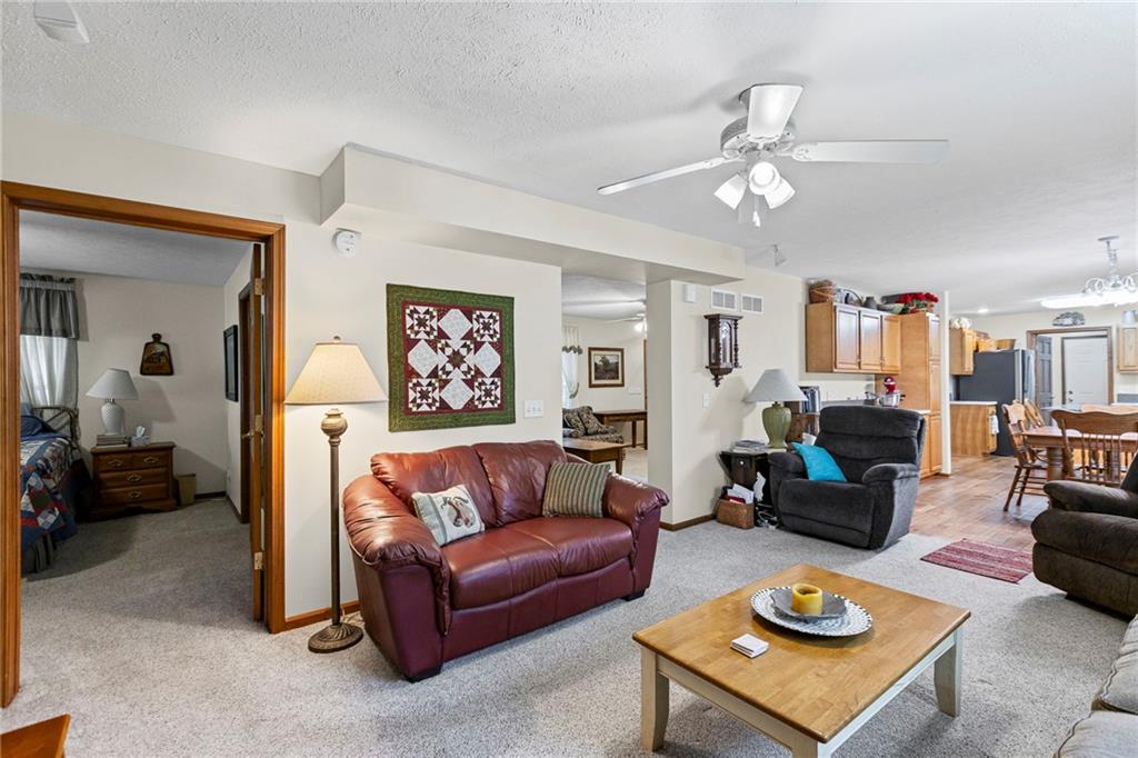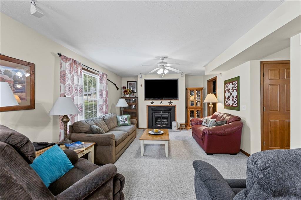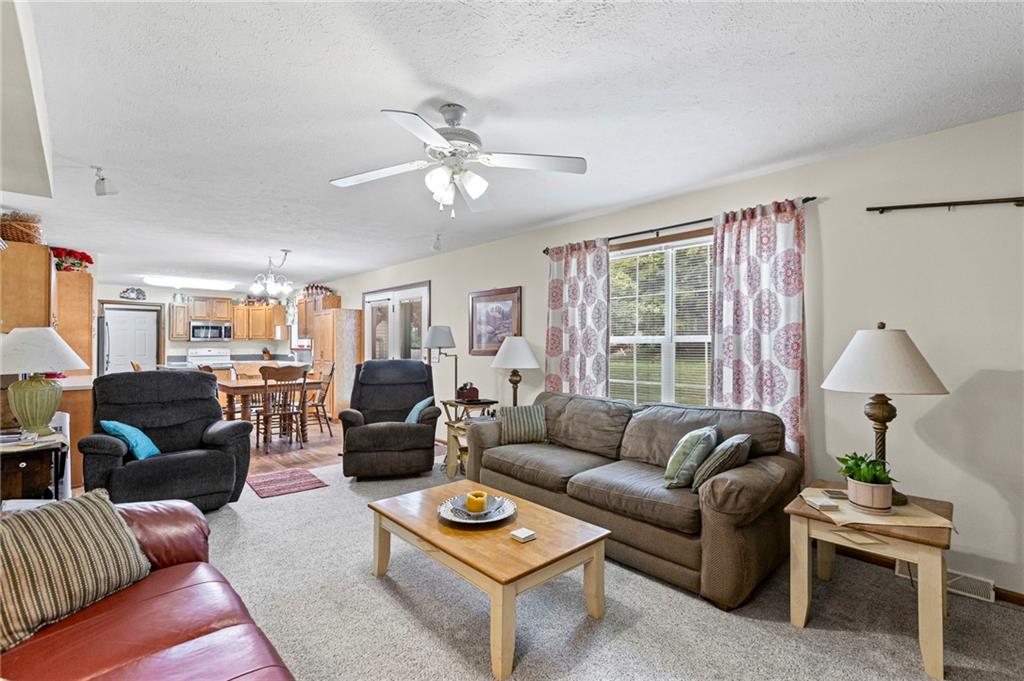 An inviting 8X60 front porch welcomes you to this beautiful three-bedroom, two-and-a-half-bath home, nestled on a nearly half-acre lot in the private and highly sought-after Hickory Valley Subdivision. The main level is perfect for entertaining. The huge eat-in kitchen is a chef’s delight, with abundant cabinets, Corian countertops, a large island, two pantries with pull-out drawers, a built-in double trash can cabinet, and beautiful hardwood floors. The kitchen seamlessly flows into the great room, which features a cozy gas fireplace. A formal dining room and a second living area provide plenty of space for gatherings. The spacious primary bedroom ensuite offers a luxurious retreat, complete with double sinks, a soaking tub, and a separate shower. The second floor includes two additional bedrooms, a full bathroom, and a third living area that can easily be transformed into a family room, office, or rec room to suit your needs. A full basement awaits your personal touch, ready to be finished and customized. The large, tree-filled backyard is an outdoor oasis, complete with a patio, a pergola, and a shed. This home is located just 30 minutes south of Olathe, making it an ideal family home. With so much to offer, it won't be on the market for long!