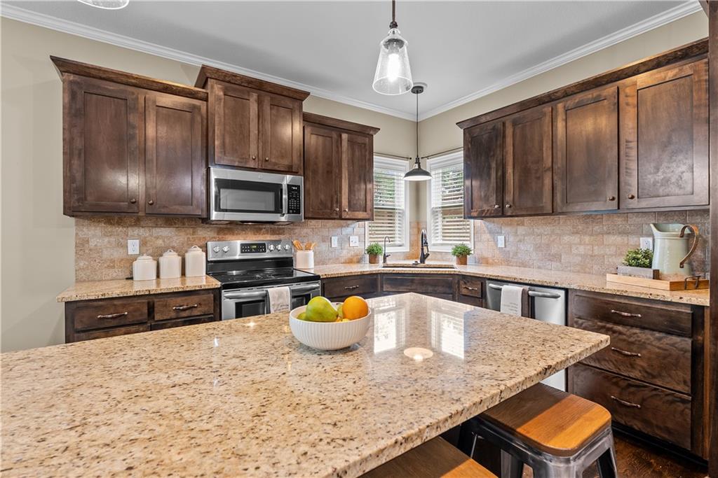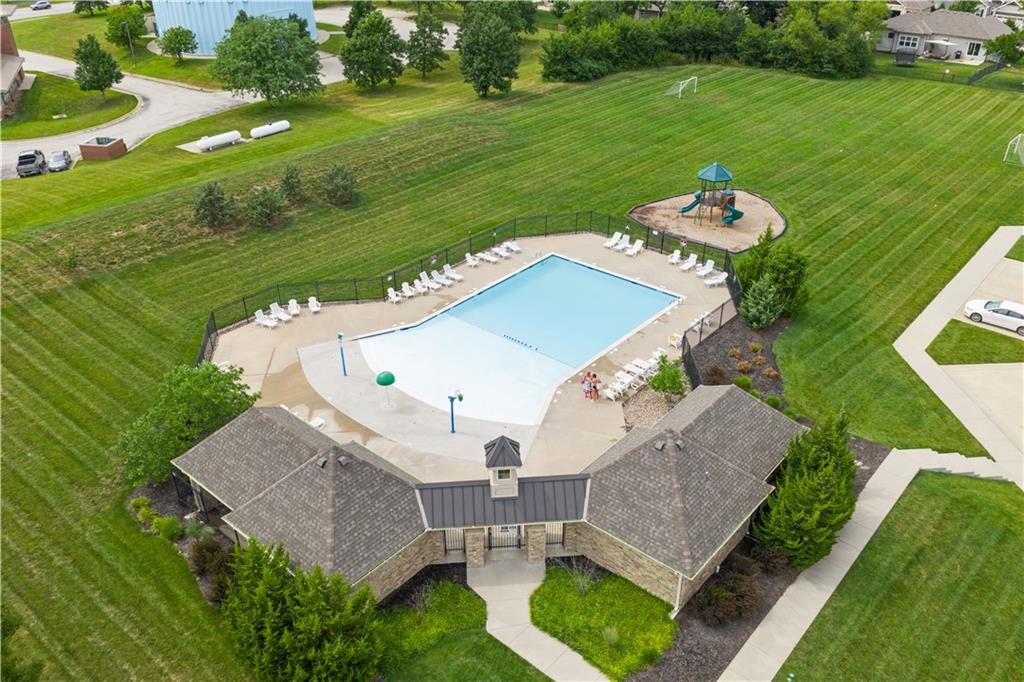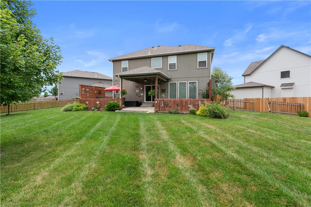 Welcome to this beautifully maintained 2-story home in the sought-after Parkway Estates community and award-winning Blue Springs School District! Nestled on a quiet cul-de-sac lot, this home offers 4 bedrooms, 2.5 baths, and over 2,700 sq ft of living space designed for both style and function. Step inside to find an inviting open floor plan with hardwood flooring, crown molding, and a cozy gas fireplace in the living room. The kitchen features granite countertops, a large island, stainless steel appliances, and rich cabinetry—perfect for everyday cooking and entertaining alike. Upstairs, the spacious primary suite offers a tray ceiling, soaking tub, dual vanities, and a walk-in closet with built-in organization. The finished lower level provides additional living space with room for a rec area, playroom, or home gym. It’s also stubbed for a future bathroom and includes multiple storage areas. Outside, enjoy the fully fenced backyard that backs to serene green space with no rear neighbors, along with a covered patio complete with privacy screen and string lighting—an entertainer’s dream! Additional highlights include a 3-car garage, new roof (2024), whole-home humidifier, water softener, and original HVAC and water heater (2016) still in great condition. Neighborhood amenities include a community pool, playground, and sidewalks, providing the perfect blend of convenience and community. This home checks every box—space, location, and lifestyle—all in the heart of Blue Springs.