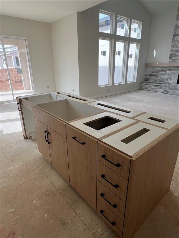 The Hudson Reverse 1.5-story by Rodrock Homes pairs modern design with effortless main-level living in Sundance Ridge. Now at the trim stage, this home features the Contemporary Elevation 4 package with upgraded garage doors, a 5-panel front door, linear 46" fireplace, metal roof, and black exterior/white interior windows. The open layout highlights a sleek kitchen with large island, walk-in pantry, and designer finishes flowing into the great room with floor-to-ceiling windows and fireplace. The private primary suite includes a spa bath and walk-in closet; the finished lower level adds a rec room and two bedrooms. Photos shown are of a prior model. Enjoy The Village amenities—two pools, clubhouse & fitness center, indoor gym, pickleball, bocce, playground & trails—in Blue Valley Schools. Ideal location just 5 min to Blue Valley High, 8 min to Price Chopper, 10 min to BluHawk shopping & dining, and 16 min to Heritage Park’s lake & trails. Approx. 180 days to completion.