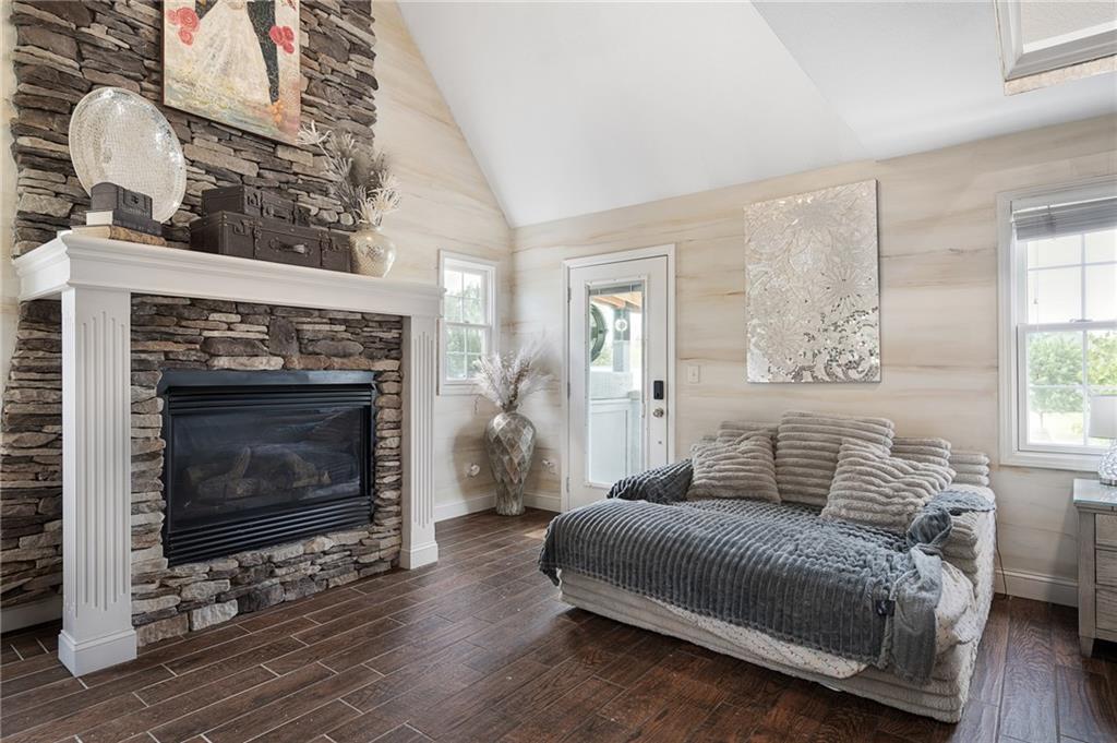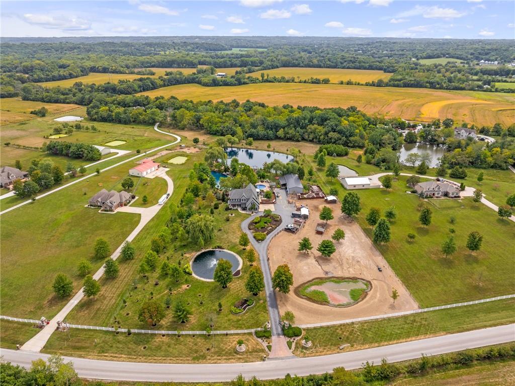 Live, work, and play like never before on this fully fenced, gated 5-acre estate on blacktop in Lone Jack—designed for entertaining, outdoor living, and enjoying the land your way. Whether you're into fishing, paddleboarding, raising chickens, gardening, hosting parties, or running a business from home, this unique property makes it possible. Three scenic ponds set the stage—one with sandy beach, dock, playhouse with hurricane deck, and zip line; another with a 12-foot stone waterfall framed by weeping willows. Outdoor living includes a pool, festive bar, outdoor shower, firepits, fountains, basketball court, and striped parking for nine. A vintage merry-go-round, playground, and wisteria-draped pergola add whimsy, while mature landscaping and unique trees create a lush, park-like setting. Grow and raise what you love: a fenced livestock area with shelters and duck pond supports chickens, goats, or a horse. A large raised garden with drip irrigation and auto-watering is ready for your green thumb. Built in 2006, the two-story home offers comfort and space with hard-surface flooring on the main level, five fireplaces, formal dining, home office, and hearth room kitchen with island seating and Viking six-burner cooktop. French doors open to a fenced dog yard with pergola and hibachi grill—perfect for pets and casual cookouts. Upstairs, four bedrooms each have private baths. The oversized primary suite includes a fireplace, sitting area, walk-in closet, and private covered balcony with mini split—your retreat above it all. The walkout lower level is built for fun and function, featuring a theater, arcade, full bar, non-conforming fifth bedroom, full bath, and access to a saloon-style patio with hot tub and firepit. A newly built outbuilding adds flexibility—with concrete floor, two oversized overhead doors, built-in compressor, and plumbing for future living quarters. Ideal for equipment, hobbies, or home-based business use.