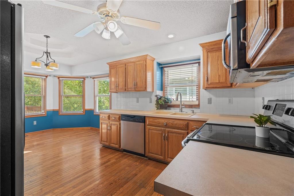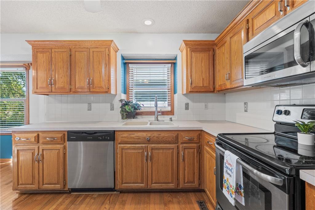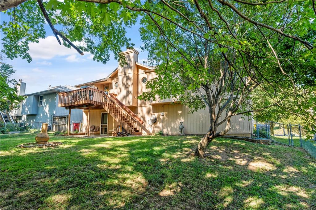 MAJOR PRICE DROPS!!!! Solid split-entry home in the Fort Osage School District with a functional layout and plenty of natural light. The main level offers vaulted ceilings, hardwood flooring, and a wood-burning fireplace in the living room. Kitchen includes stainless steel appliances and an eat-in dining space that opens to the deck. Three bedrooms and two full baths on the main floor, including a primary suite with private bath. Finished walk-out basement adds extra living space with two flex spaces (think home office, gym, hobbies, game night, non-confirming bedroom, separate living quarters, etc.) Backyard is generously sized, fully fenced and features mature trees for shade and privacy, as well as a covered patio under the deck! Convenient location with quick highway access, close to schools, groceries, restaurants and shopping!