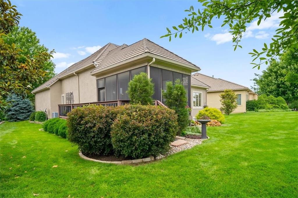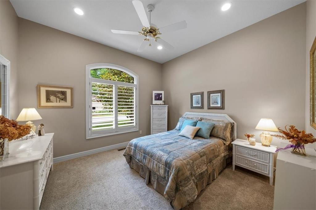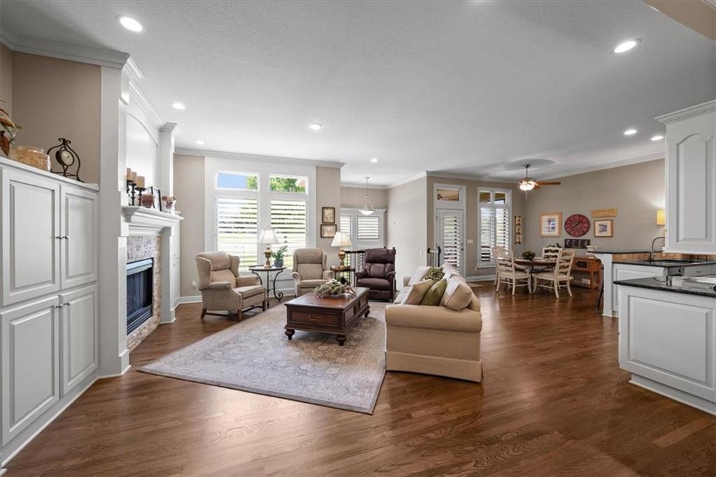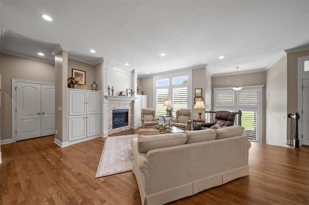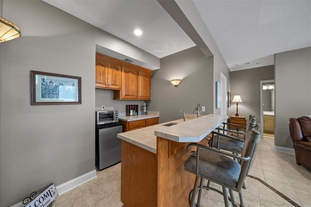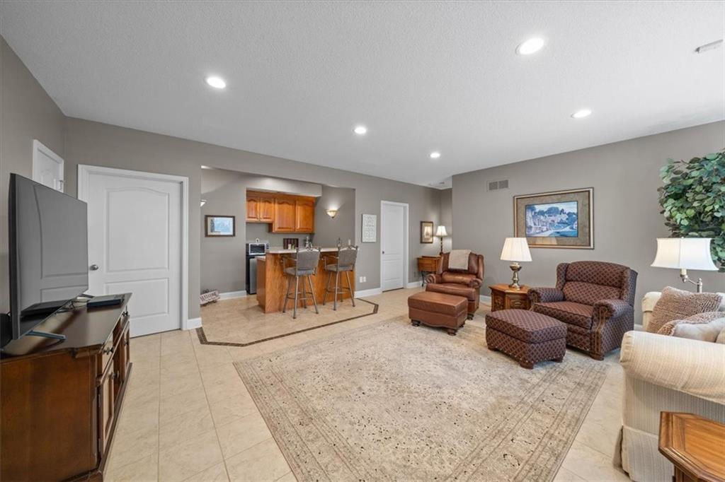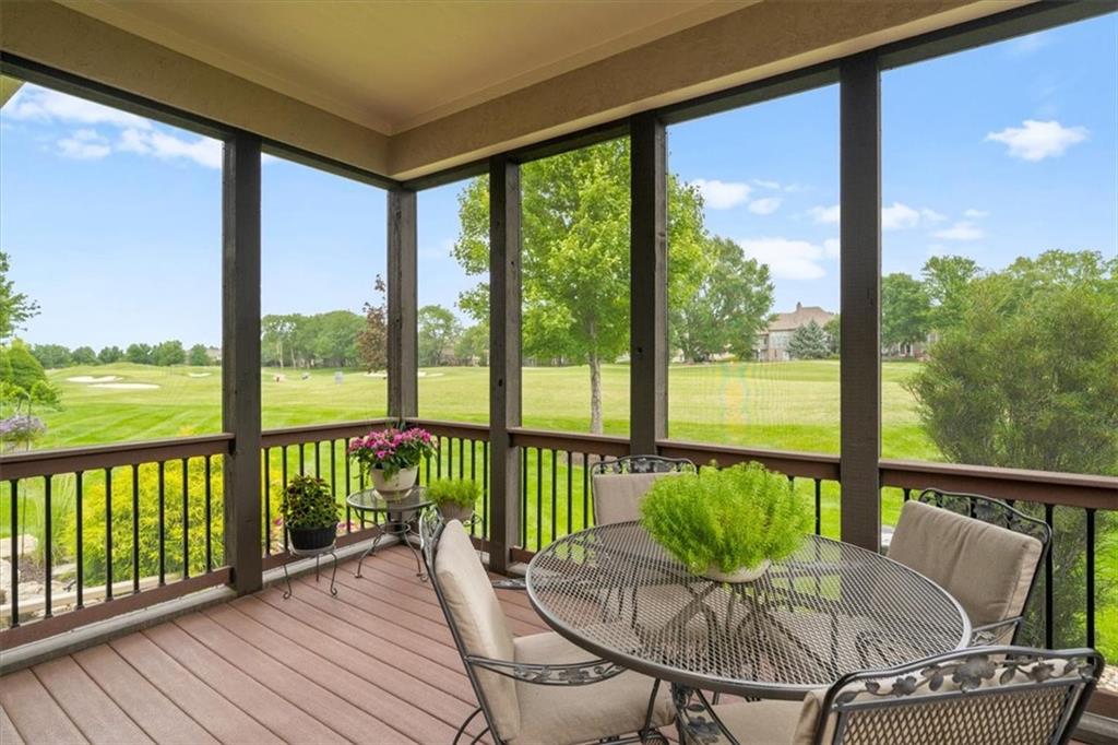 Welcome home to this wonderful reverse villa, a perfect blend of comfortable living and thoughtful updates. The main level is open and filled with natural light, featuring 2 bedrooms and 2.5 baths along with a spacious living room with custom built-ins and a decorative rock tile surround fireplace, a formal dining room, and breakfast area. The modern kitchen includes stainless steel appliances, walk-in pantry, under-cabinet lighting, and convenient slide-out drawers—perfect for home chefs and entertaining. Custom plantation shutters throughout the main level frame beautiful views of Falcon Ridge Golf Course. Step out to the screened-in porch overlooking the 18th fairway. With an east-facing view, it’s the perfect place to watch the sunrise with your morning coffee and, in the evening, enjoy happy hour or dinner. The attached composite deck invites guests outside to take in more golf course views and fire up the grill. The primary suite is a restful retreat with neutral finishes, walk-in closet, and spa-like bath with an ONYX shower. A 2nd bedroom and full bath on the main level make an ideal setup for overnight guests or a home office. A convenient laundry room with sink and folding counter completes the main floor. Downstairs, the finished lower level offers a spacious family room with wet bar and walk-in closet that’s perfect for games and entertainment. Two additional bedrooms, each with a walk-in closet, and full bath provide plenty of space for family or guests. A workshop with a direct staircase from the garage makes projects easy without bringing mess through the home. Numerous thoughtful upgrades include a composite deck, water mitigation system, central vacuum, backup battery for the sump pump, extensive storage, R-51 attic insulation, hardwood floors, new lighting, carpet, and exterior paint. Plus, lawn service and snow removal are provided.