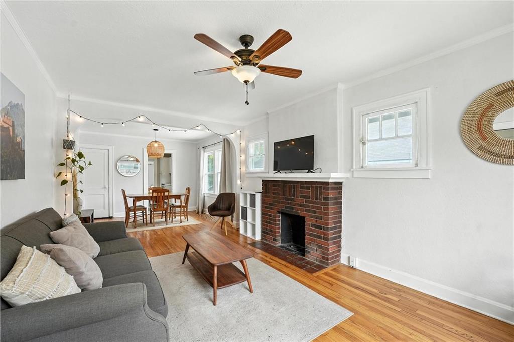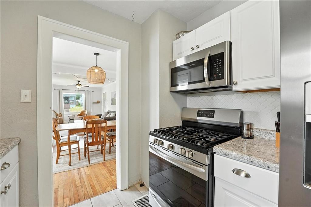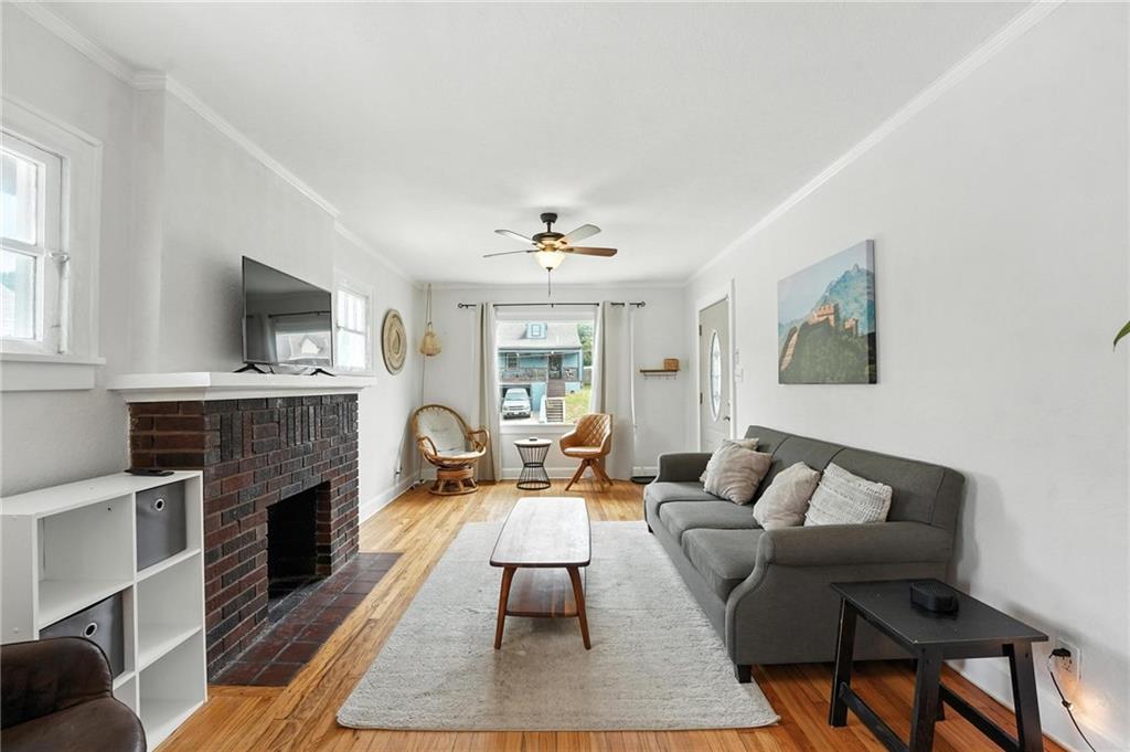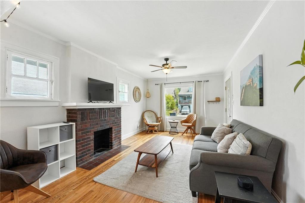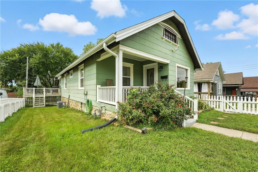 **Sellers are willing to contribute to the buyer's closing costs with an acceptable offer.** Charming home with the white picket fence of your dreams! New windows, a/c, water heater, gutters and refinished hardwood floors in 2022. This charming 2-bedroom, 1-bath bungalow is full of character, starting with its welcoming, covered front porch. Inside, the living room features hardwood floors, a brick fireplace, ceiling fan, and a large picture window that fills the space with natural light. The dining room showcases refinished hardwoods and an arched cased opening, creating a seamless flow into the updated kitchen with tile flooring, laminate counters, and newer stainless appliances including a gas stove. The recently finished sunroom with new windows and exterior door adds extra living space, perfect for relaxing or entertaining. Both bedrooms include hardwood floors, while the full bath offers a tiled shower surround. The stone basement provides storage and includes a garage door. Outside, enjoy the side deck, shared driveway, and rear parking. The attic includes windows and stairs, offering the potential to be converted into additional living space.