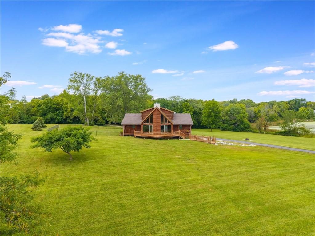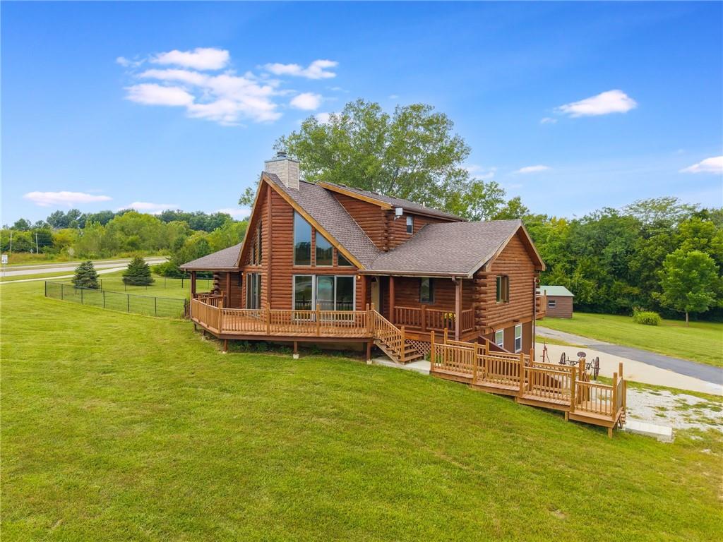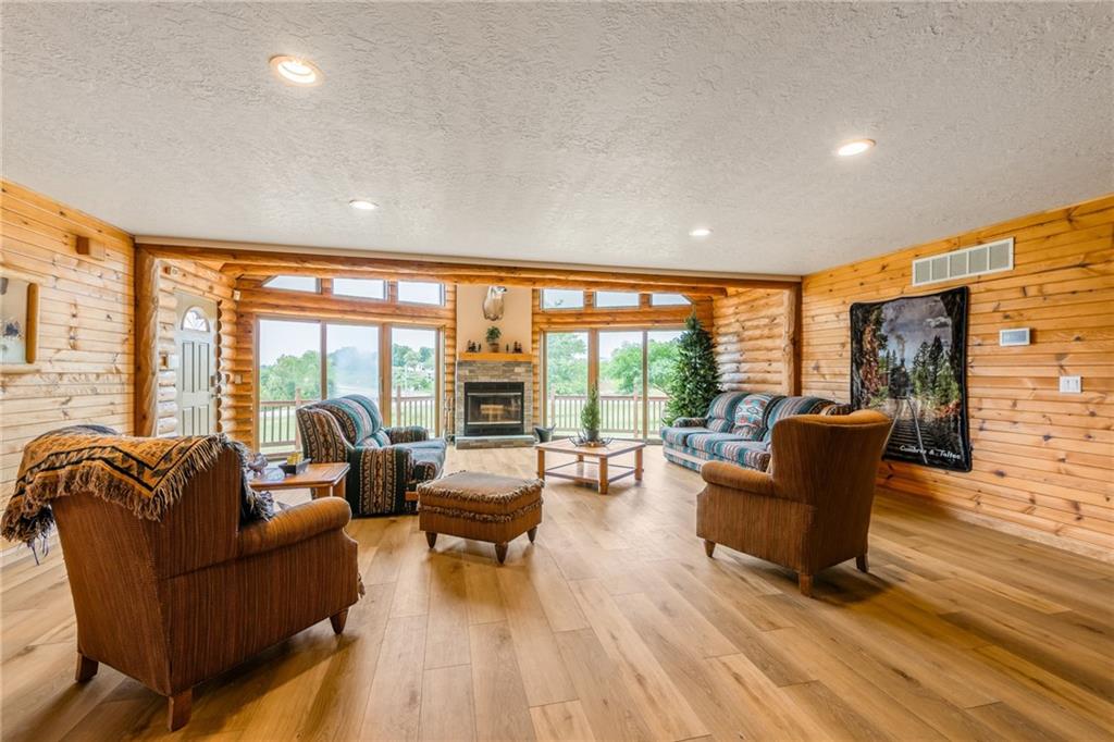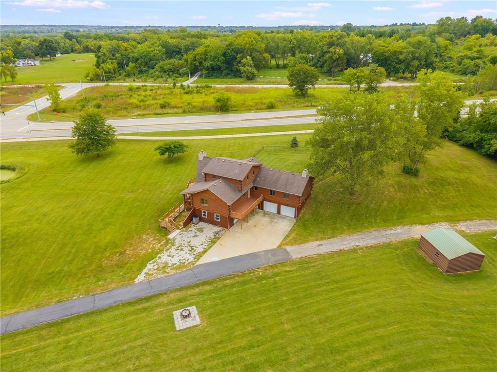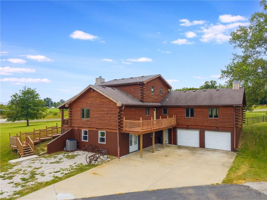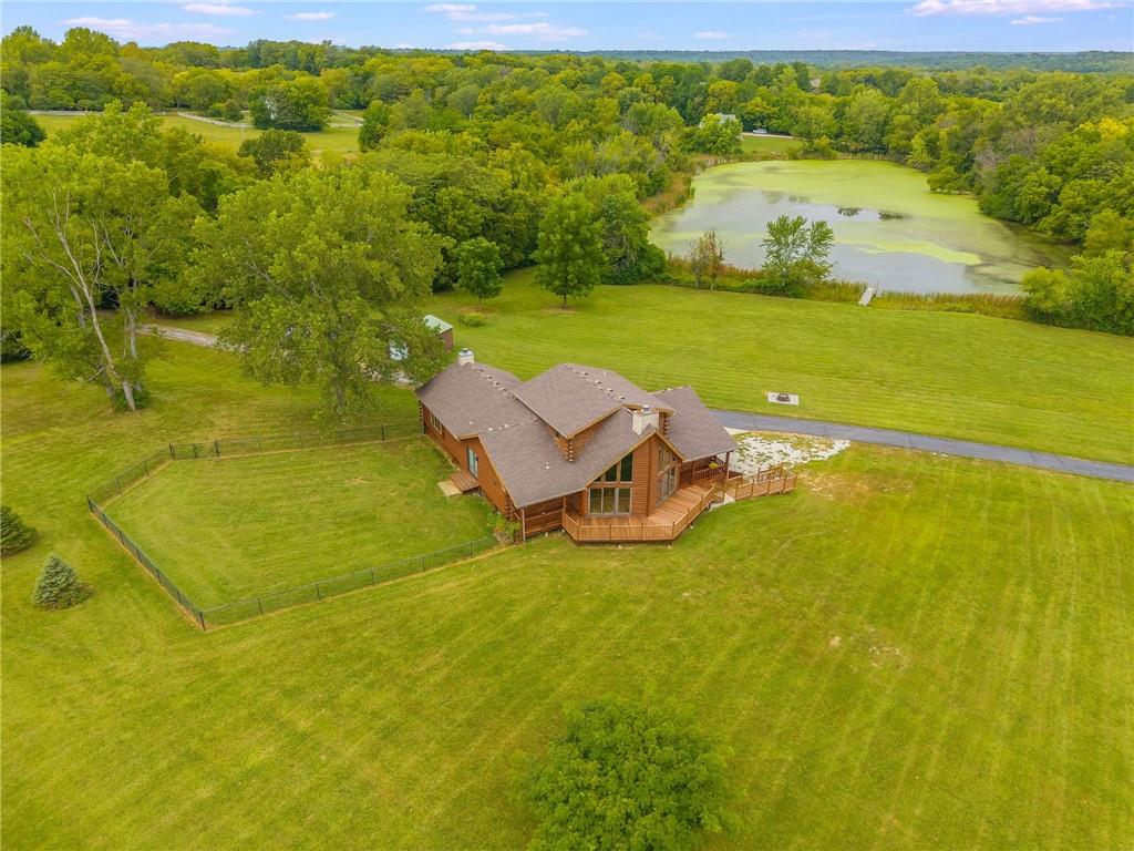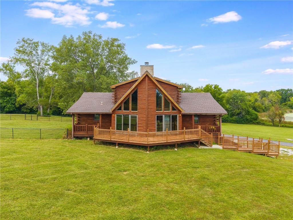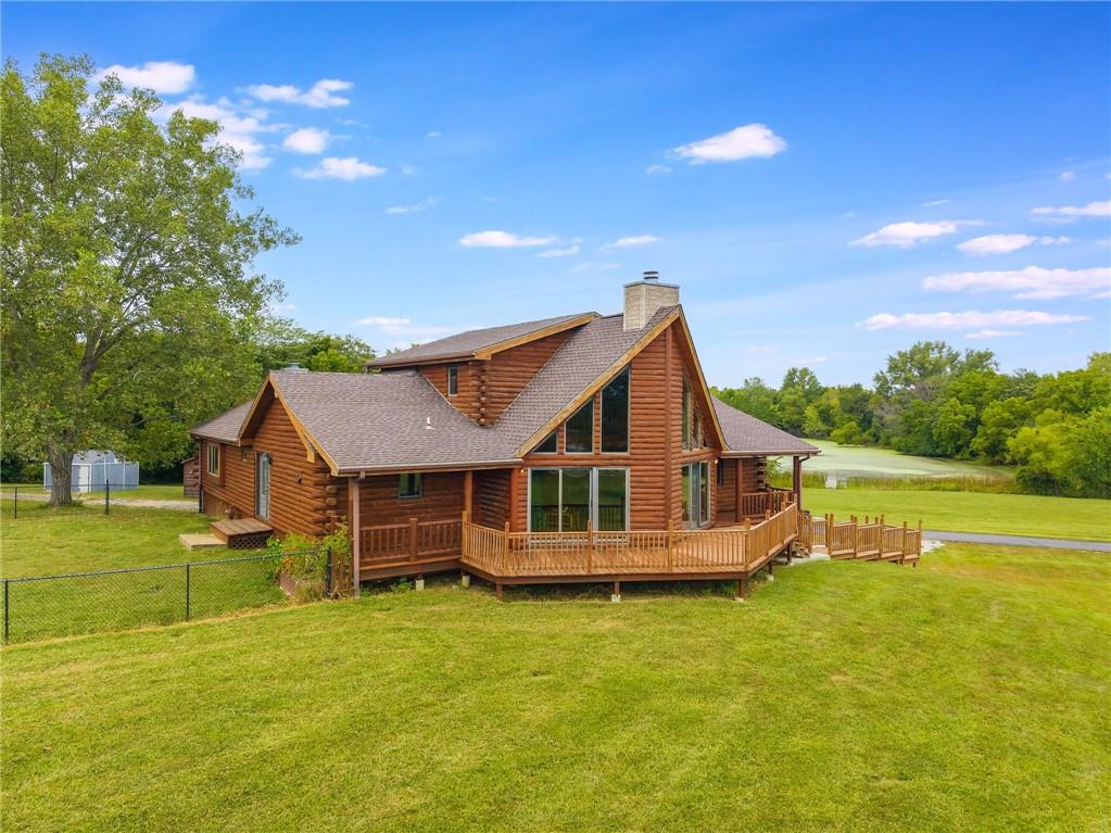 AMAZING location right off of main road for a business. Escape to your own private retreat on 8.78 acres overlooking a 3-acre stocked pond with a perfect mix of woods and pasture. This custom-built insulated log cabin offers both rustic beauty and energy efficiency, showcasing hand-carved stairs, soaring vaulted beamed ceilings, a gorgeous deck, and a dramatic two-story stone fireplace that anchors the heart of the home. There's even potential for a second apartment in the walkout basement. Step inside and you’re greeted with breathtaking views from every angle. The main level invites gathering with a spacious kitchen including tons of cabinets and center island, a cozy master suite with a walk-in closet and jacuzzi tub, and a large room with a second fireplace that could be a huge bedroom or separate living space. A door opens from the kitchen to a fenced yard great for the pets in your life. Upstairs, you find the coziest part of the home - a charming loft overlooks the great room, perfect for reading or simply soaking in the cabin atmosphere, along with another bedroom and bath. The finished walkout basement expands your possibilities with tall ceilings, a spacious gathering area, abundant storage, and an additional bedroom. Enjoy two solar-powered outbuildings and an extended 2 car garage for hobbies, storage, or workspace. Whether you’re fishing in your shared pond, exploring the woods, farming, or relaxing on the deck, this property offers the ultimate combination of privacy and lifestyle. Located less than 10 minutes from Longview Lake, shopping, dining, and amenities, this log cabin retreat is the perfect way to embrace the warm and relaxing lifestyle you are seeking.