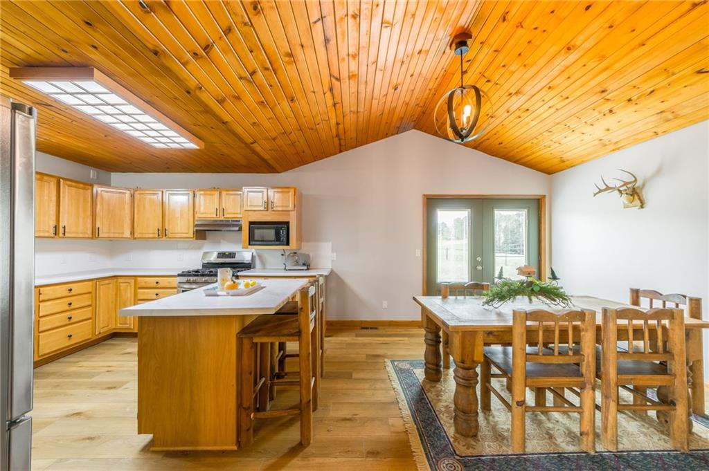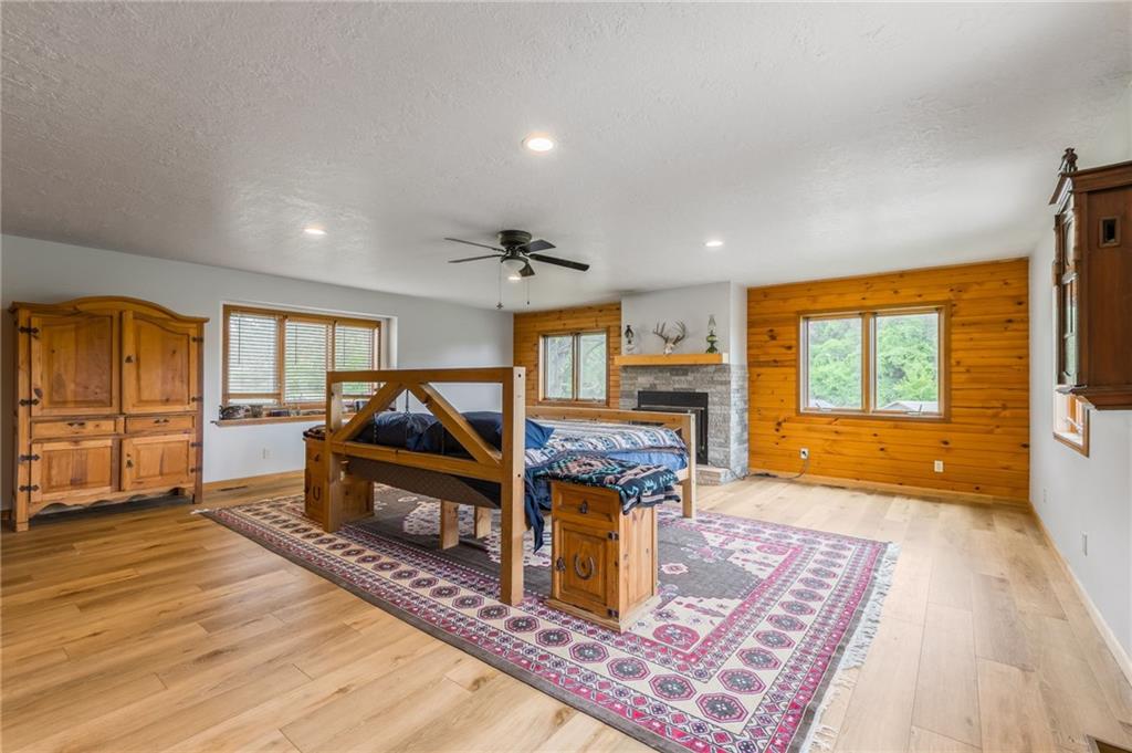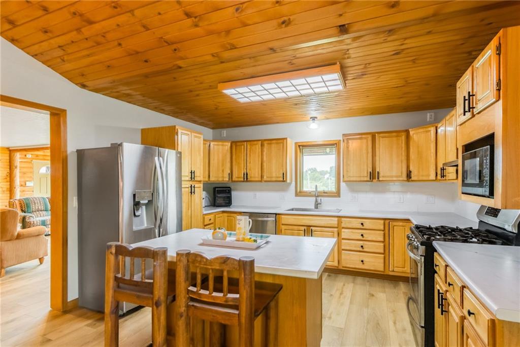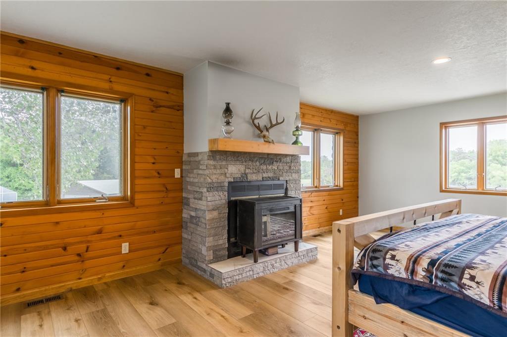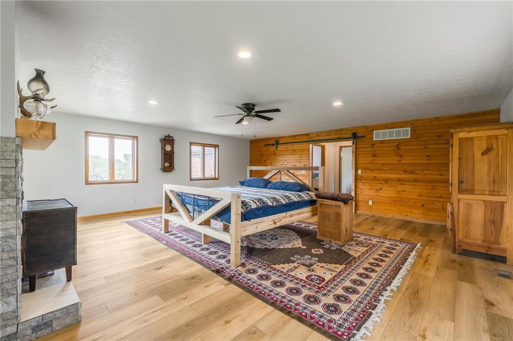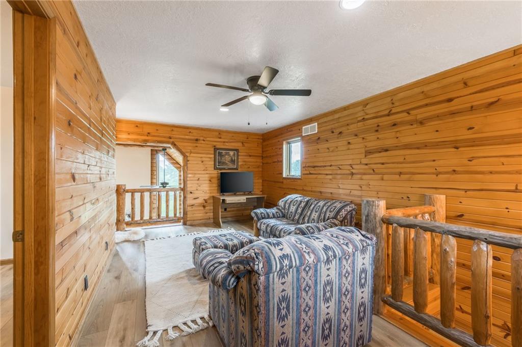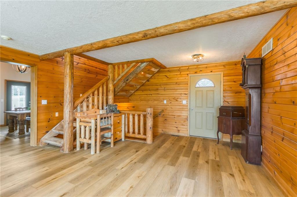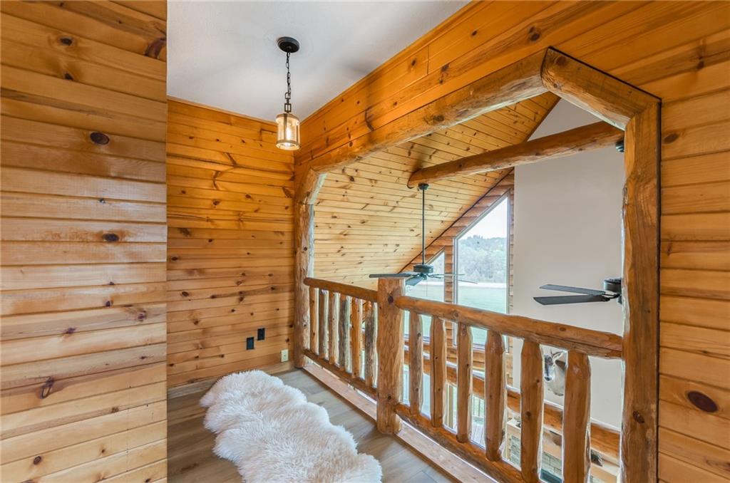 AMAZING location right off of main road for a business. Escape to your own private retreat on 8.78 acres overlooking a 3-acre stocked pond with a perfect mix of woods and pasture. This custom-built insulated log cabin offers both rustic beauty and energy efficiency, showcasing hand-carved stairs, soaring vaulted beamed ceilings, a gorgeous deck, and a dramatic two-story stone fireplace that anchors the heart of the home. There's even potential for a second apartment in the walkout basement. Step inside and you’re greeted with breathtaking views from every angle. The main level invites gathering with a spacious kitchen including tons of cabinets and center island, a cozy master suite with a walk-in closet and jacuzzi tub, and a large room with a second fireplace that could be a huge bedroom or separate living space. A door opens from the kitchen to a fenced yard great for the pets in your life. Upstairs, you find the coziest part of the home - a charming loft overlooks the great room, perfect for reading or simply soaking in the cabin atmosphere, along with another bedroom and bath. The finished walkout basement expands your possibilities with tall ceilings, a spacious gathering area, abundant storage, and an additional bedroom. Enjoy two solar-powered outbuildings and an extended 2 car garage for hobbies, storage, or workspace. Whether you’re fishing in your shared pond, exploring the woods, farming, or relaxing on the deck, this property offers the ultimate combination of privacy and lifestyle. Located less than 10 minutes from Longview Lake, shopping, dining, and amenities, this log cabin retreat is the perfect way to embrace the warm and relaxing lifestyle you are seeking.