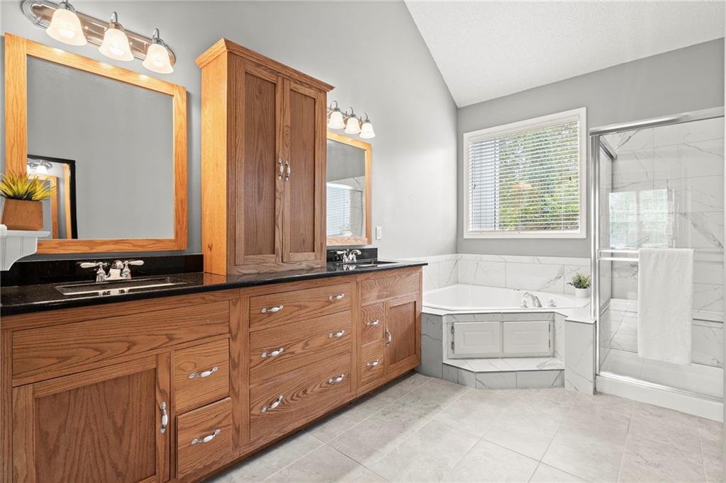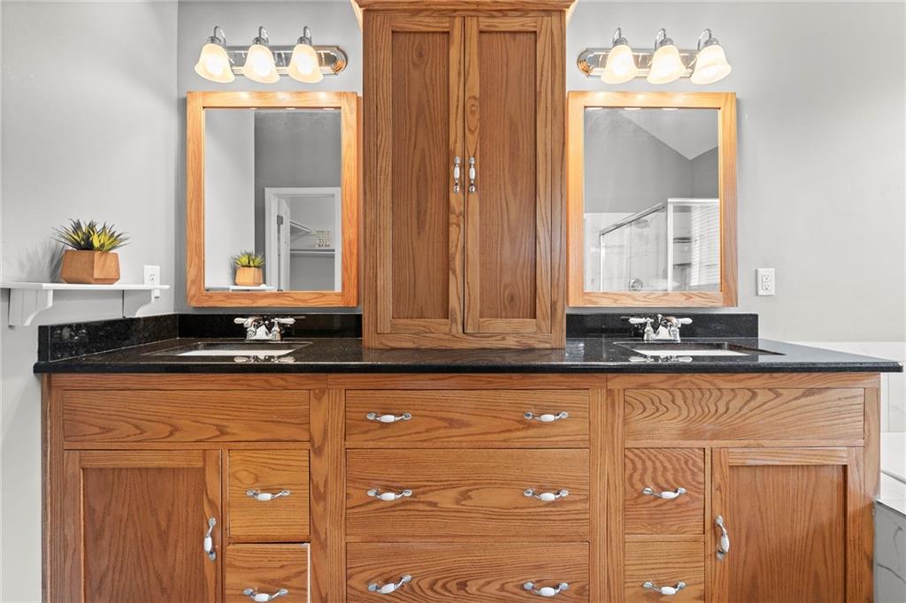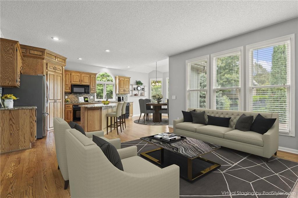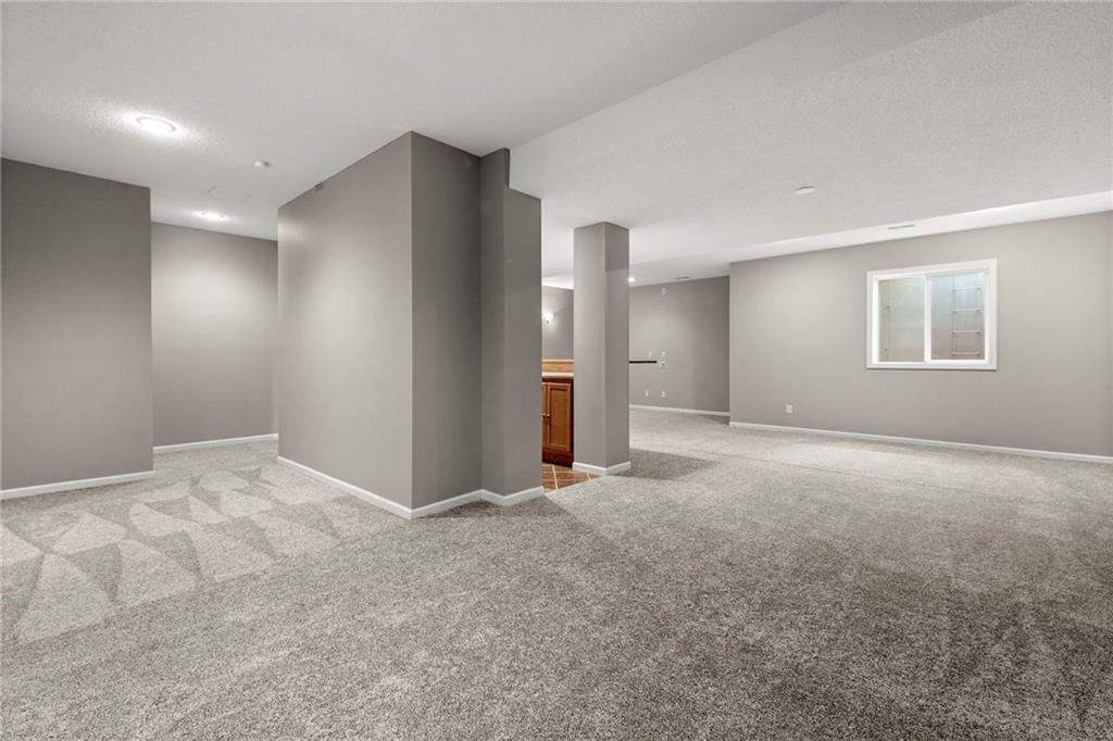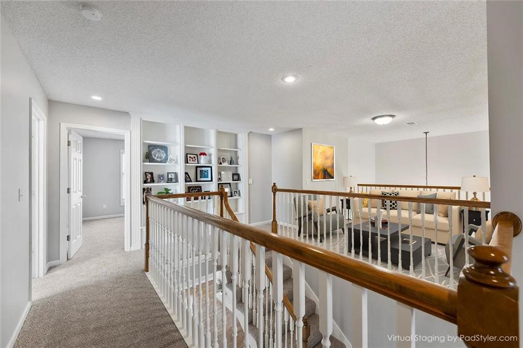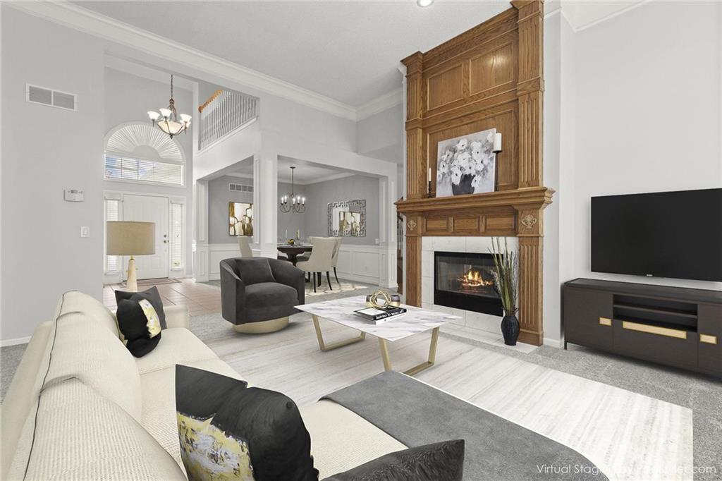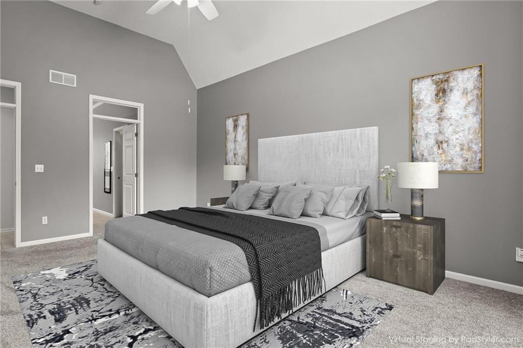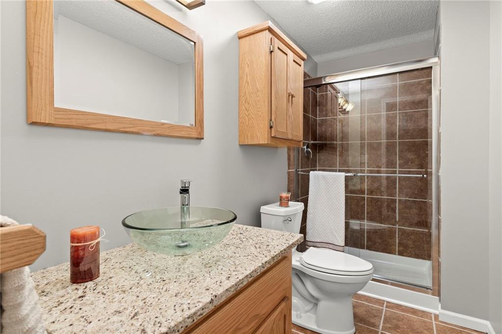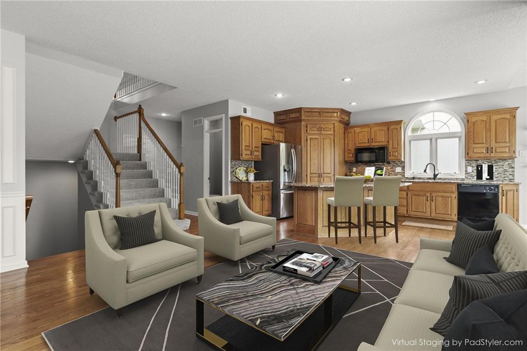 What are you waiting for? Finally you can grab a home with a main floor primary suite in the desirable Amesbury community! Step inside to a dramatic two-story entry and a spacious Great Room with floor-to-ceiling windows that fill the space with natural light. The warm Kitchen and Hearth Room feature beautiful wood flooring, updated granite counters, and a true cook's delight--an oversized prep island with no sink plus upgraded venting to the outside. A new refrigerator stays with the home, and the oversized corner pantry keeps appliances and groceries neatly tucked away. The main floor also offers a convenient laundry room with new tile flooring. You will enjoy the main floor primary suite with huge walk-in closet and a fully updated bath--expanded shower, new tile, and modern fixtures. Plush newer carpet extends throughout the main and lower levels of the home, creating a soft, inviting feel. Upstairs, you'll find brand new carpet, a versatile loft overlooking the entry and Great Room, along with three generously sized bedrooms, each with walk-in closets and bath access featuring fresh tile flooring. The finished lower level is an entertainer's dream--complete with a large TV area, kitchen/bar, full bath, exercise area, play area, craft space with utility sink, and an versatile walk-in closet designed for clothing and storage. Enjoy outdoor living on the newer composite deck overlooking the east-facing, fenced backyard with a raised bed for your garden, too! The three-car garage with utility sink adds extra convenience. Nestled on a quiet cul-de-sac in award-winning Blue Valley Schools, this home truly has it all. Just a two block walk to the paved 1/2 mile pathway to Amesbury Lake Park. This trail connects with the Tomahawk Trail system--12 miles of fun!