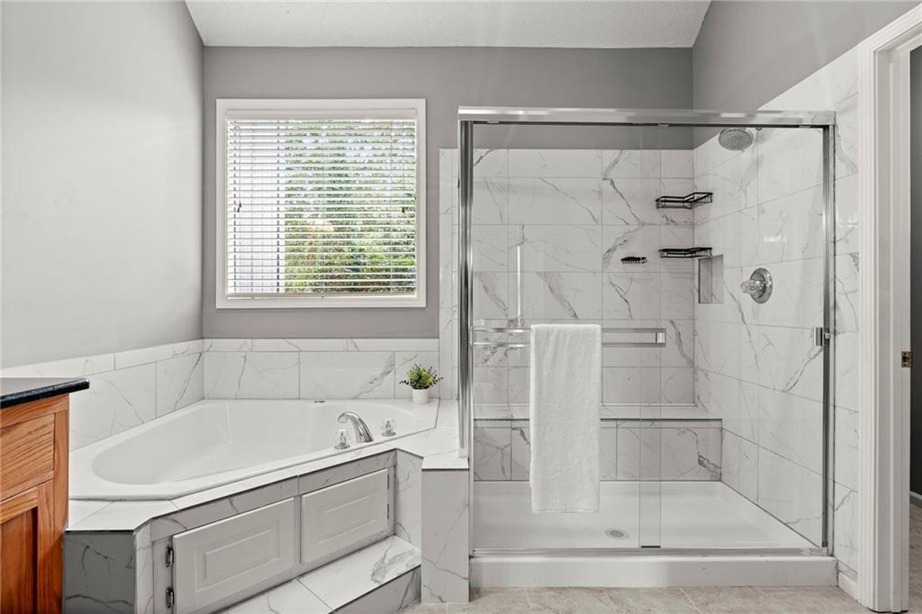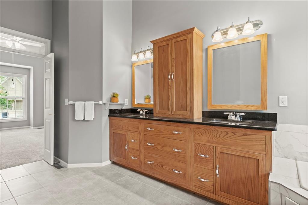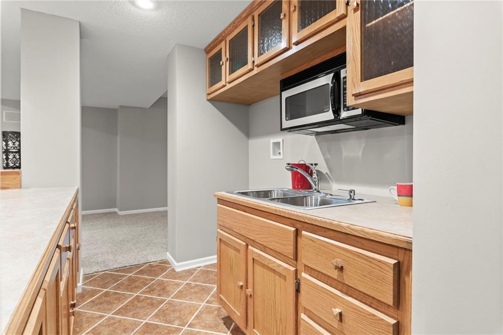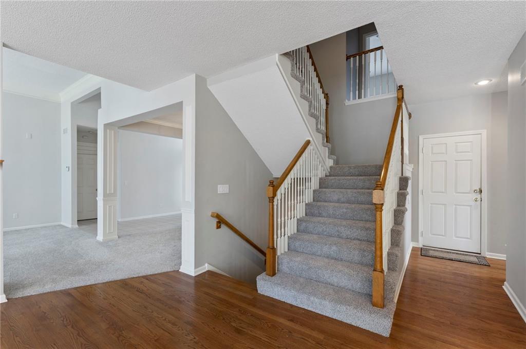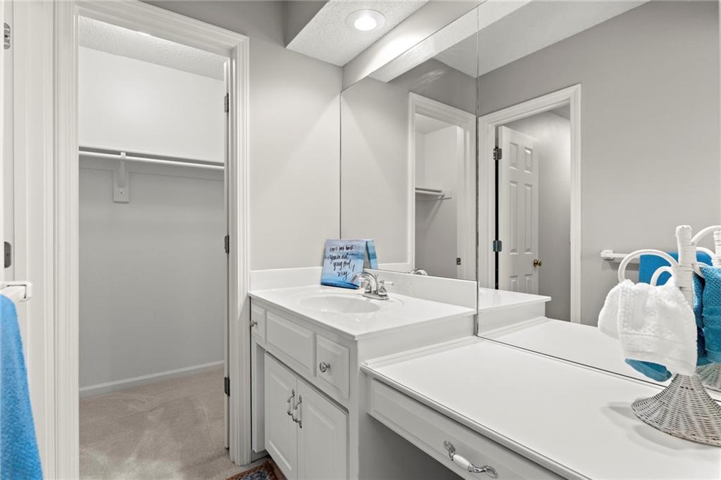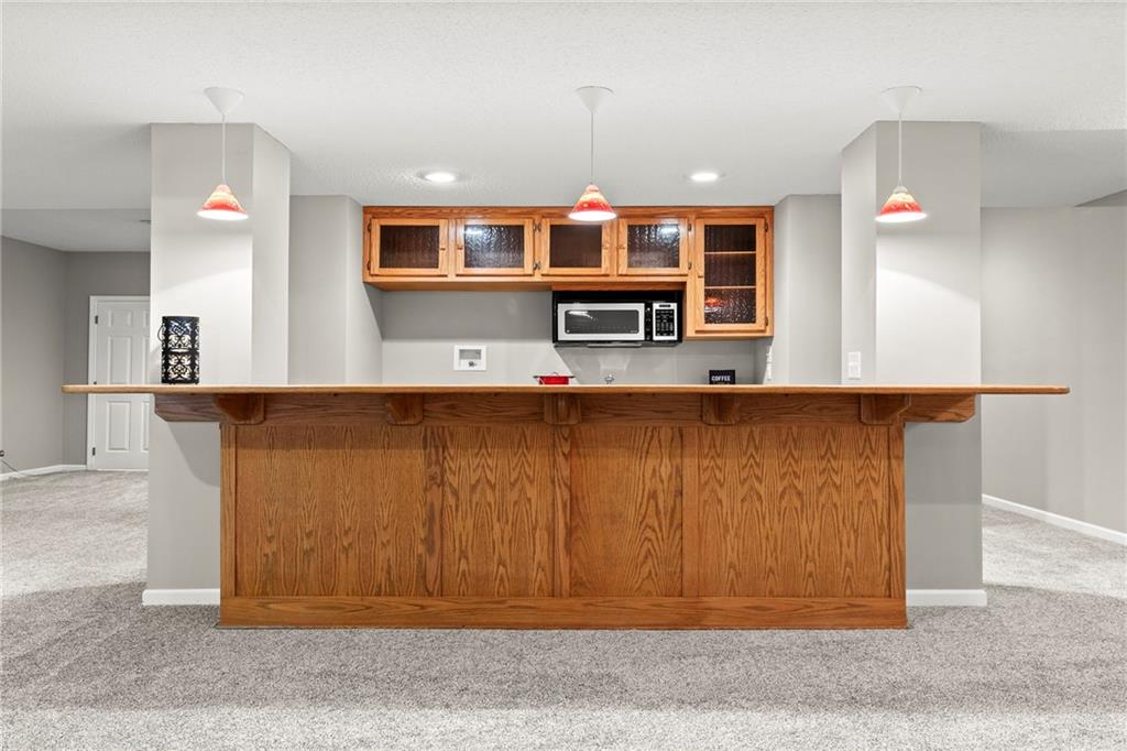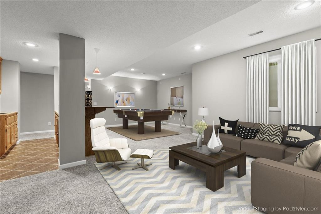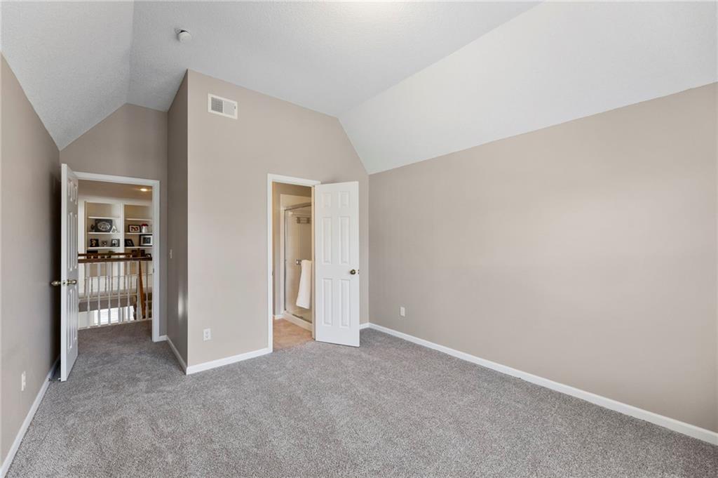 What are you waiting for? Finally you can grab a home with a main floor primary suite in the desirable Amesbury community! Step inside to a dramatic two-story entry and a spacious Great Room with floor-to-ceiling windows that fill the space with natural light. The warm Kitchen and Hearth Room feature beautiful wood flooring, updated granite counters, and a true cook's delight--an oversized prep island with no sink plus upgraded venting to the outside. A new refrigerator stays with the home, and the oversized corner pantry keeps appliances and groceries neatly tucked away. The main floor also offers a convenient laundry room with new tile flooring. You will enjoy the main floor primary suite with huge walk-in closet and a fully updated bath--expanded shower, new tile, and modern fixtures. Plush newer carpet extends throughout the main and lower levels of the home, creating a soft, inviting feel. Upstairs, you'll find brand new carpet, a versatile loft overlooking the entry and Great Room, along with three generously sized bedrooms, each with walk-in closets and bath access featuring fresh tile flooring. The finished lower level is an entertainer's dream--complete with a large TV area, kitchen/bar, full bath, exercise area, play area, craft space with utility sink, and an versatile walk-in closet designed for clothing and storage. Enjoy outdoor living on the newer composite deck overlooking the east-facing, fenced backyard with a raised bed for your garden, too! The three-car garage with utility sink adds extra convenience. Nestled on a quiet cul-de-sac in award-winning Blue Valley Schools, this home truly has it all. Just a two block walk to the paved 1/2 mile pathway to Amesbury Lake Park. This trail connects with the Tomahawk Trail system--12 miles of fun!