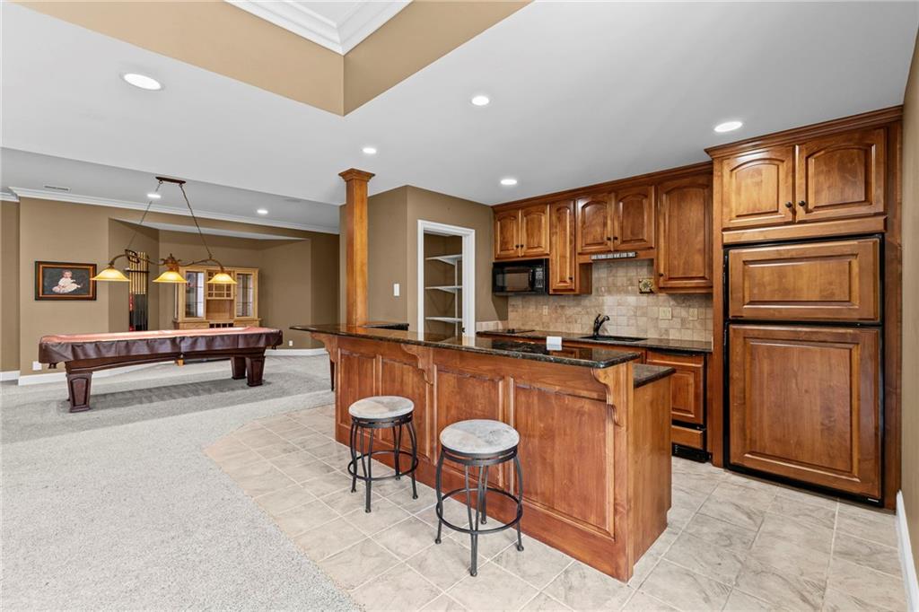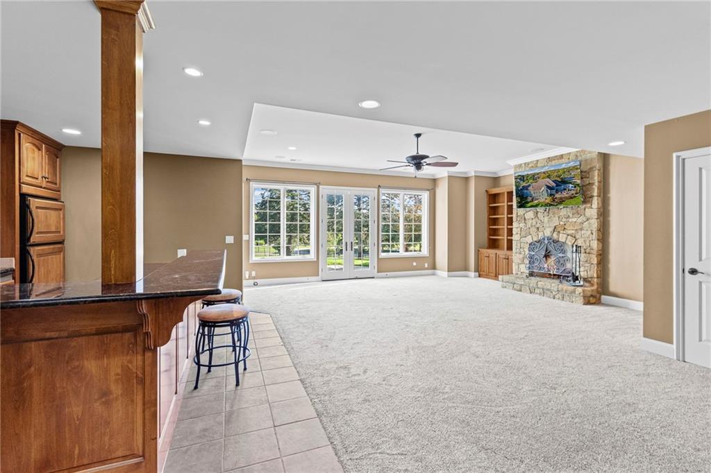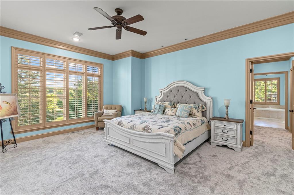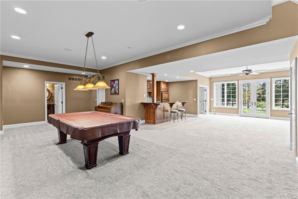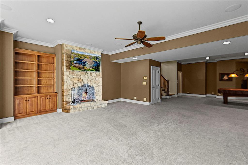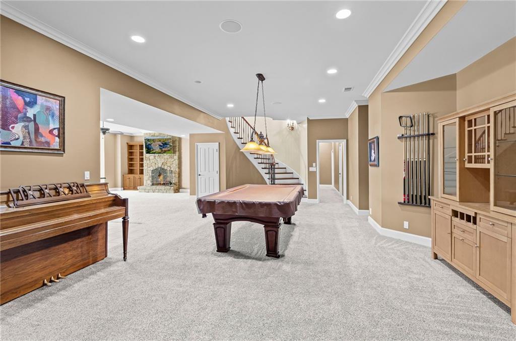 Multi-generational Estate size home with 2 primary suites and a 4 car side entry garage offers privacy on this 1+ acre lot. Additional square footage in the lower level has been professionally finished adding 2 bedrooms and 2 bathrooms to this home. Outside boast lots of trees, landscaping, a water feature, firepit & 2 patios. Upon entering you are greeted with a stunning 2 story circular staircase, plantation shutters, library with floor to ceiling built-ins, large Primary suite with new carpet, walk in shower and 2 closets. There are beautiful hardwood and carpet on the main level with a formal living and dinning room. Large chef's kitchen featuring gas cooktop, island, double ovens and pantry. The hearthroom has a beautiful stone fireplace, built ins and wet bar. Upstairs has 3 bedrooms with private baths, second laundry. New carpet upstairs in 2 bedrooms and hall. Walkout lower level w/full kitchen, rec room, 3rd fireplace, second primary suite and additional bedroom w/bath. 4 car Garage has floor to ceiling cabinets a 2nd separate staircase to the basement. This home a plenty of space for entertaining.