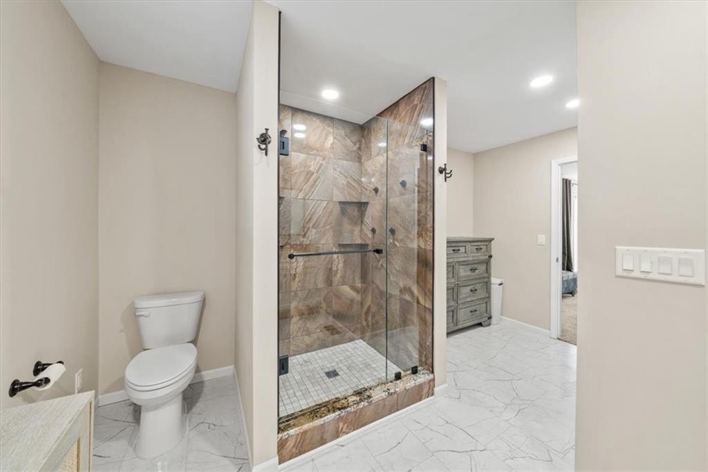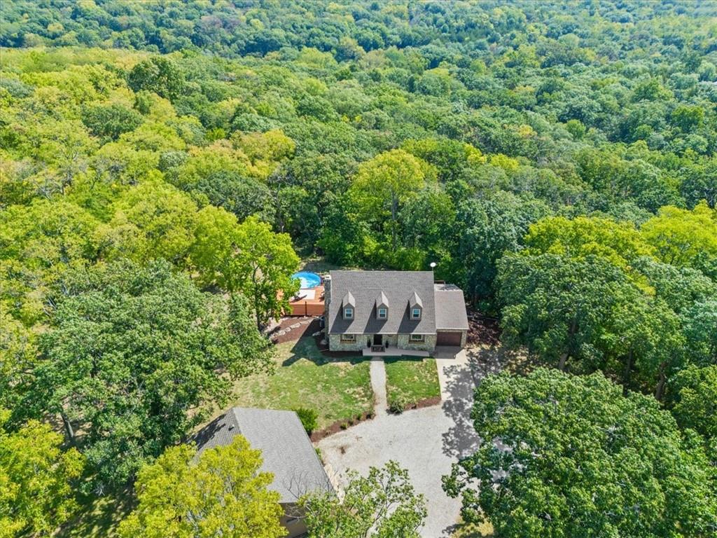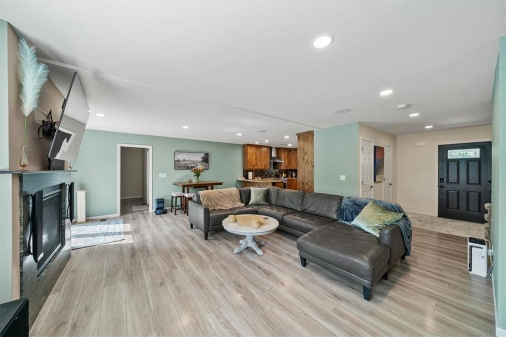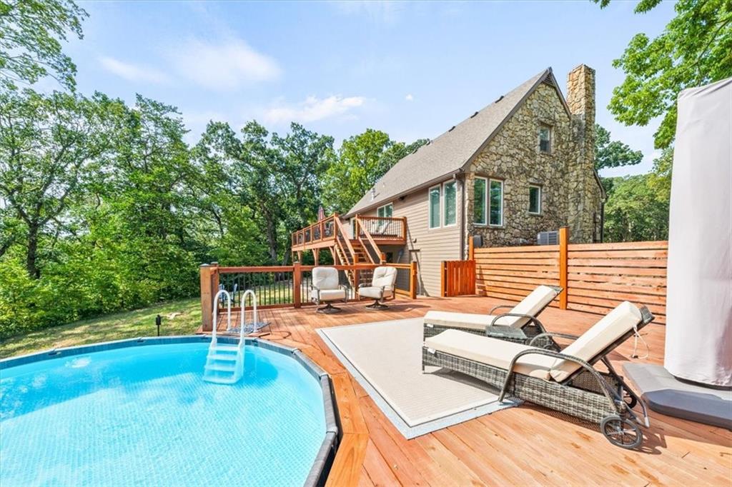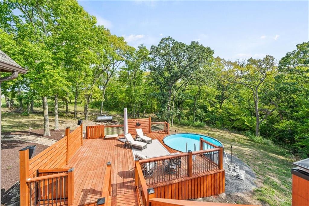 Experience the best of country living in this beautifully upgraded home. As you drive down the private lane, you'll find a welcoming stone exterior, a circle driveway, and a two-car garage or shop with a new roof. Inside, the main level features luxury vinyl plank flooring and large windows that fill the space with natural light. The cozy fireplace, set in granite and flanked by mounted speakers, creates a warm atmosphere. The kitchen comes with a full KitchenAid appliance package, including an induction stove, custom cabinetry, soft-close doors and drawers, granite countertops, a Delta touch faucet, under-cabinet lighting, and a refrigerator that stays. The primary suite on the main floor offers a custom shower, double sink vanity, and walk-in closet. The laundry room, also on the main floor, includes a second fridge. Upstairs, there are two spacious bedrooms and a full bathroom with a tub and shower combo. The walk-out basement is perfect for entertaining, with built-in cabinets, counter space, and a prep sink, plus plenty of room for a home gym or pool table. There's also ample unfinished storage and a safe room under the garage. Outside, enjoy a large 12x35 back deck that leads to a second custom deck, 24x25, built around the above-ground pool. The space is ready for a TV, so you can watch fall football under the stars. Additional features include in-ceiling speakers, six deck speakers, new doors and windows on the main floor, new garage doors, gutters, and a tankless hot water heater. Every detail has been thoughtfully considered. This home sits on over four acres. Schedule your visit soon—this opportunity won't last.