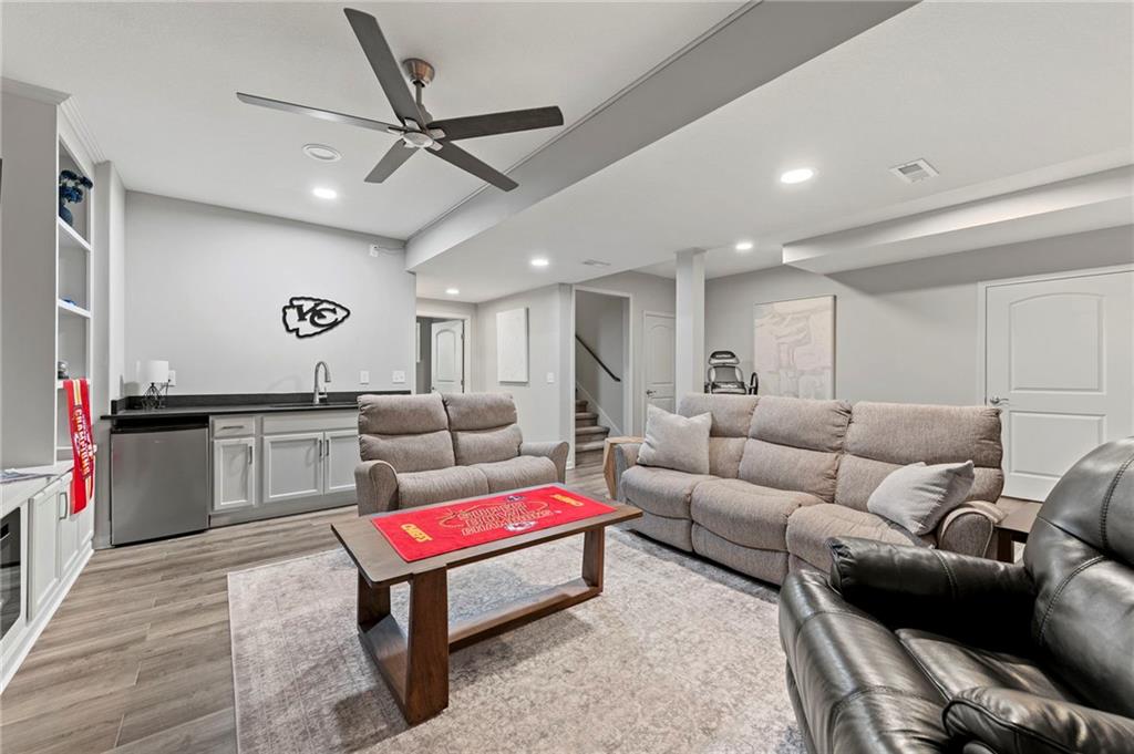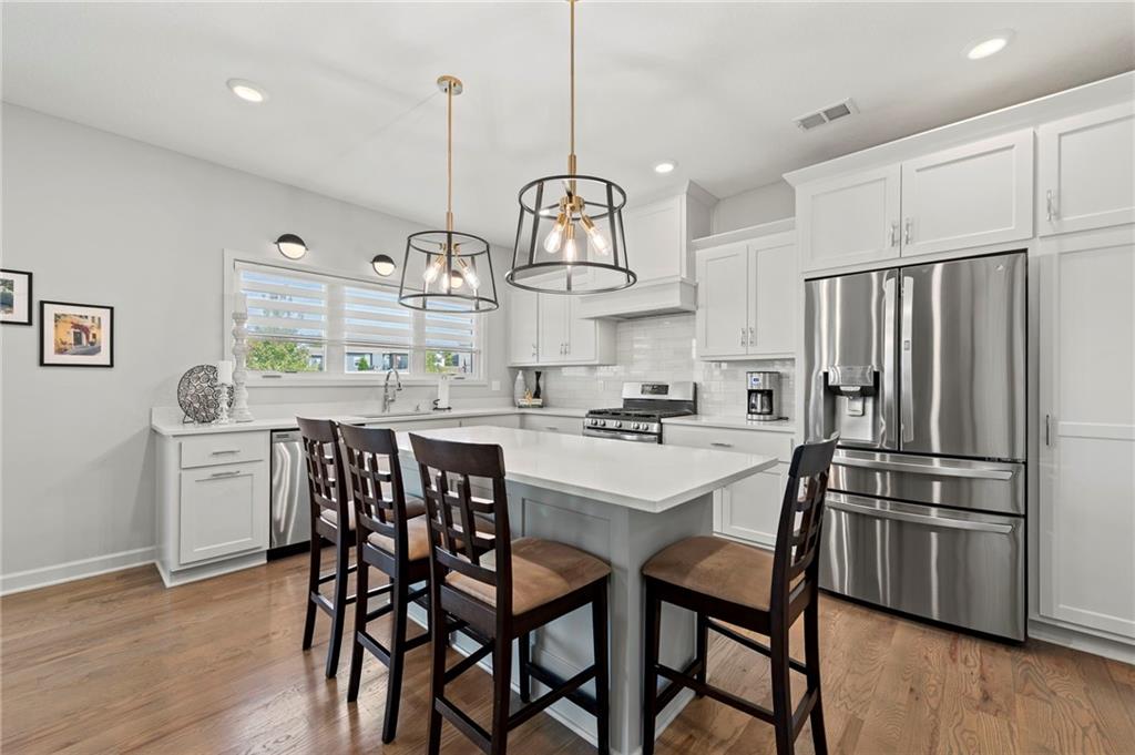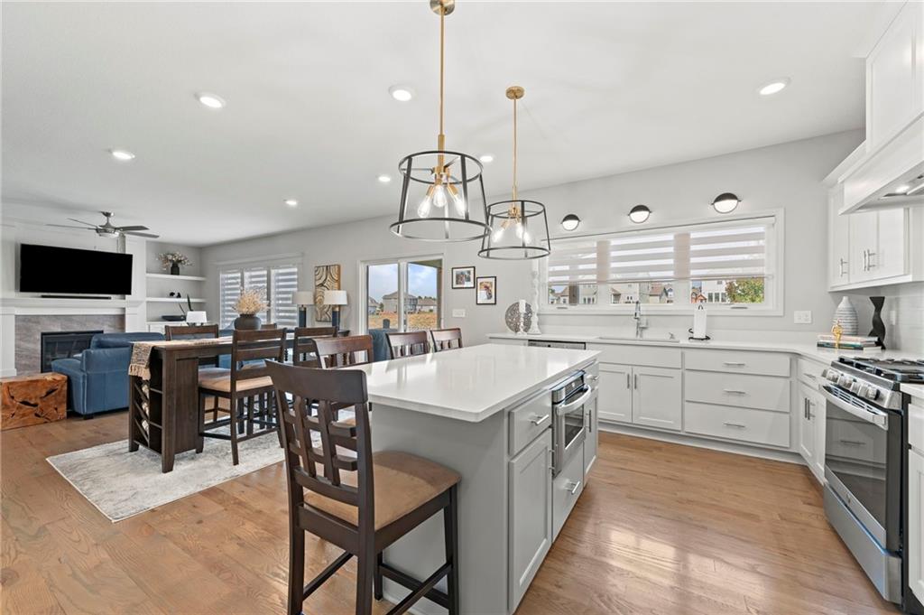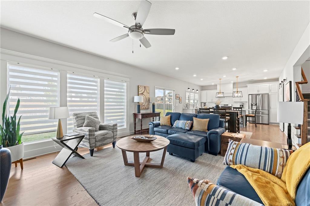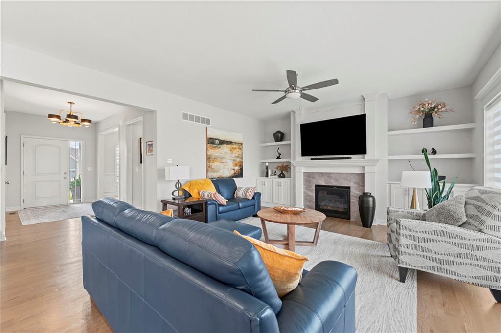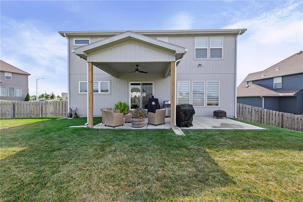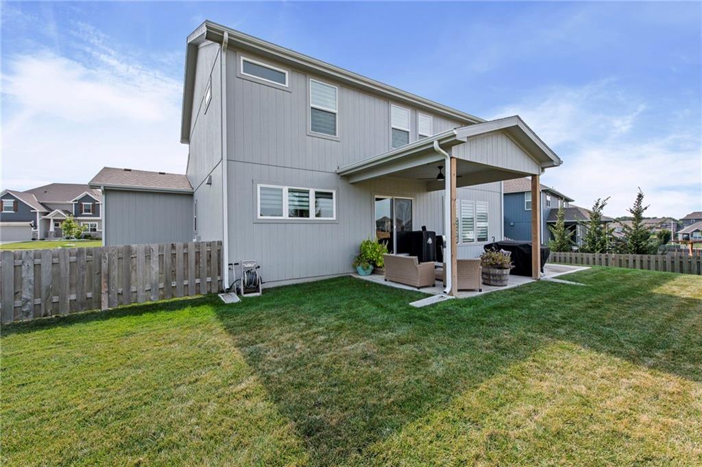 Immaculate 4-Year-Old Home in Tiffany Woods at Rose Creek – The Sycamore by Hearthside Homes. Welcome to this beautifully maintained 5-bedroom, 3.5-bathroom home offering over 3,000 sq. ft. of thoughtfully designed living space. Step inside and be greeted by gorgeous hardwood floors throughout the main level and an abundance of natural light flowing into the spacious living room, complete with a gas fireplace and custom built-in shelving. Zebra shade window coverings add a touch of modern elegance to every window. The kitchen features quartz countertops, stainless steel appliances, a gas range, walk-in pantry, and painted cabinetry—perfect for both daily living and entertaining. A flexible front room can serve as a formal dining area or home office. Retreat to the primary suite, featuring a spa-like en-suite with a custom tiled shower, frameless glass, a fabulous soaking tub, and large walk-in closet. Upstairs features the primary suite plus three spacious bedrooms, each with a walk-in closet, and a full bath designed for comfort and convenience. The finished basement offers a second living area, additional custom built-ins, a fifth bedroom, full bathroom, and plenty of storage space. Step outside to your covered patio, ideal for hosting or relaxing, with a fenced-in backyard that backs to greenspace—a rare and peaceful find. The 3-car garage includes bonus cabinet storage and a full 3-car driveway. All located in a prime, convenient location close to shopping, schools, and major highways.