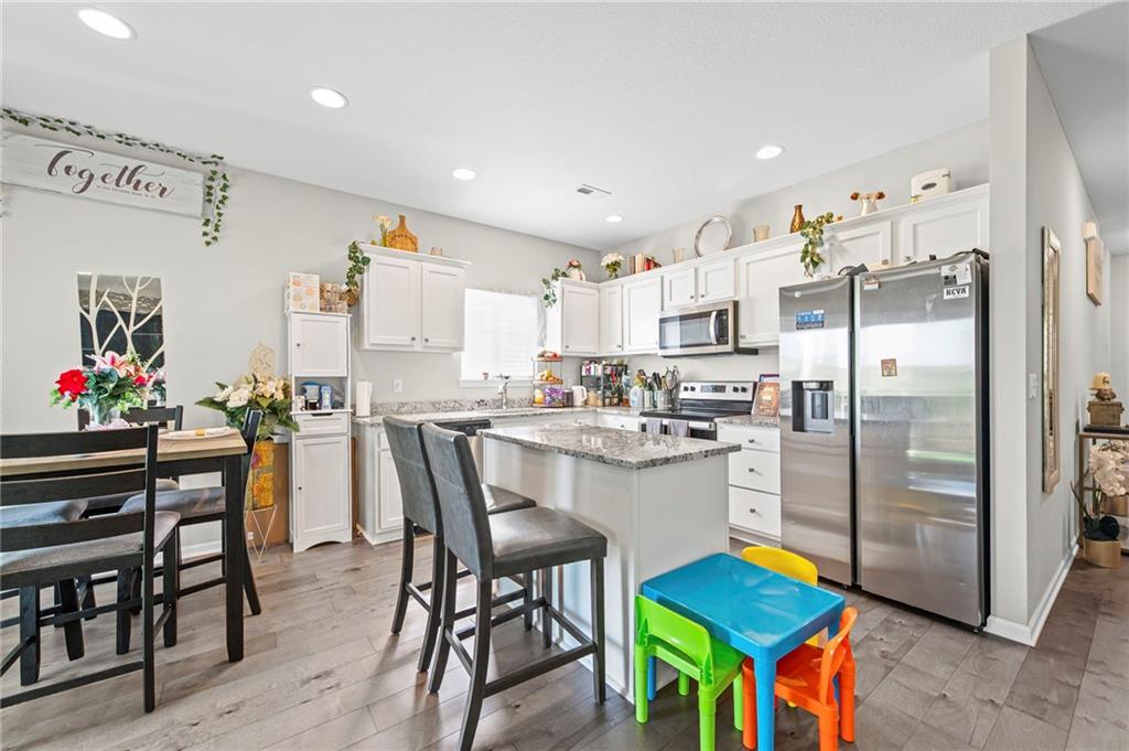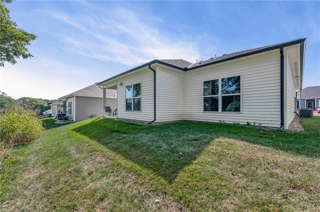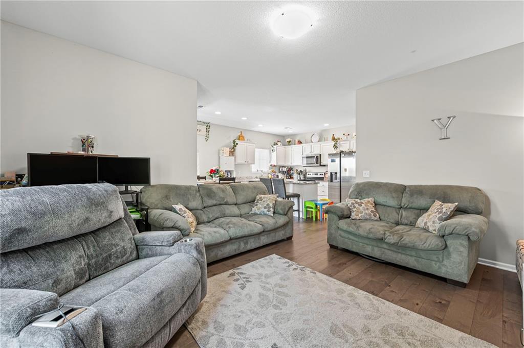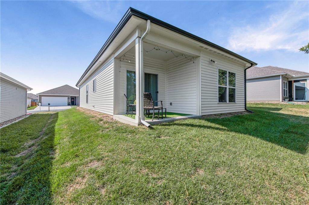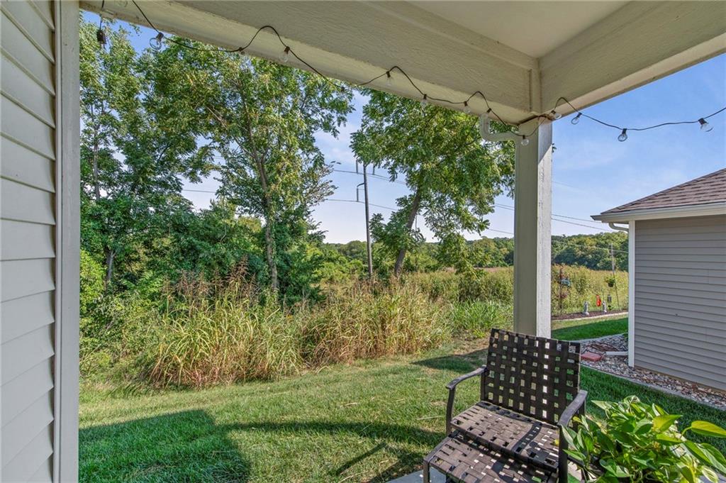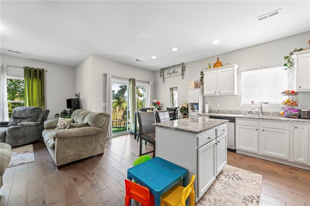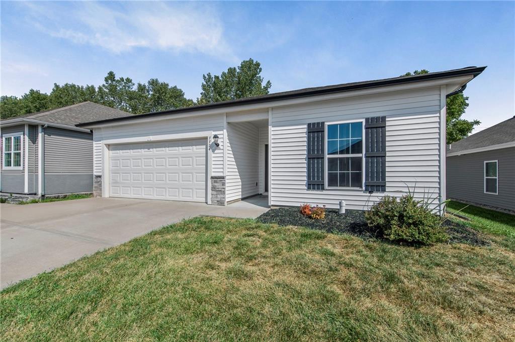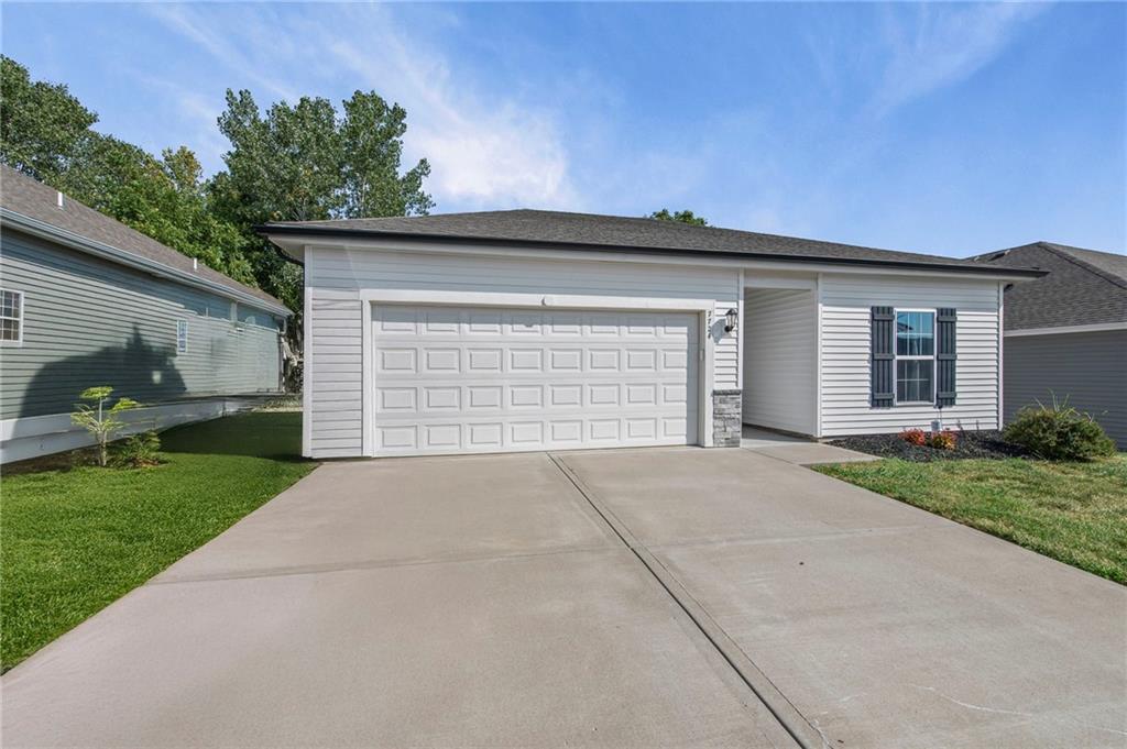 Market price adjustment!!! Welcome home to a growing community with extensive amenities with a LIKE-NEW feel! Marvel at the open space concept with beautiful wood floors. Enjoy relaxing or entertaining in the skillfully designed open space that features a beautiful white marbled-topped breakfast island, a dining area that looks out onto greenspace through the covered patio. This home boasts 3 bedrooms and 2 full-size baths with a generously sized primary bedroom that includes ensuite bath featuring a double vanity and a large walk-in closet. Located with quick access to shopping, dining, and KCI Airport. This 4year old home has been wll maintained with regular pest control services and is ready for you to move in and enjoy! Don't forget to drive around the neighborhood and check out the amenities like the playground and clubhouse.