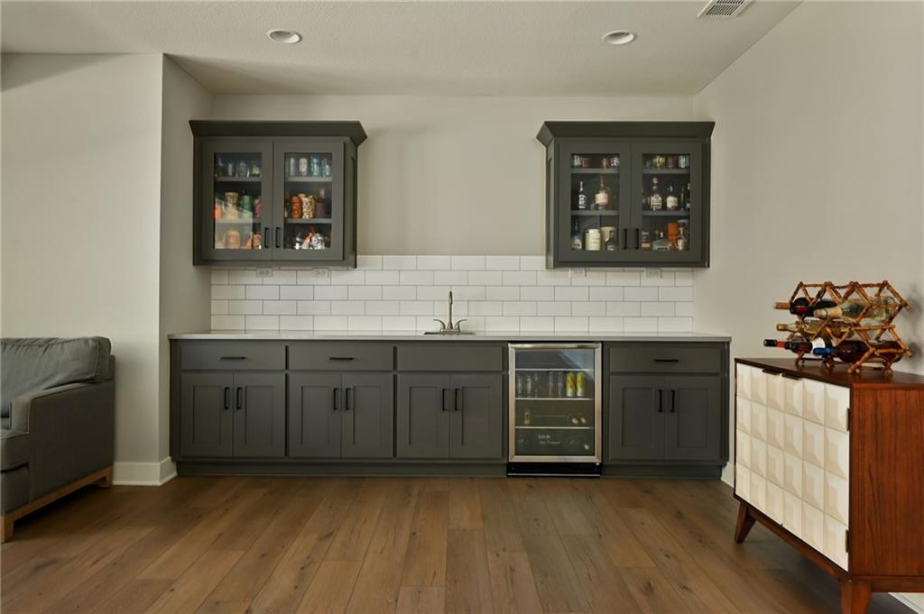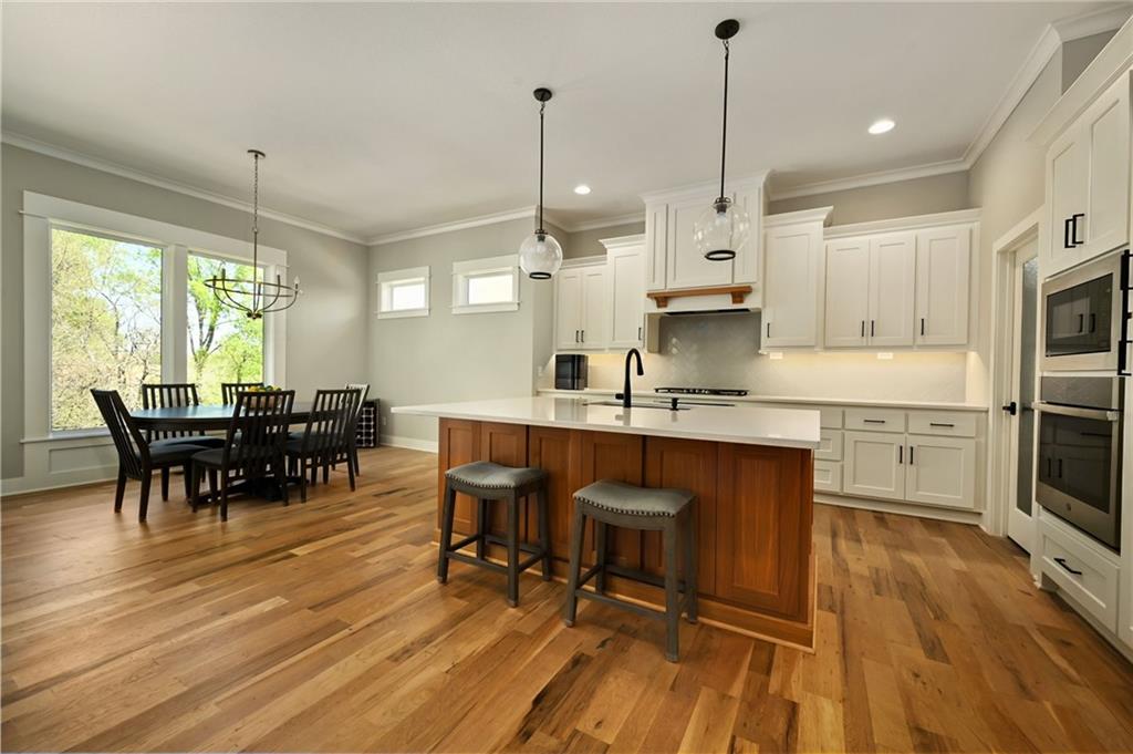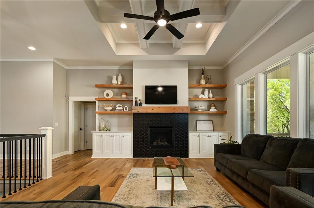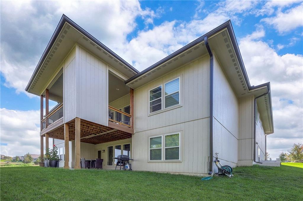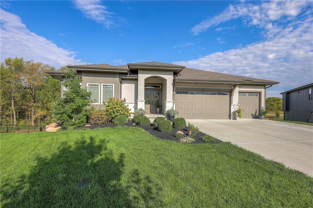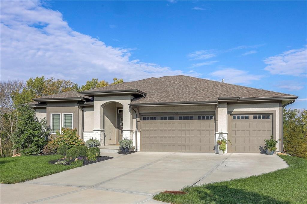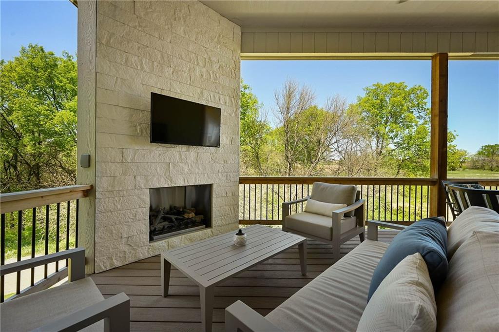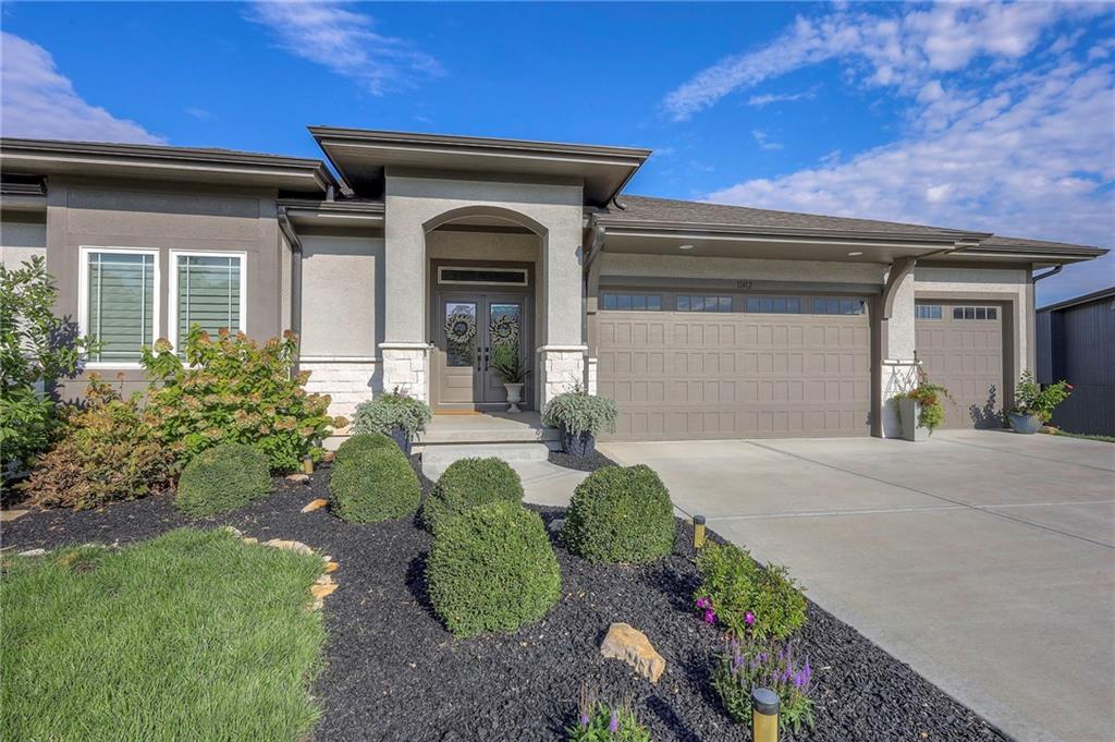 Covington Creek Retreat – Modern Comfort Surrounded by Nature Welcome to a home that beautifully blends modern luxury with everyday comfort. Nestled against a protected green space in one of Olathe’s most desirable neighborhoods, this 2022 reverse 1.5-story was thoughtfully designed for both effortless living and unforgettable entertaining. Step through double glass doors into a bright, open main level with soaring 14-foot ceilings and upgraded Loba hardwood floors throughout. The Great Room’s coffered ceiling, tiled fireplace, and Alderwood mantle create a warm centerpiece, while a wall of north-facing windows fills the space with natural light and peaceful green views. The kitchen is a true gathering spot—featuring white Quartz countertops, a large storage island, 5-burner gas range, double ovens, and a spacious walk-in pantry. The adjacent dining area opens to a covered TREX deck with its own fireplace, perfect for cozy evenings or weekend get-togethers. The main-floor primary suite offers a private retreat with hardwood floors, plantation shutters, and a spa-style bath complete with dual Quartz vanities, a tiled walk-in shower, and a generous closet. A guest bedroom, full bath, and laundry with sink complete the main level. Downstairs, the walk-out lower level offers two additional bedrooms, a full bath, and a large rec room with wet bar—ideal for movie nights or hosting friends. Upgraded LVP flooring adds durability, while a covered patio and landscaped yard provide a serene outdoor escape. With its 3-car garage, sprinkler system, Google Fiber, and access to the neighborhood pool and playground, this Covington Creek home combines thoughtful design, modern features, and a sense of warmth that makes it truly special.