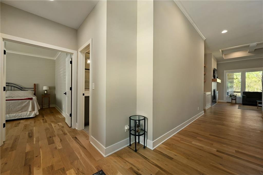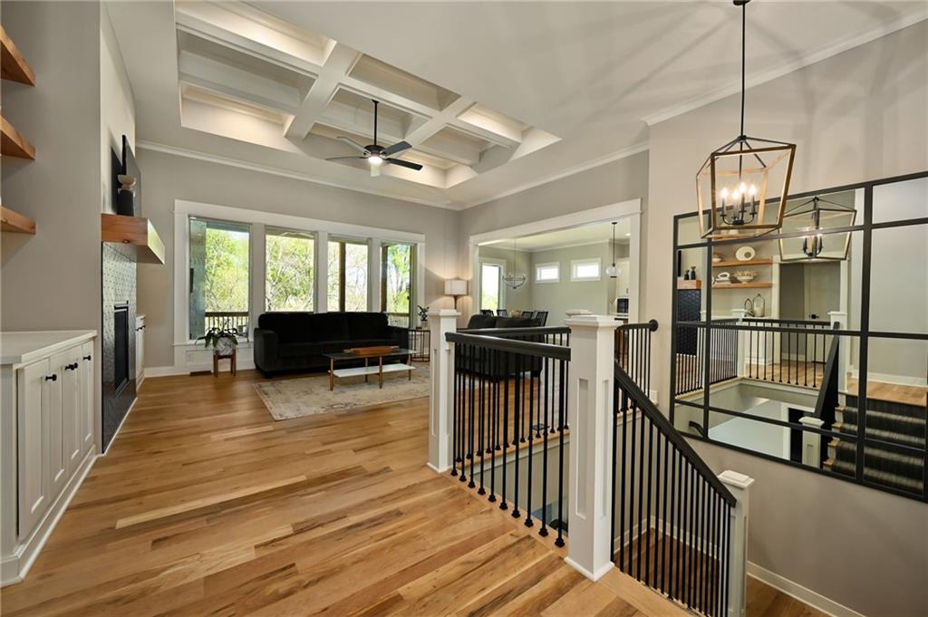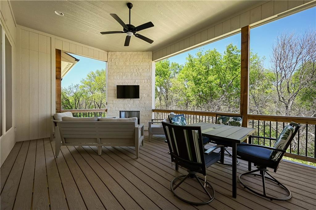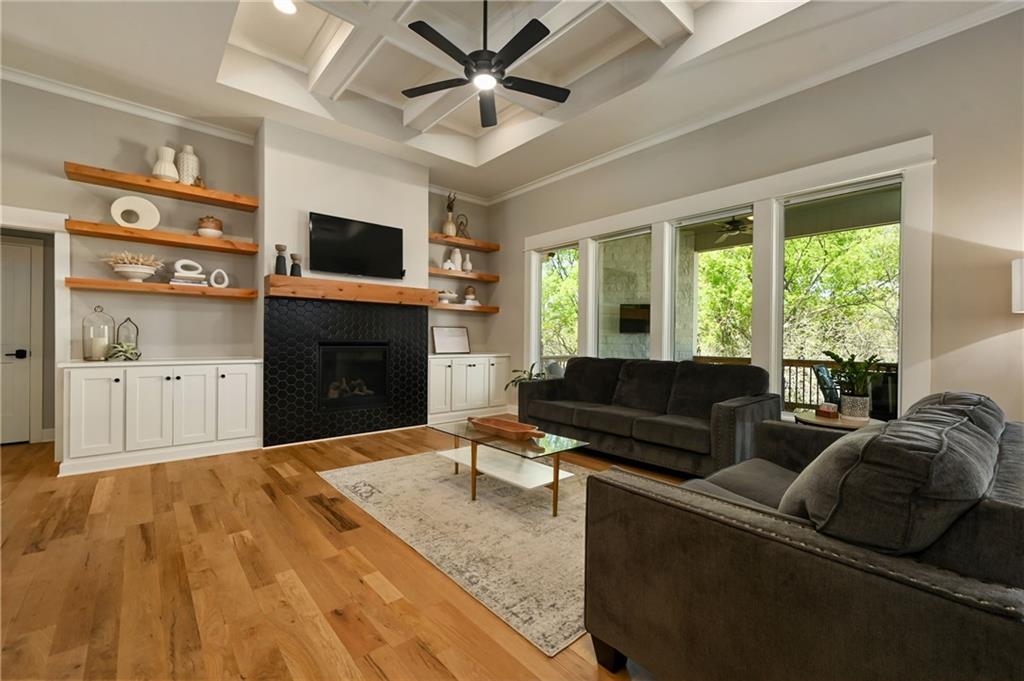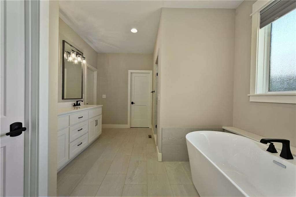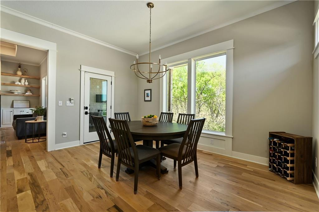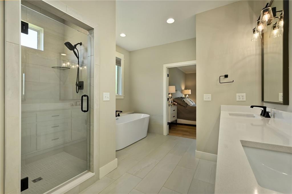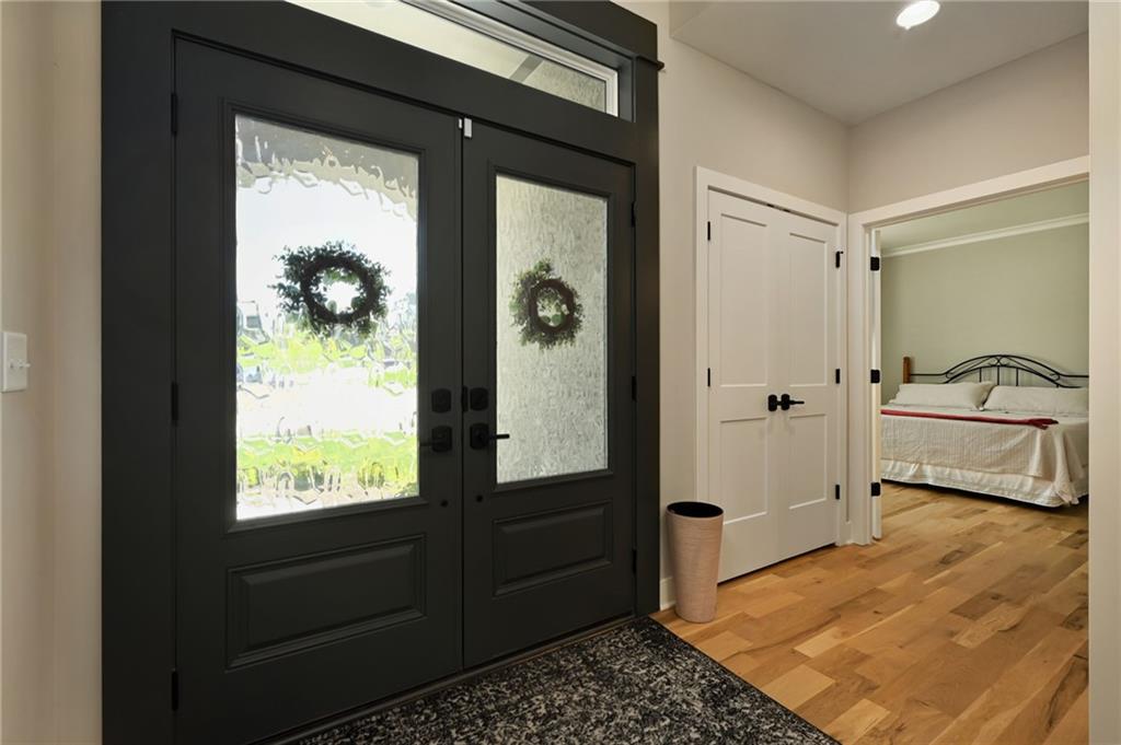 Covington Creek Retreat – Modern Comfort Surrounded by Nature Welcome to a home that beautifully blends modern luxury with everyday comfort. Nestled against a protected green space in one of Olathe’s most desirable neighborhoods, this 2022 reverse 1.5-story was thoughtfully designed for both effortless living and unforgettable entertaining. Step through double glass doors into a bright, open main level with soaring 14-foot ceilings and upgraded Loba hardwood floors throughout. The Great Room’s coffered ceiling, tiled fireplace, and Alderwood mantle create a warm centerpiece, while a wall of north-facing windows fills the space with natural light and peaceful green views. The kitchen is a true gathering spot—featuring white Quartz countertops, a large storage island, 5-burner gas range, double ovens, and a spacious walk-in pantry. The adjacent dining area opens to a covered TREX deck with its own fireplace, perfect for cozy evenings or weekend get-togethers. The main-floor primary suite offers a private retreat with hardwood floors, plantation shutters, and a spa-style bath complete with dual Quartz vanities, a tiled walk-in shower, and a generous closet. A guest bedroom, full bath, and laundry with sink complete the main level. Downstairs, the walk-out lower level offers two additional bedrooms, a full bath, and a large rec room with wet bar—ideal for movie nights or hosting friends. Upgraded LVP flooring adds durability, while a covered patio and landscaped yard provide a serene outdoor escape. With its 3-car garage, sprinkler system, Google Fiber, and access to the neighborhood pool and playground, this Covington Creek home combines thoughtful design, modern features, and a sense of warmth that makes it truly special.
