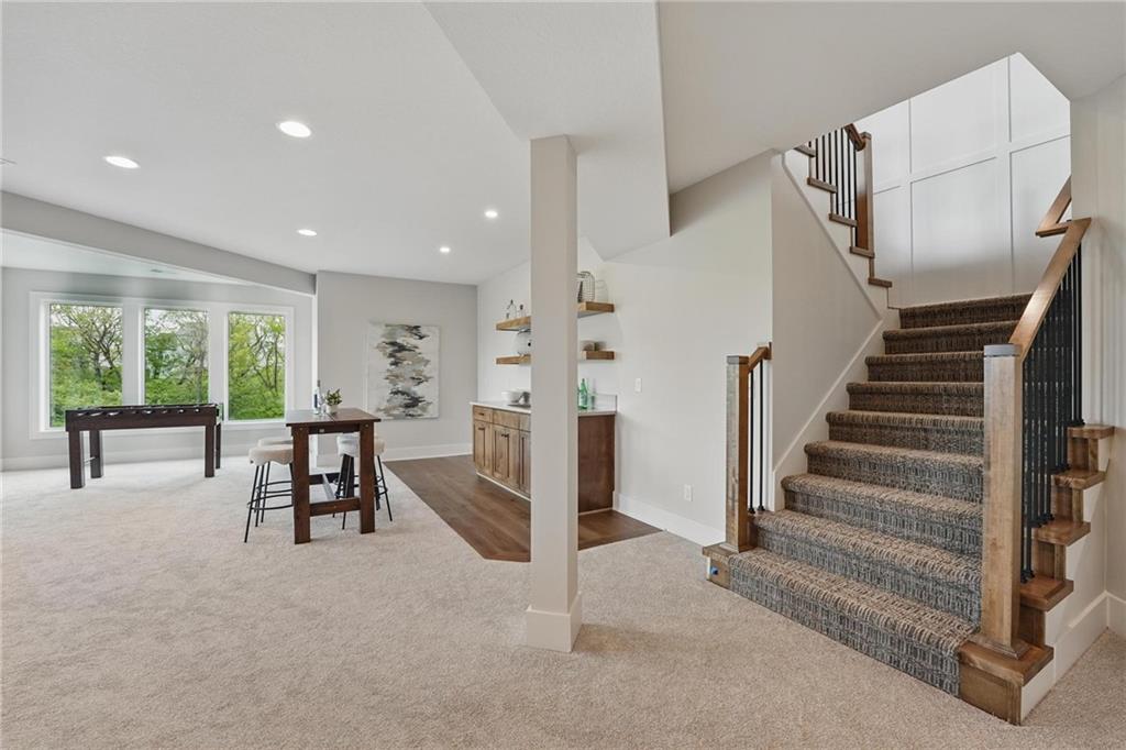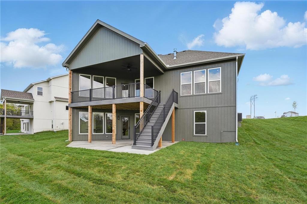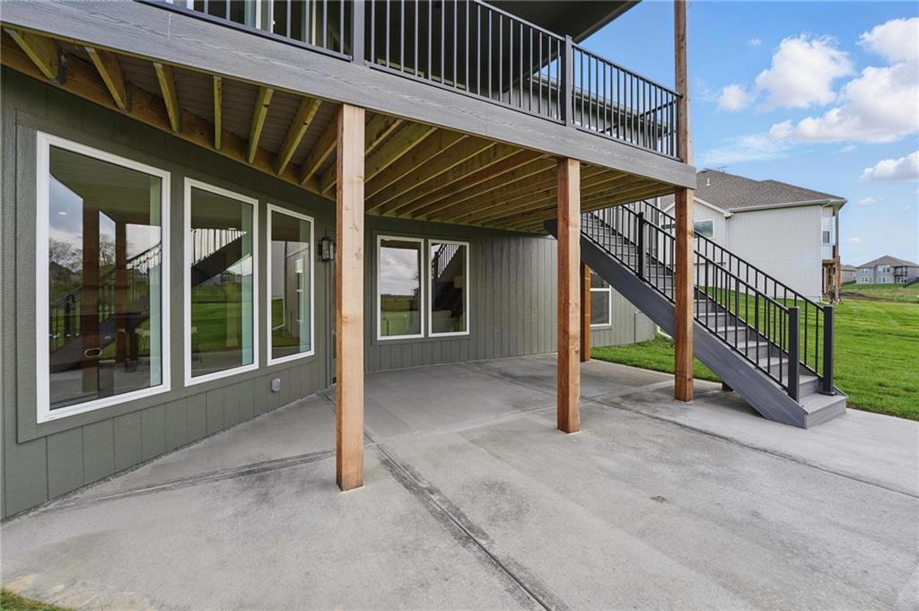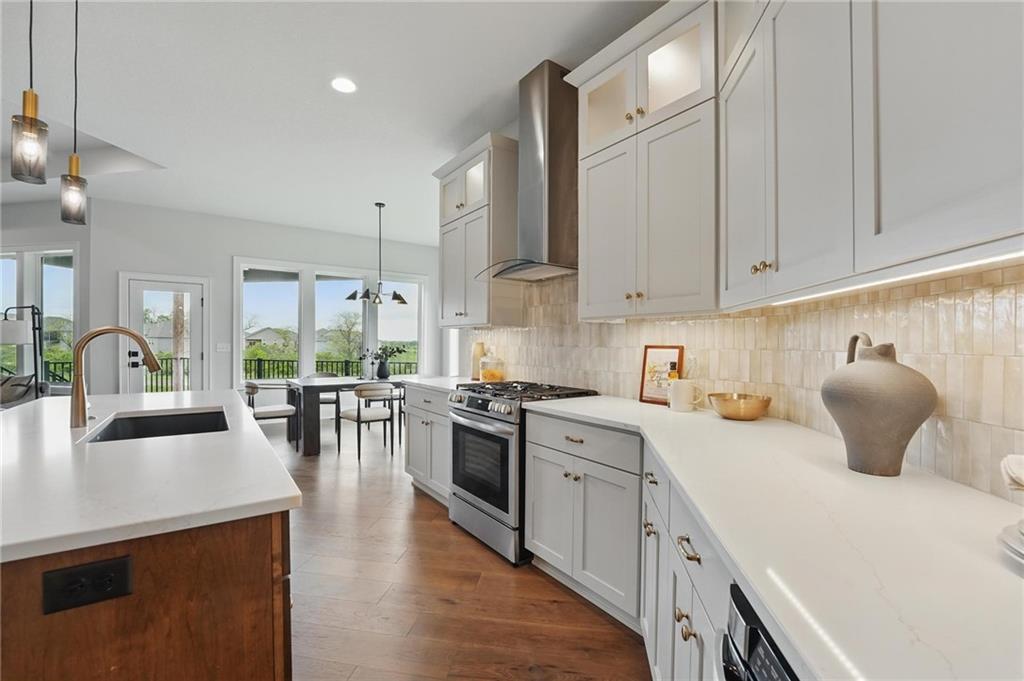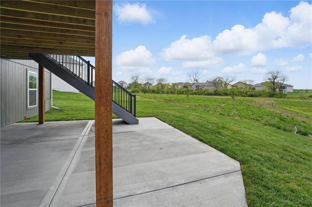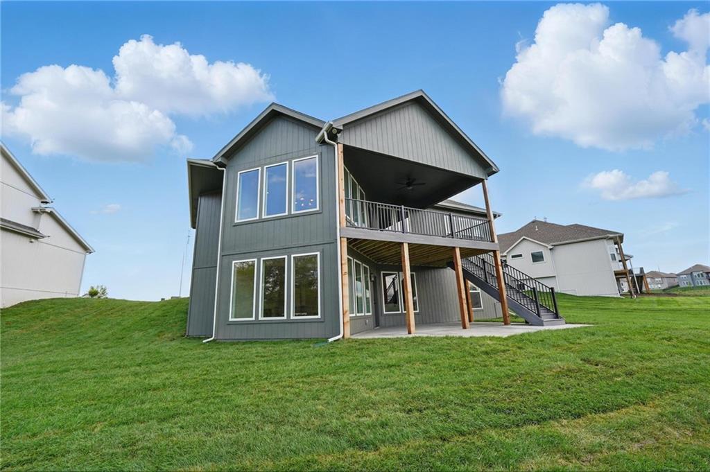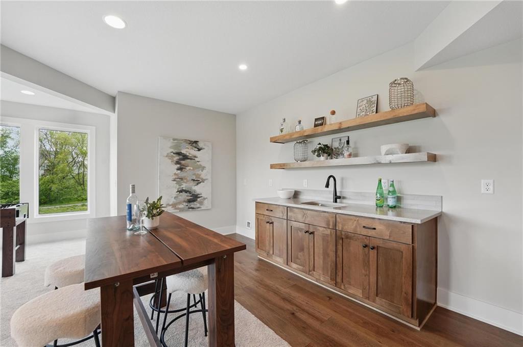 Model Home For Sale! Stunning Aspen Homes "Cypress" Reverse 1.5 Story, beautifully positioned on a walkout lot that backs to serene trees, offering both privacy and nature-filled views. This meticulously crafted home is nearing completion and promises a blend of modern design & luxurious finishes throughout. The kitchen is a chef’s dream, featuring sleek quartz countertops, custom-built cabinetry with glass uppers, a generous walk-in pantry, & a gas stove – perfect for both everyday meals & entertaining. The open floor plan flows effortlessly into the great room, where you'll find built-ins surrounding a striking floor-to-ceiling tile fireplace, creating a warm and inviting focal point. The primary suite is a true retreat, offering an elegant accent wall, walk in closet, spacious double vanity & quartz counters. Relax in the free standing soaker tub, surrounded by trendy tile, or enjoy the zero-entry shower with rain showerhead. On the main level, you'll find a secondary bedroom with hardwood floors that can also be used as a stylish office space. The angled breakfast room offers beautiful views of the treed lot, providing the perfect spot to enjoy a meal or your morning coffee. The finished lower level extends the living space with two additional bedrooms, a wet bar, and an abundance of windows that bring in natural light, creating a bright and airy atmosphere. Designed with energy efficiency in mind, this home boasts a Certified Energy Rating of 46. Enjoy the benefits of Energy Star windows and appliances, blown-in insulation, a tankless water heater, and an energy-efficient HVAC system with a self-balancing ERV energy recovery ventilator and Aeroseal duct sealing to maximize comfort and reduce energy costs. Located within the award-winning North Kansas City School District in the Staley High attendance area. The Hunt Midwest Community offers a completed swimming pool and walking trails. Furniture not included. Taxes & SqFt estimated