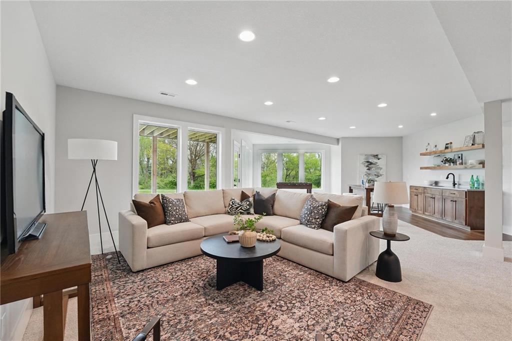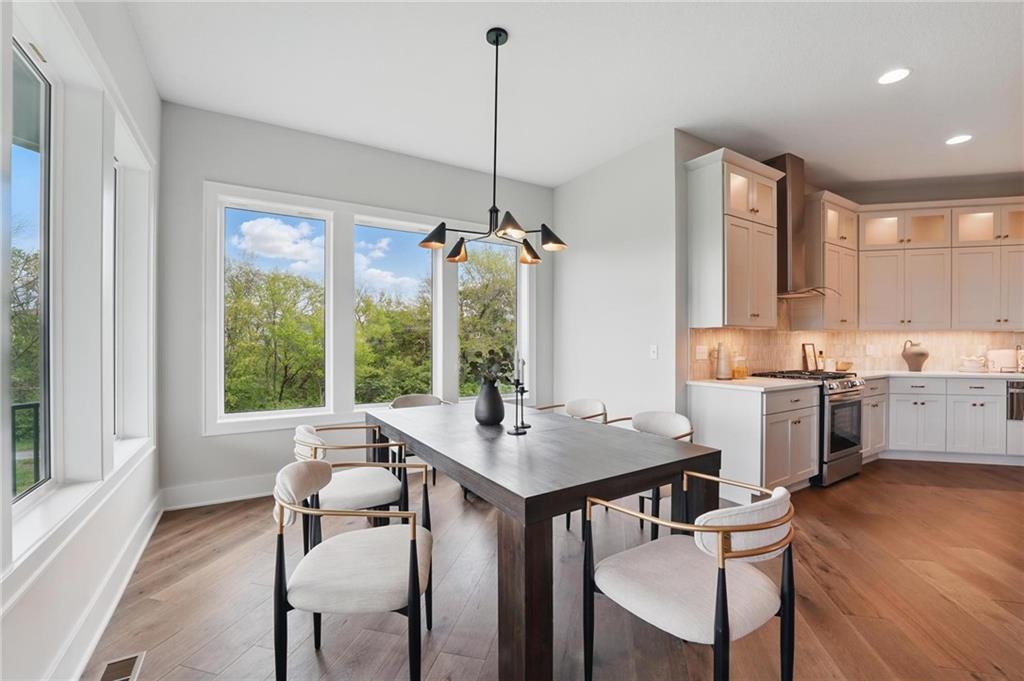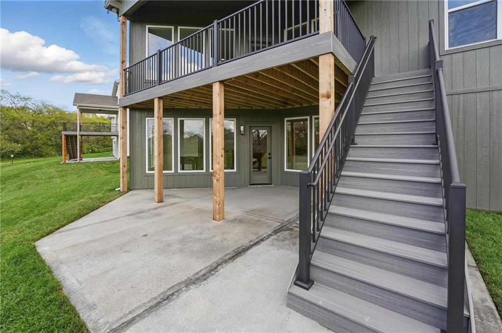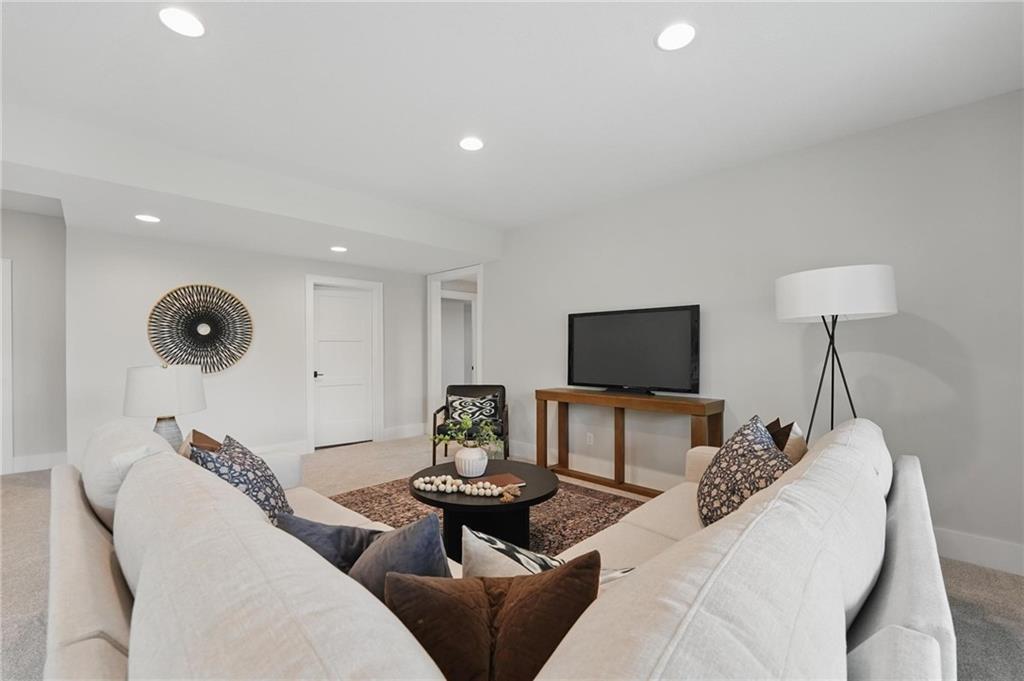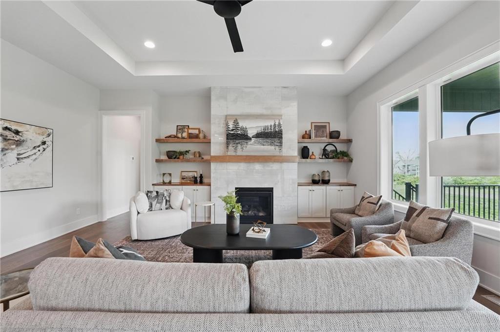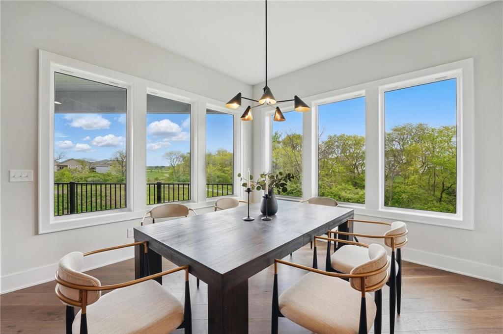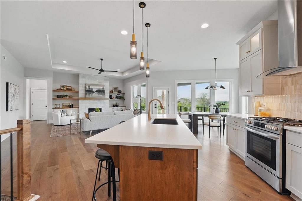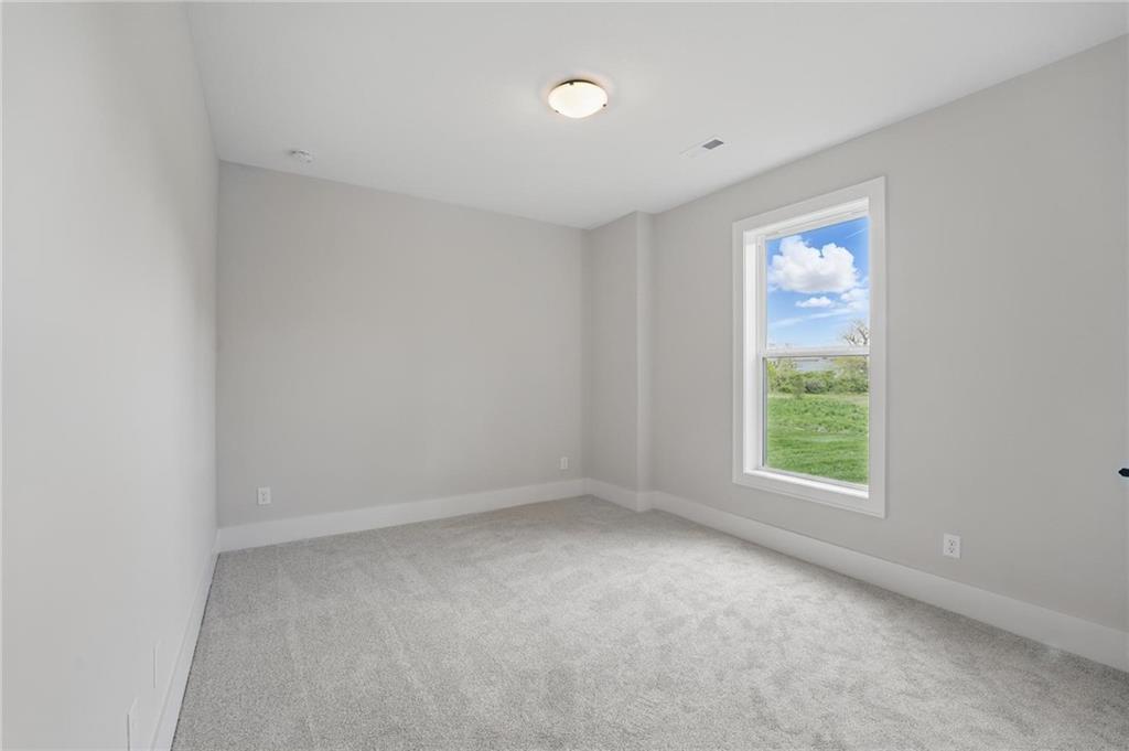 Model Home For Sale! Stunning Aspen Homes "Cypress" Reverse 1.5 Story, beautifully positioned on a walkout lot that backs to serene trees, offering both privacy and nature-filled views. This meticulously crafted home is nearing completion and promises a blend of modern design & luxurious finishes throughout. The kitchen is a chef’s dream, featuring sleek quartz countertops, custom-built cabinetry with glass uppers, a generous walk-in pantry, & a gas stove – perfect for both everyday meals & entertaining. The open floor plan flows effortlessly into the great room, where you'll find built-ins surrounding a striking floor-to-ceiling tile fireplace, creating a warm and inviting focal point. The primary suite is a true retreat, offering an elegant accent wall, walk in closet, spacious double vanity & quartz counters. Relax in the free standing soaker tub, surrounded by trendy tile, or enjoy the zero-entry shower with rain showerhead. On the main level, you'll find a secondary bedroom with hardwood floors that can also be used as a stylish office space. The angled breakfast room offers beautiful views of the treed lot, providing the perfect spot to enjoy a meal or your morning coffee. The finished lower level extends the living space with two additional bedrooms, a wet bar, and an abundance of windows that bring in natural light, creating a bright and airy atmosphere. Designed with energy efficiency in mind, this home boasts a Certified Energy Rating of 46. Enjoy the benefits of Energy Star windows and appliances, blown-in insulation, a tankless water heater, and an energy-efficient HVAC system with a self-balancing ERV energy recovery ventilator and Aeroseal duct sealing to maximize comfort and reduce energy costs. Located within the award-winning North Kansas City School District in the Staley High attendance area. The Hunt Midwest Community offers a completed swimming pool and walking trails. Furniture not included. Taxes & SqFt estimated