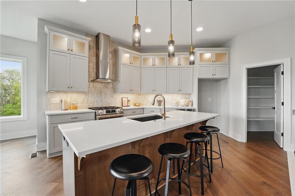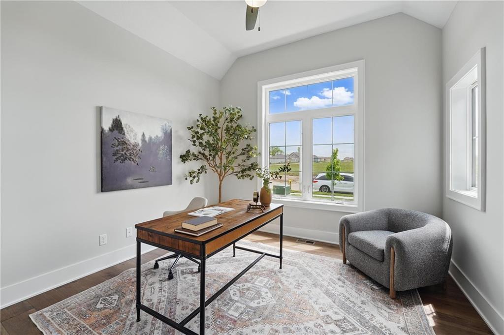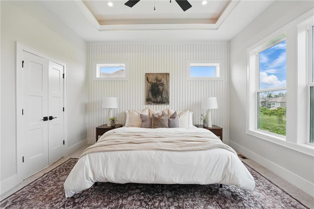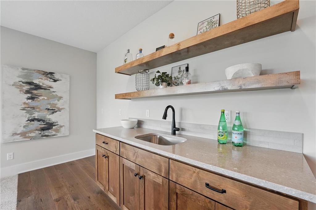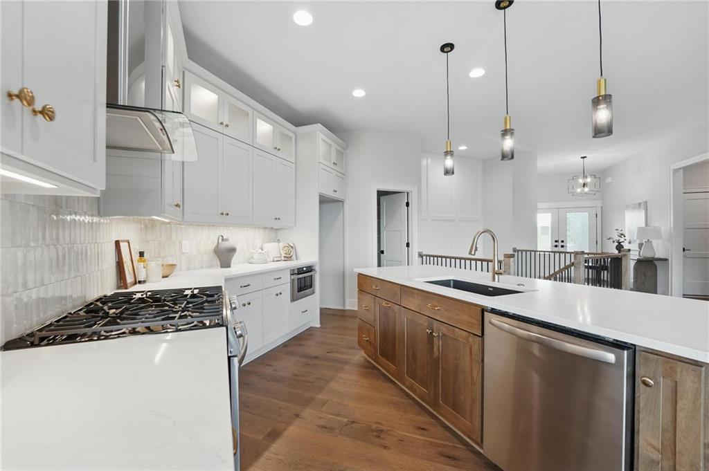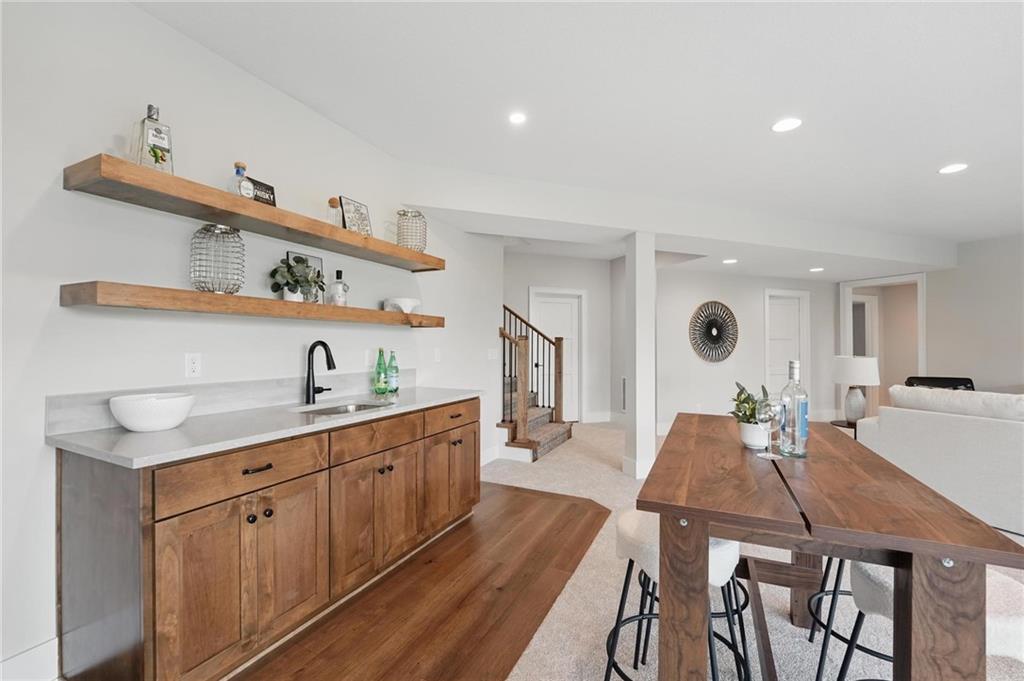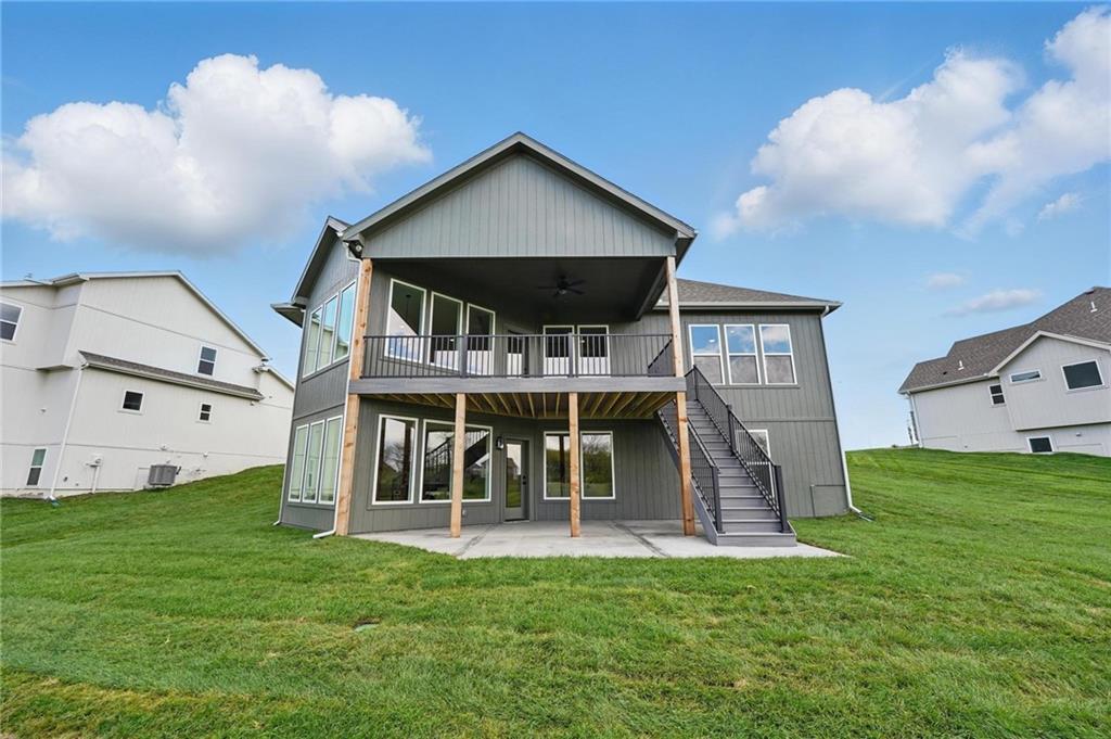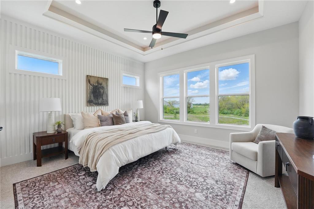 Model Home For Sale! Stunning Aspen Homes "Cypress" Reverse 1.5 Story, beautifully positioned on a walkout lot that backs to serene trees, offering both privacy and nature-filled views. This meticulously crafted home is nearing completion and promises a blend of modern design & luxurious finishes throughout. The kitchen is a chef’s dream, featuring sleek quartz countertops, custom-built cabinetry with glass uppers, a generous walk-in pantry, & a gas stove – perfect for both everyday meals & entertaining. The open floor plan flows effortlessly into the great room, where you'll find built-ins surrounding a striking floor-to-ceiling tile fireplace, creating a warm and inviting focal point. The primary suite is a true retreat, offering an elegant accent wall, walk in closet, spacious double vanity & quartz counters. Relax in the free standing soaker tub, surrounded by trendy tile, or enjoy the zero-entry shower with rain showerhead. On the main level, you'll find a secondary bedroom with hardwood floors that can also be used as a stylish office space. The angled breakfast room offers beautiful views of the treed lot, providing the perfect spot to enjoy a meal or your morning coffee. The finished lower level extends the living space with two additional bedrooms, a wet bar, and an abundance of windows that bring in natural light, creating a bright and airy atmosphere. Designed with energy efficiency in mind, this home boasts a Certified Energy Rating of 46. Enjoy the benefits of Energy Star windows and appliances, blown-in insulation, a tankless water heater, and an energy-efficient HVAC system with a self-balancing ERV energy recovery ventilator and Aeroseal duct sealing to maximize comfort and reduce energy costs. Located within the award-winning North Kansas City School District in the Staley High attendance area. The Hunt Midwest Community offers a completed swimming pool and walking trails. Furniture not included. Taxes & SqFt estimated