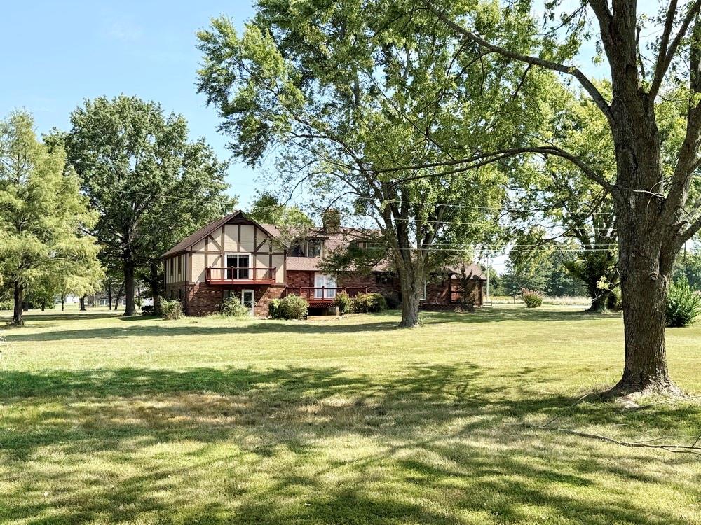 Spacious Tudor-Style Home on 1.6 Acres – Just Outside of Town Need Space---Look no further!!! This 6-bedroom, 3.5-bath Tudor home offers nearly 4,000 sq. ft. of finished living space plus 1,160 sq ft of unfinished basement. The separation of floors provides bigger rooms and better privacy for occupants. The home offers, not 1, not 2, not 3, but FOUR separate living rooms including the large rec room with small kitchenette on the lower level. The kitchen, with appliances included, features an eat-in breakfast space in addition to the formal dining area. These rooms provide the opportunity to spread out and host large gatherings of family or friends. The master suite showcases a high, cathedral ceiling with beams, 2 closets (one walk-in), a private balcony, and ensuite bath. Additional bedrooms are all generously sized, offering comfort and flexibility for guests, hobbies, or work-from-home office space. The full, unfinished, walk-out basement provides great storage & shelter. A 2-car attached garage & paved circle drive make egress and ingress easy and convenient. Set on 1.6 acres along a paved road, the property has a large yard with mature landscaping. It is located just outside of the city limits, allowing the homeowner to enjoy the peace of country-style living while being just minutes from the conveniences of town. While the home is move-in ready, it also offers an opportunity for updates to make it your own. With its size, layout, and location just outside of town, this 1-owner home is full of potential and ready for its next chapter. Call soon to schedule a showing on this unique property.