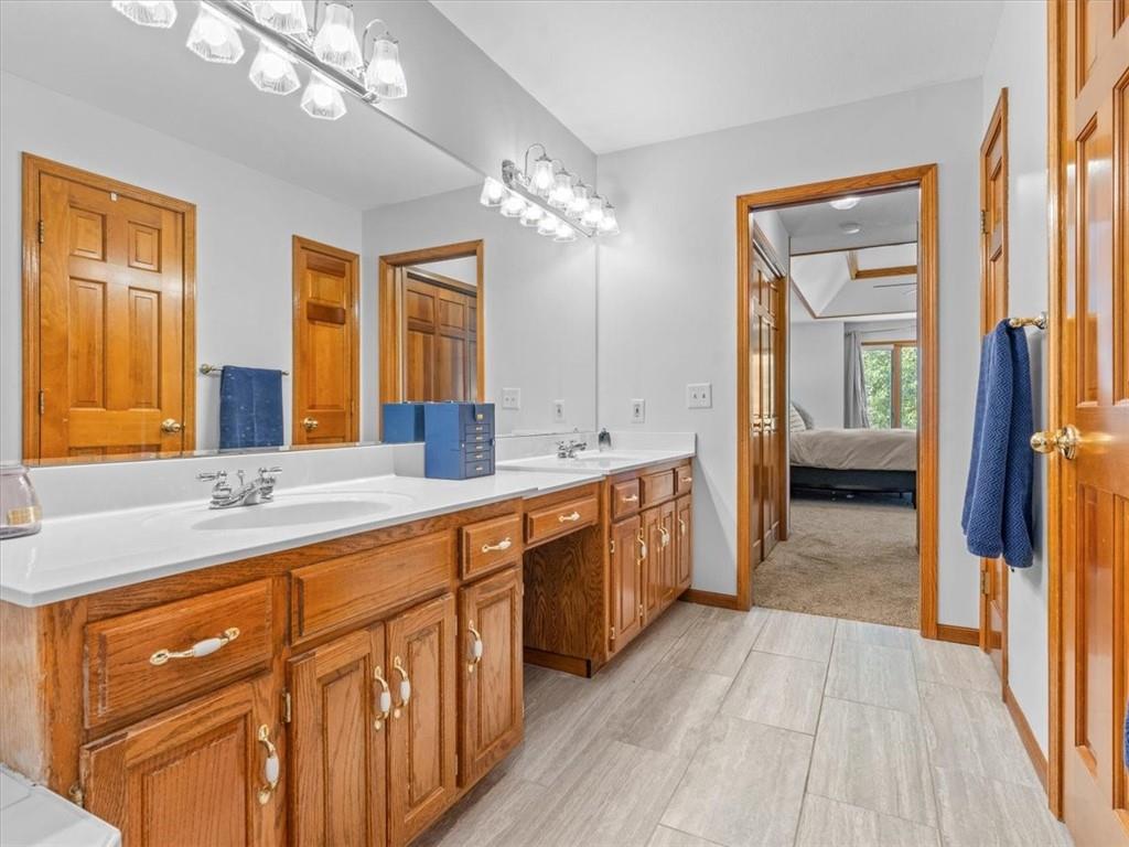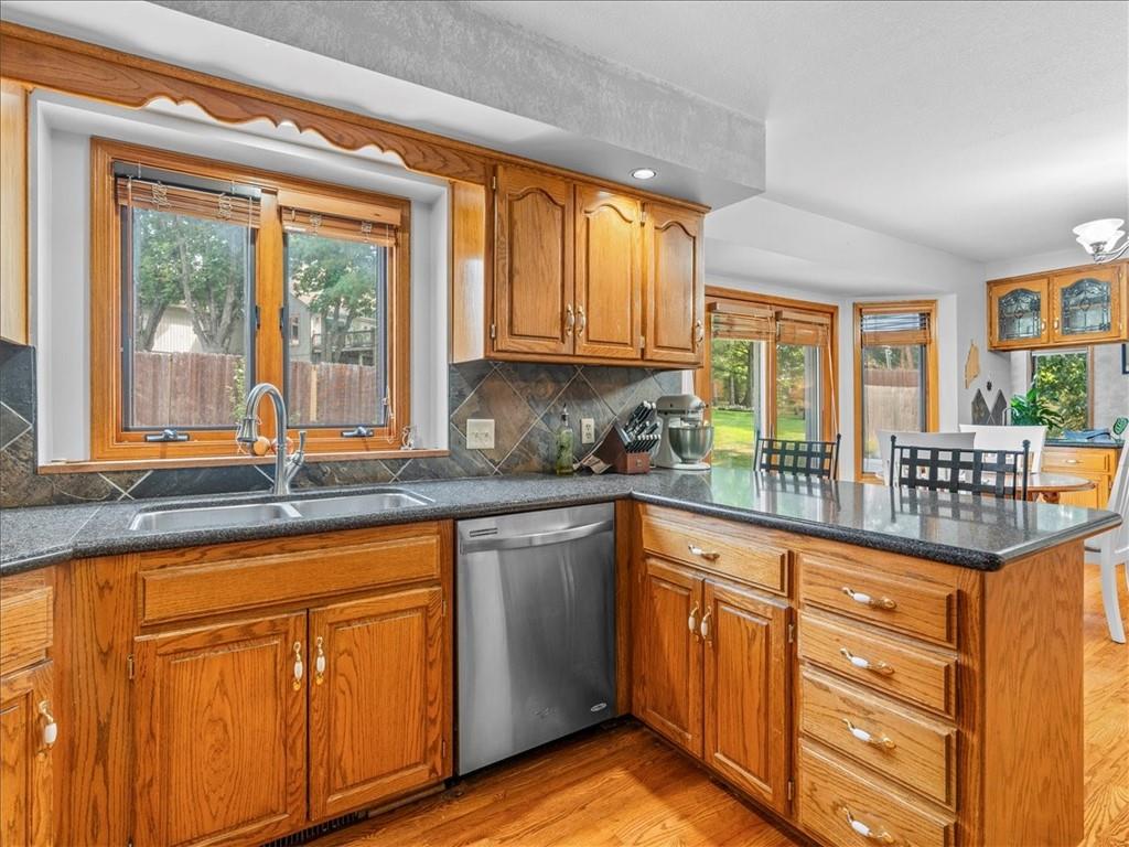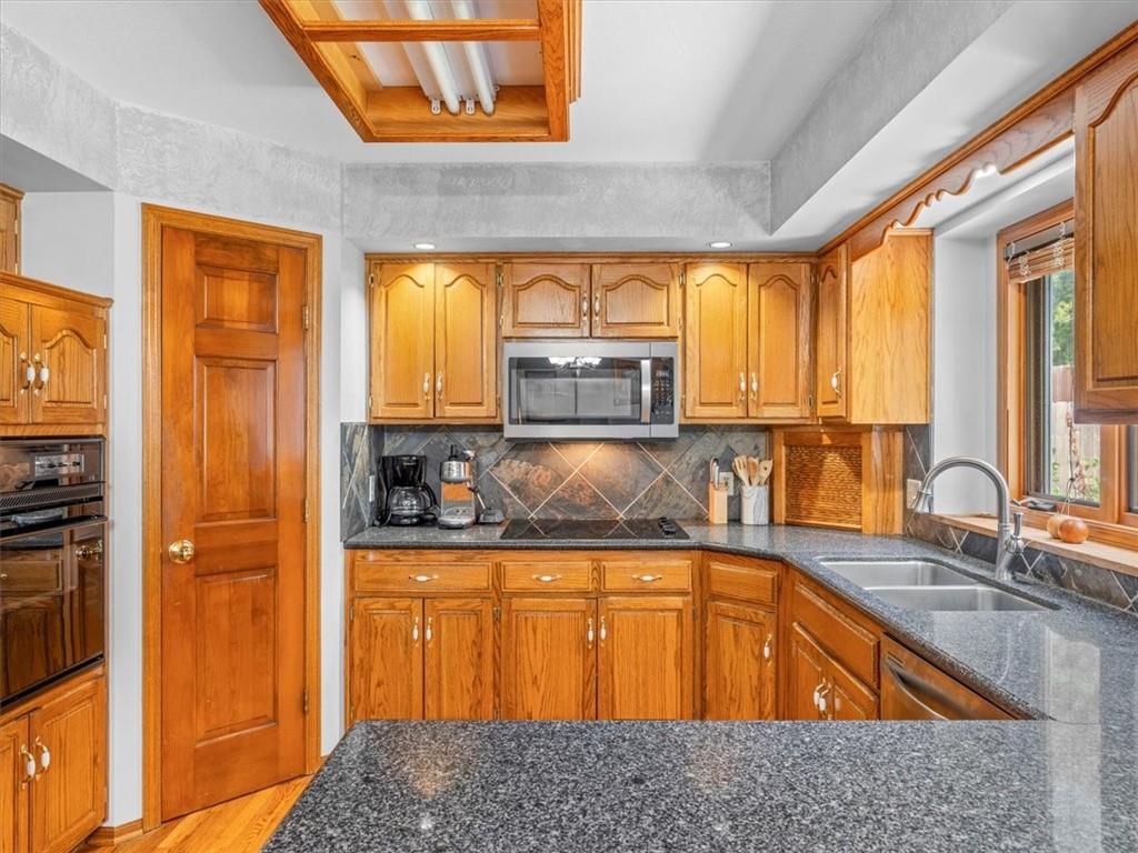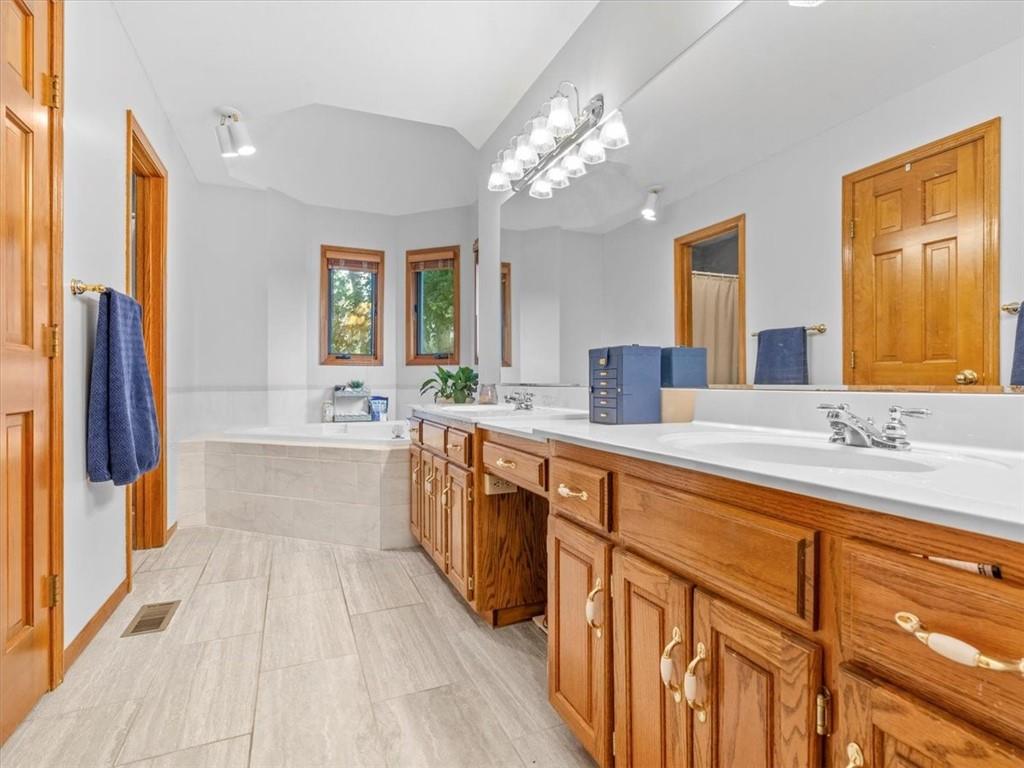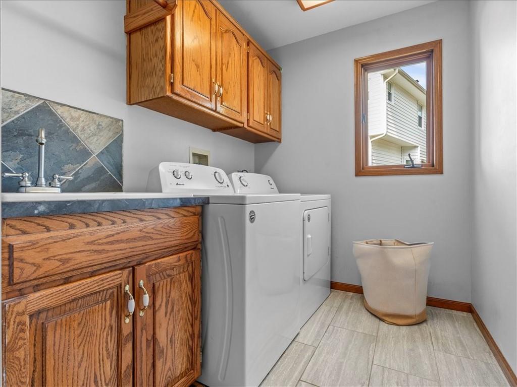 This beautifully maintained 1.5-story home offers an abundance of space and flexibility in a sought after neighborhood. The main floor boasts a warm living room with a brick fireplace, a formal dining room, and a spacious kitchen with a breakfast area. You’ll love the oversized primary suite with a tray ceiling, a spa-like bathroom, plus the convenience of main-floor laundry, a half bath, and a 2 car garage. Upstairs, find three comfortable bedrooms and a full bath, while the finished basement is made for fun - featuring a large rec room, full bath, wet bar, and a non-conforming bedroom or exercise room, along with plenty of storage. A brand new roof, security system, and all electric living finish off the amazing features of this home. With multiple living areas and thoughtful details throughout, this home is perfect for both entertaining and everyday living.